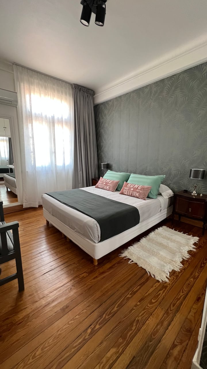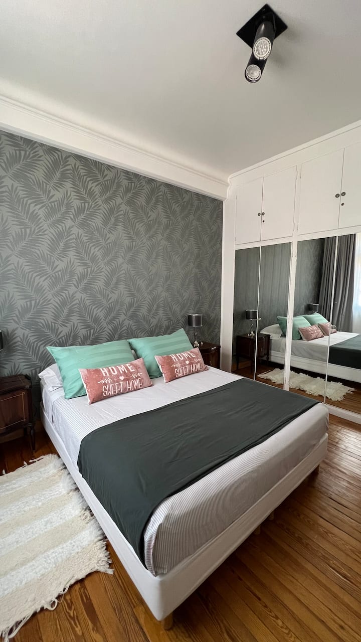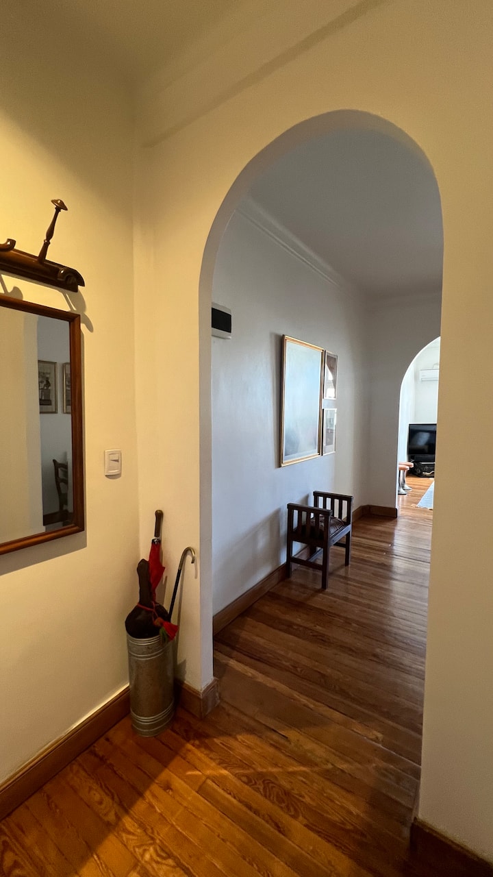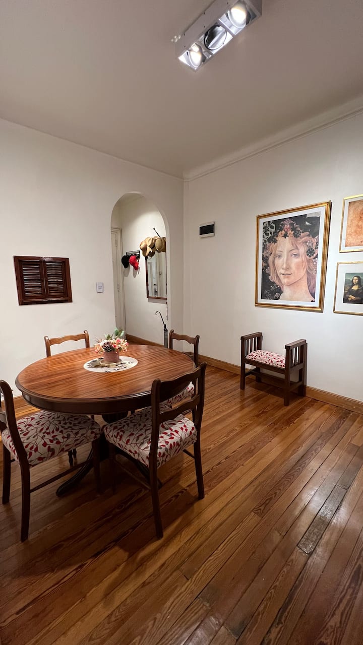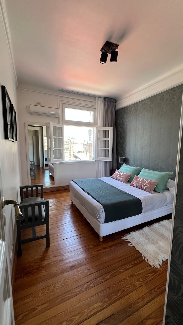 Apartamento em edifício de estilo clássico em Retiro, com iluminação natural. Conta com 2 unidades de ar-condicionado (quente/frio), piso de madeira e pé-direito alto. O imóvel inclui internet de alta velocidade e TV Smart de 55”, além de cama queen (1,60 x 2,00 m) e armário com portas de espelho. Localizado nas ruas San Martín e Paraguay, a 2 quadras da Plaza San Martín; há estacionamento pago em frente. Roupas de cama e toalhas estão incluídas, com possibilidade de extras caso um terceiro hósp