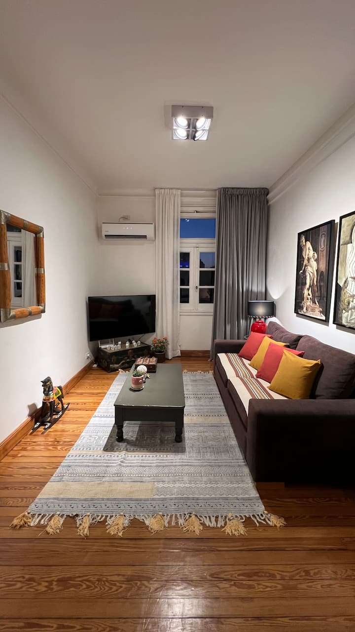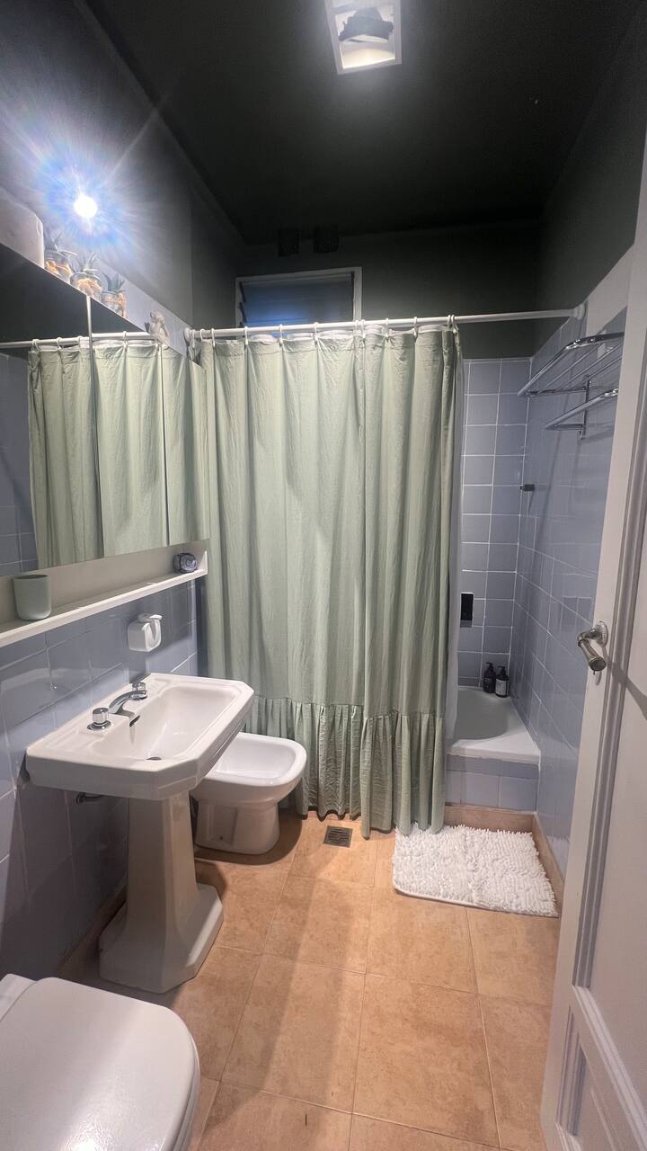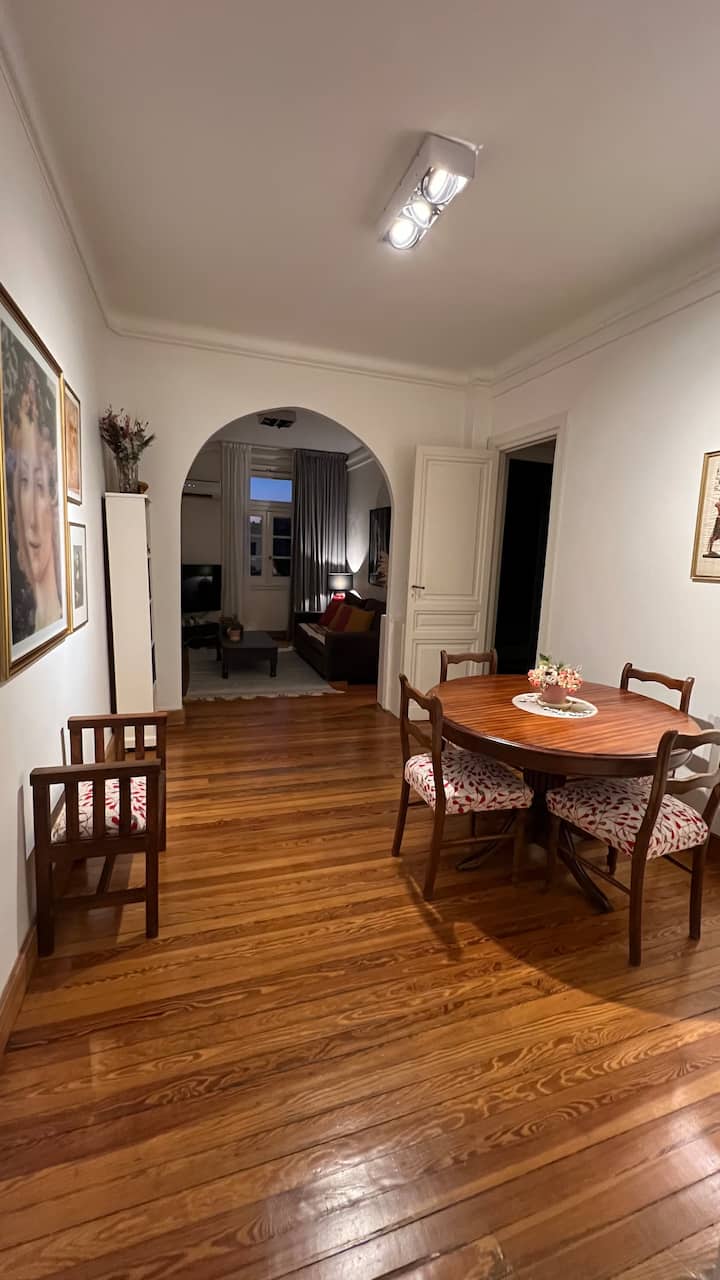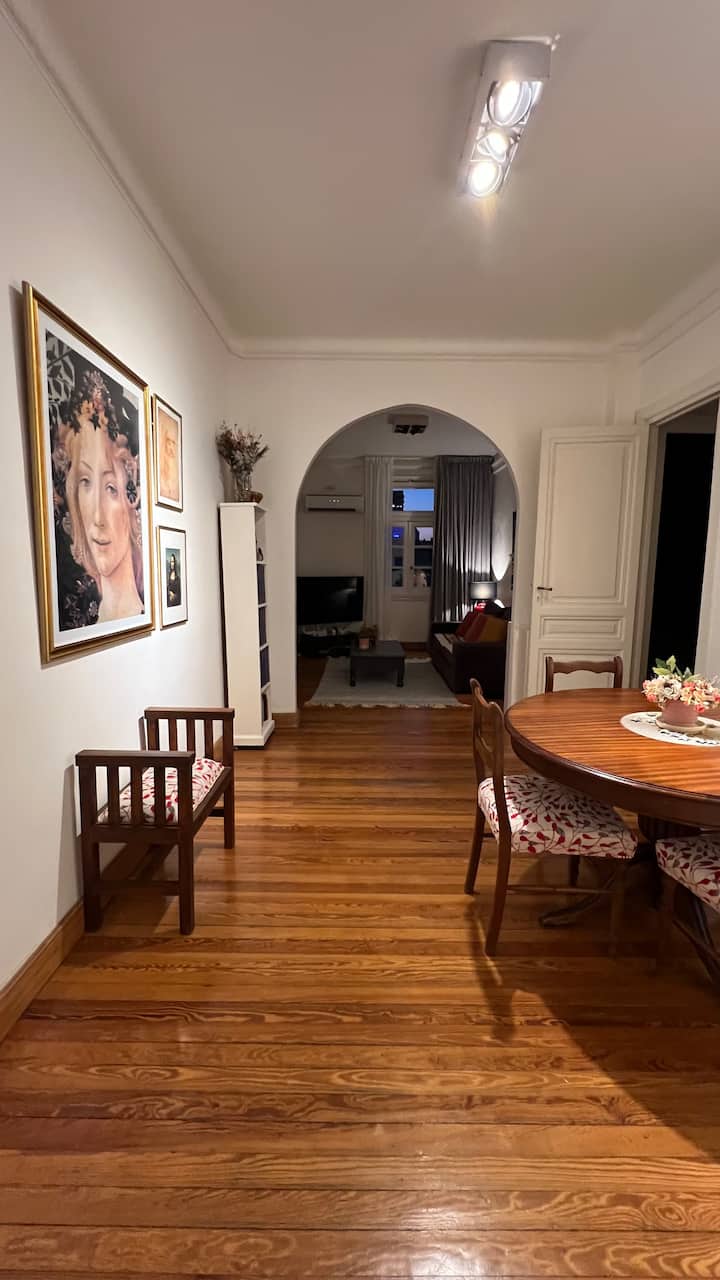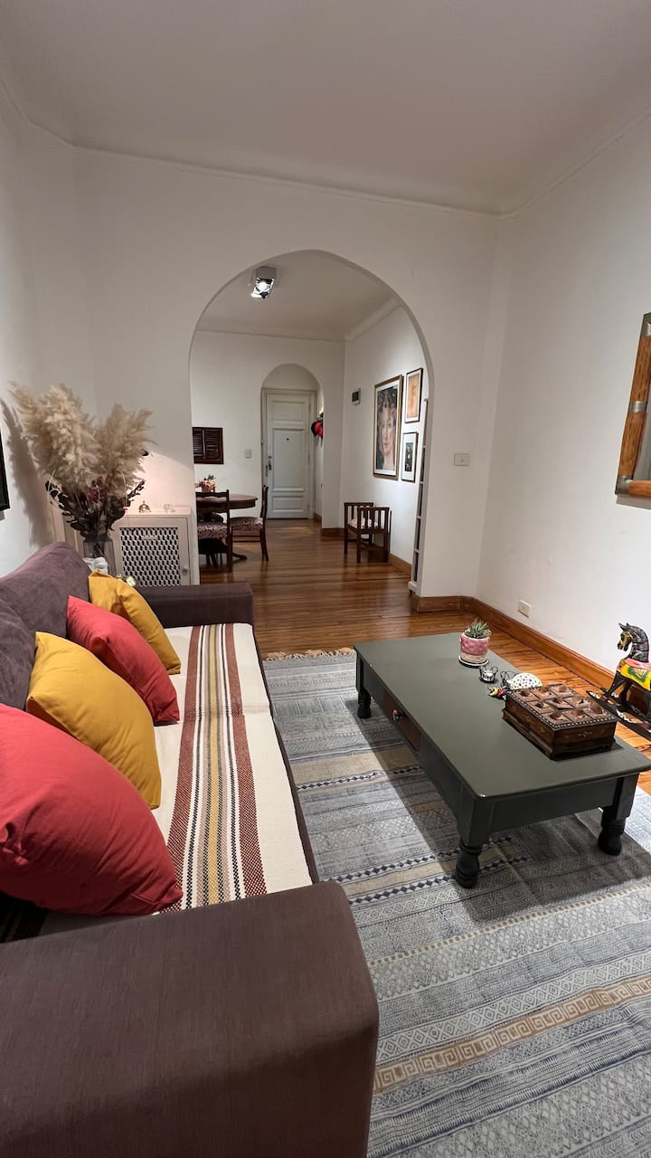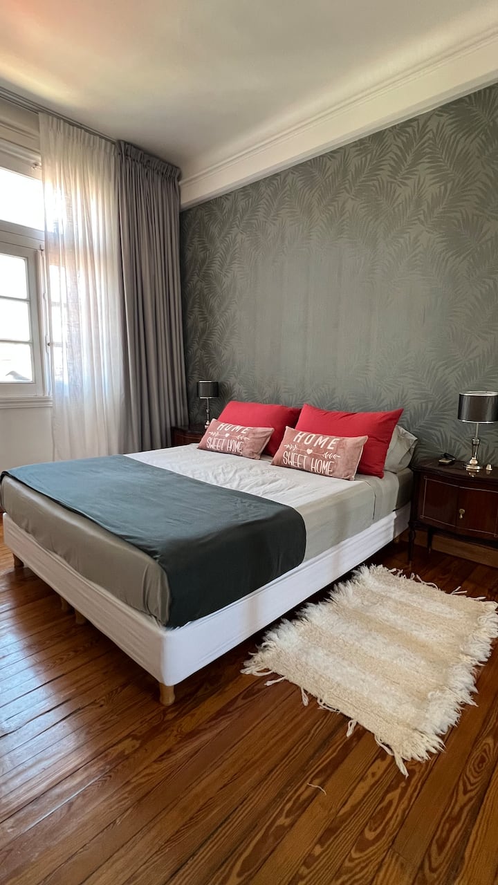 Apartamento em edifício de estilo clássico em Retiro, com iluminação natural. Conta com 2 unidades de ar-condicionado (quente/frio), piso de madeira e pé-direito alto. O imóvel inclui internet de alta velocidade e TV Smart de 55”, além de cama queen (1,60 x 2,00 m) e armário com portas de espelho. Localizado nas ruas San Martín e Paraguay, a 2 quadras da Plaza San Martín; há estacionamento pago em frente. Roupas de cama e toalhas estão incluídas, com possibilidade de extras caso um terceiro hósp