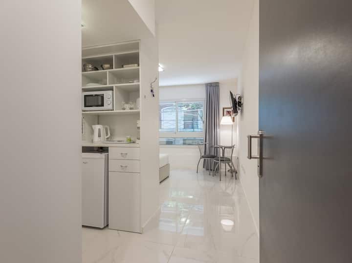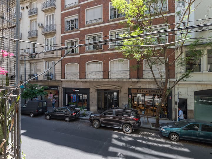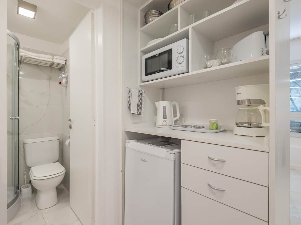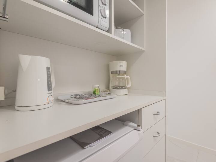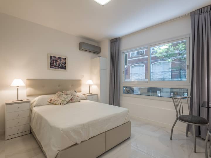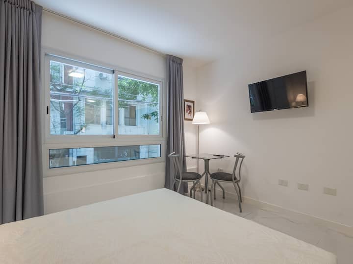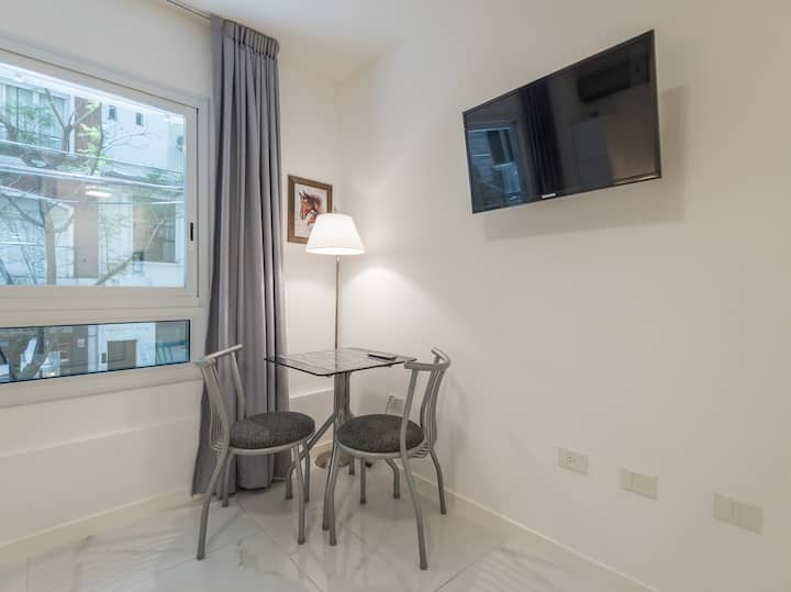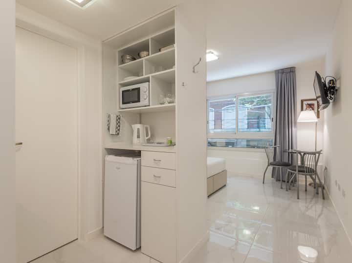 Kitnet mobiliada para aluguel temporário em Retiro, equipada para 2 pessoas. Conta com cama de casal, mesa com cadeiras, armário grande, cozinha com geladeira e forno elétrico, e banheiro com box. Inclui proximidade de Patio Bullrich, Av. Alvear e Calle Quintana.