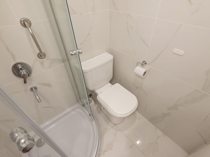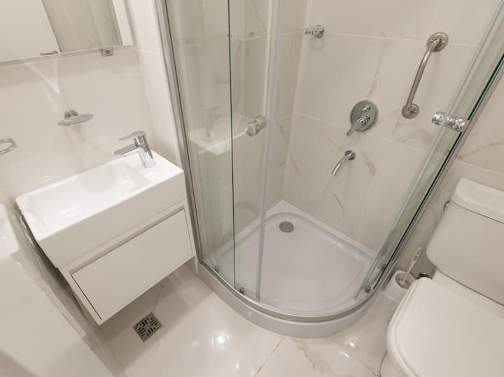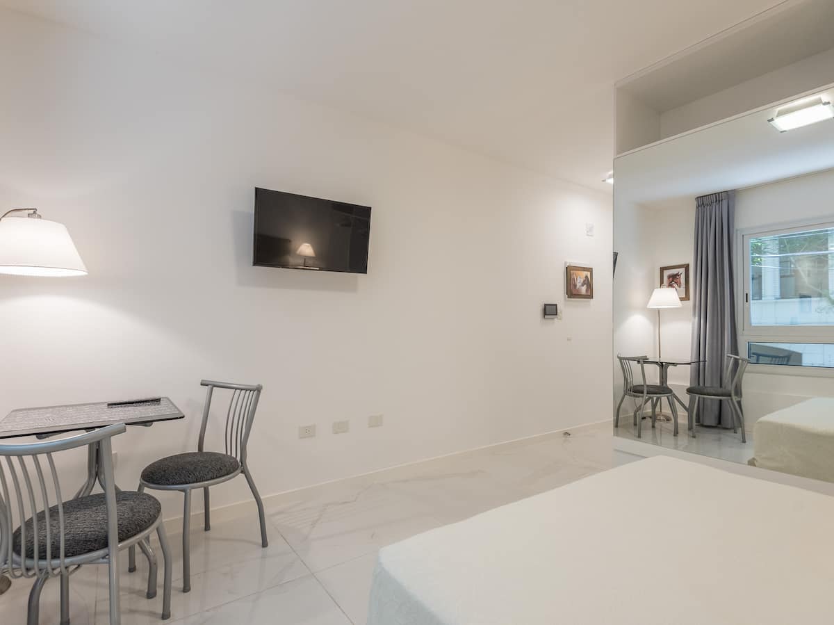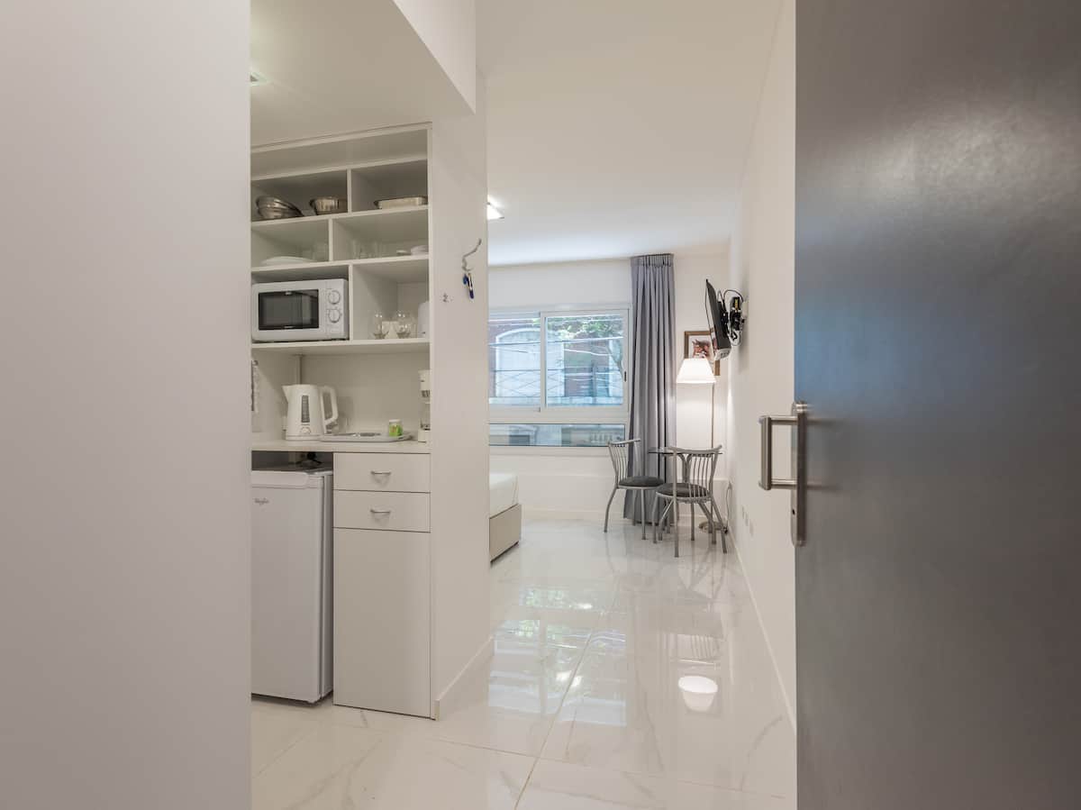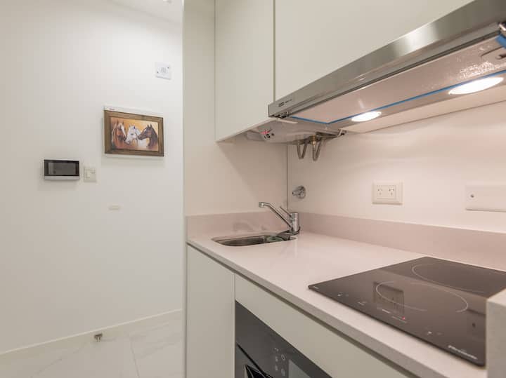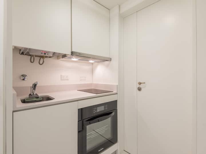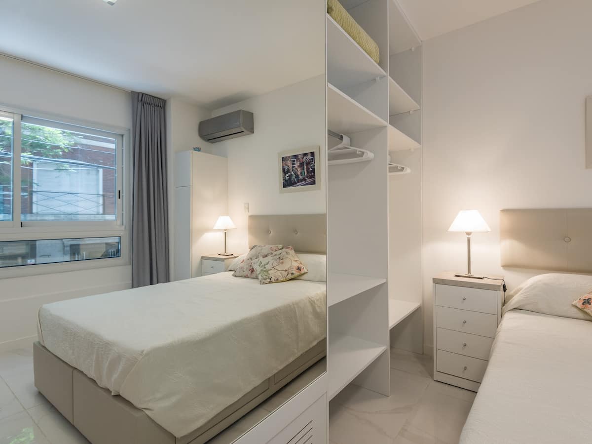 Kitnet mobiliada para aluguel temporário em Retiro, equipada para 2 pessoas. Conta com cama de casal, mesa com cadeiras, armário grande, cozinha com geladeira e forno elétrico, e banheiro com box. Inclui proximidade de Patio Bullrich, Av. Alvear e Calle Quintana.