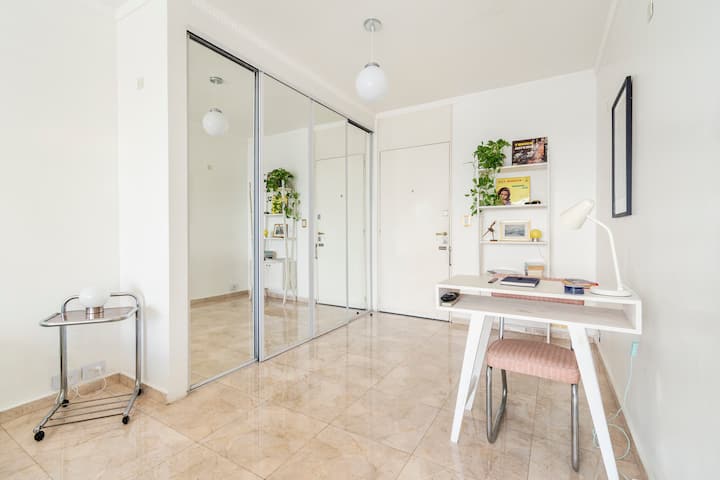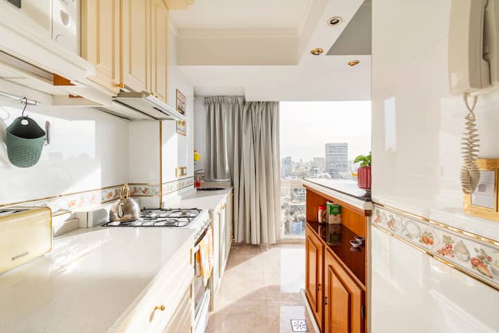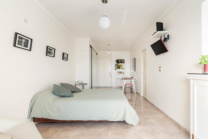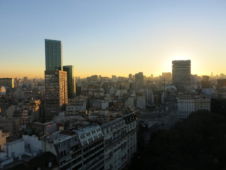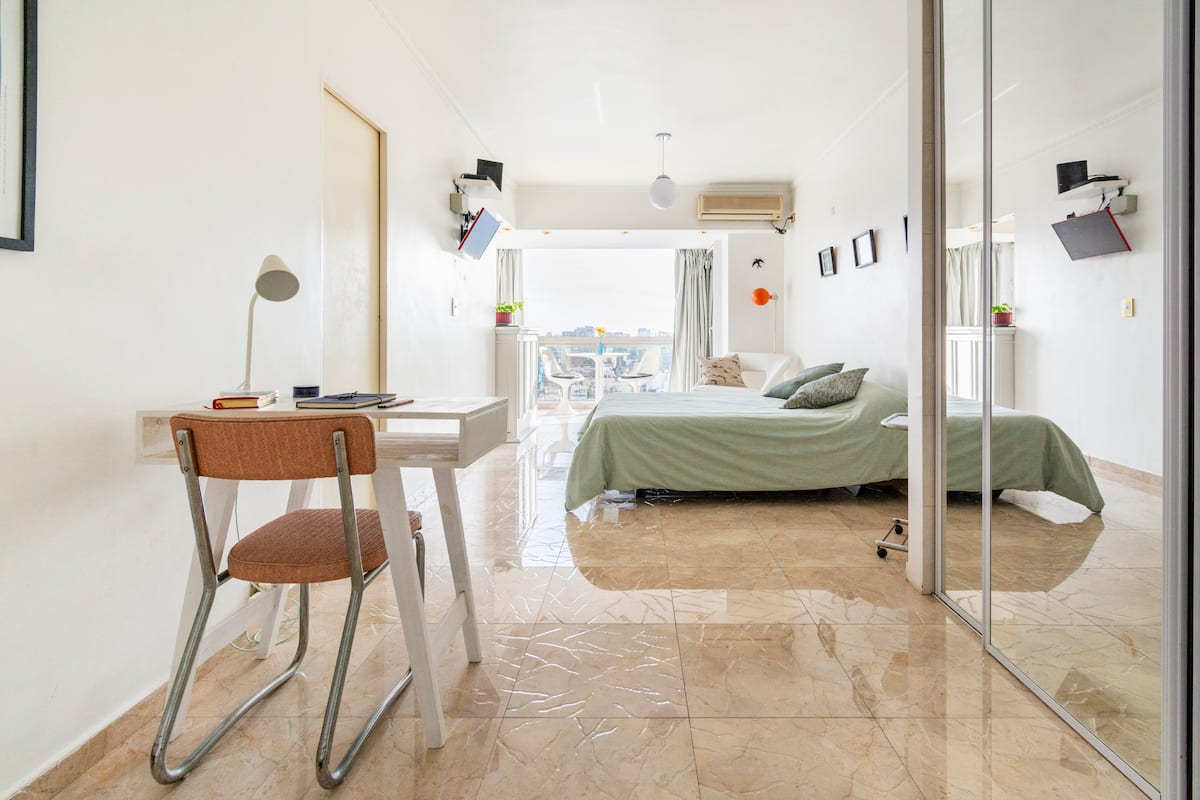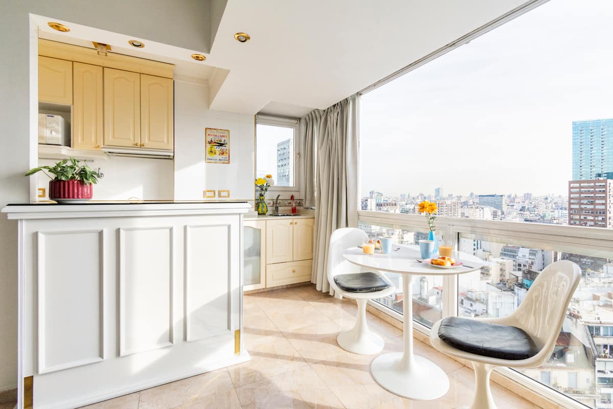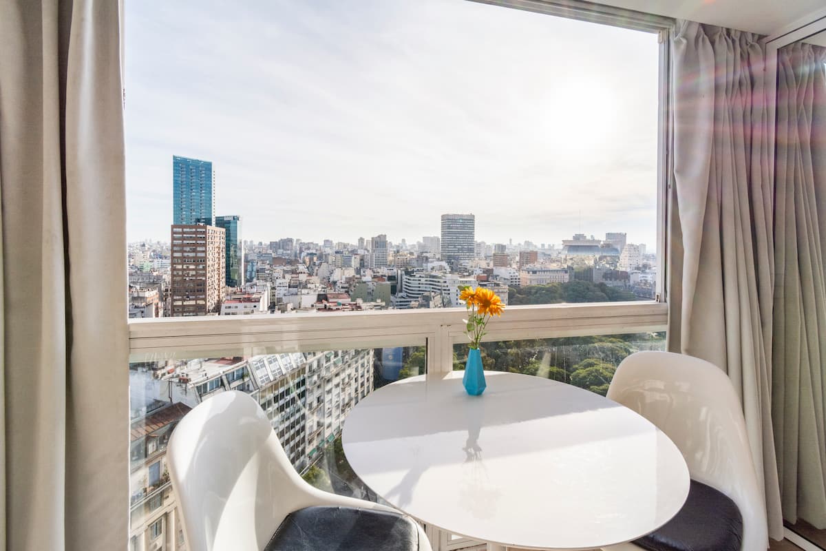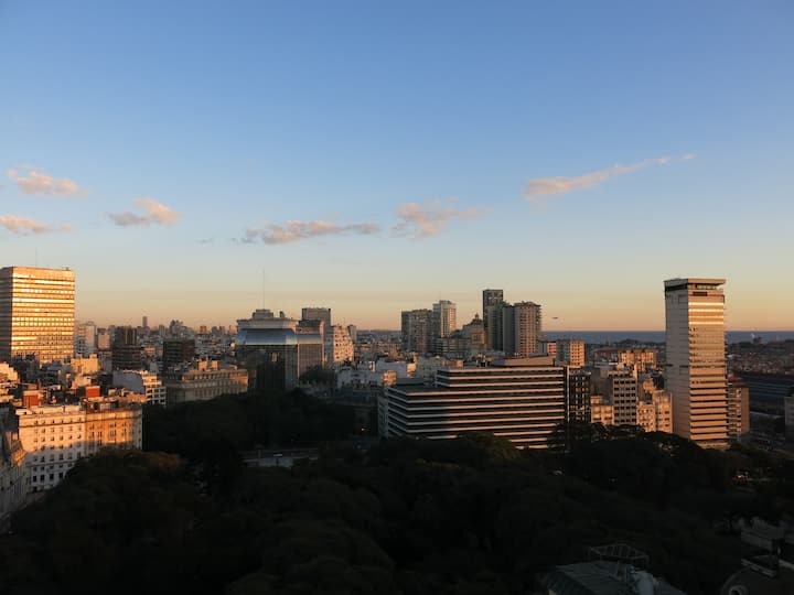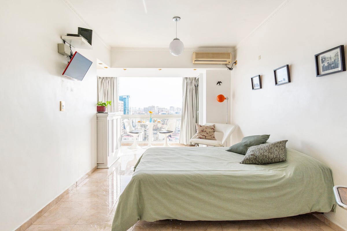 Studio mobiliado com ar-condicionado e aquecimento central no SKY HOUSE, no 21º andar. A unidade tem vista para a Plaza San Martín, a cidade e o Rio de la Plata. O estúdio inclui armários grandes com gavetas, máquina de lavar, cama, roupa de cama, secador de cabelo, ferro, TV a cabo e Wi‑Fi com boa conexão. O banheiro tem chuveiro, pia e vaso, além de espaço para armazenamento; a água quente é fornecida por caldeira central. A cozinha conta com geladeira, fogão, micro-ondas, mixer e torradeira.
