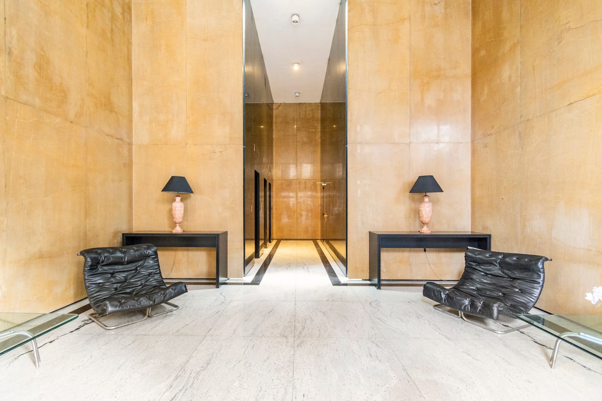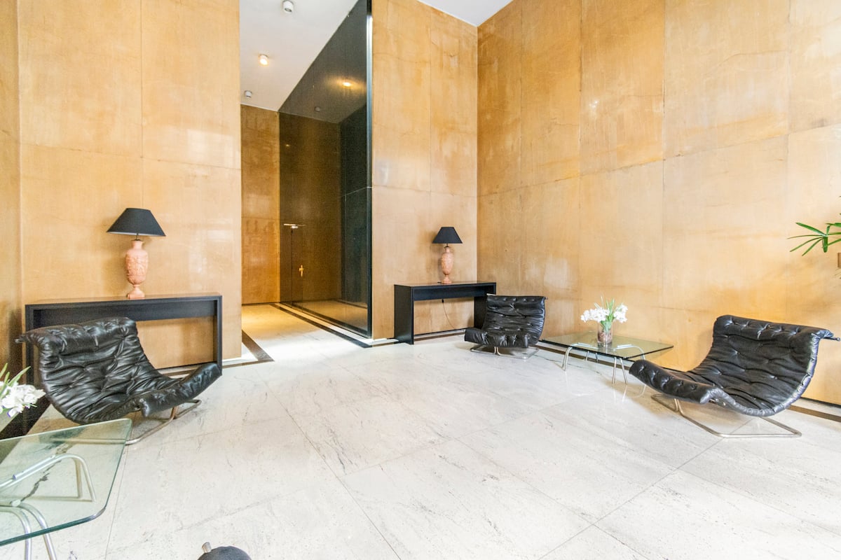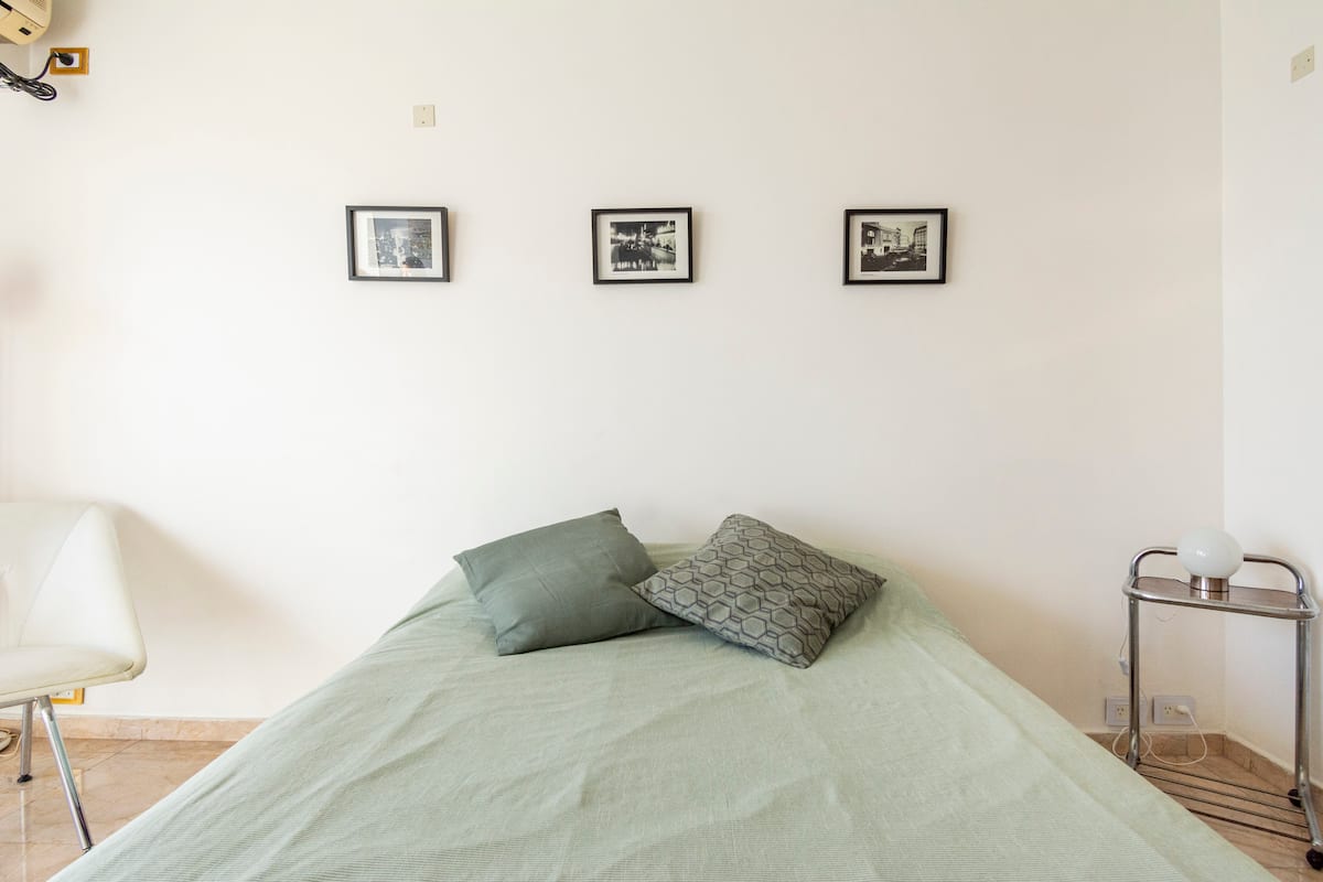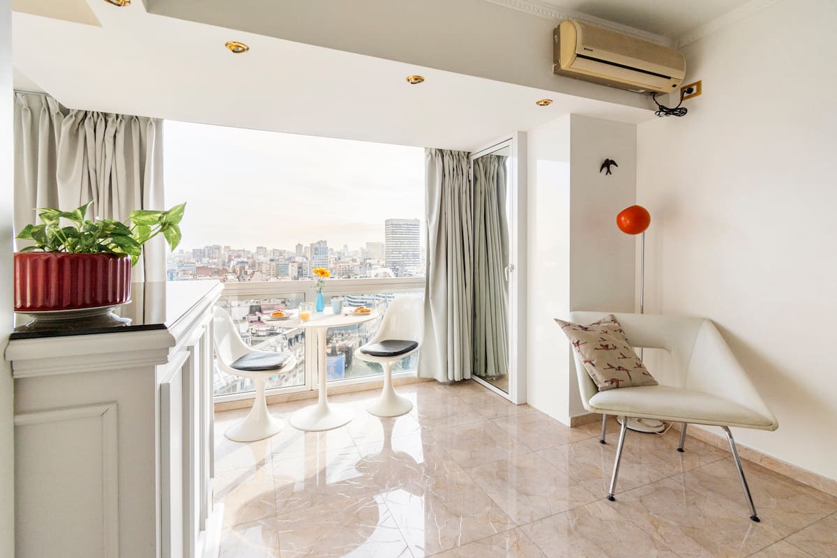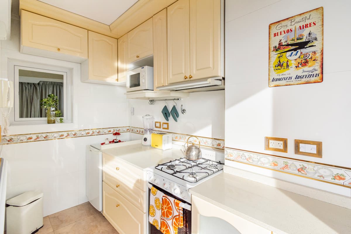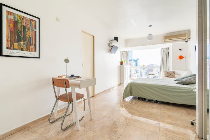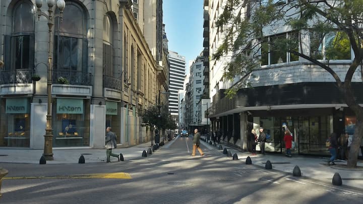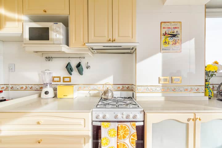 Studio mobiliado com ar-condicionado e aquecimento central no SKY HOUSE, no 21º andar. A unidade tem vista para a Plaza San Martín, a cidade e o Rio de la Plata. O estúdio inclui armários grandes com gavetas, máquina de lavar, cama, roupa de cama, secador de cabelo, ferro, TV a cabo e Wi‑Fi com boa conexão. O banheiro tem chuveiro, pia e vaso, além de espaço para armazenamento; a água quente é fornecida por caldeira central. A cozinha conta com geladeira, fogão, micro-ondas, mixer e torradeira.