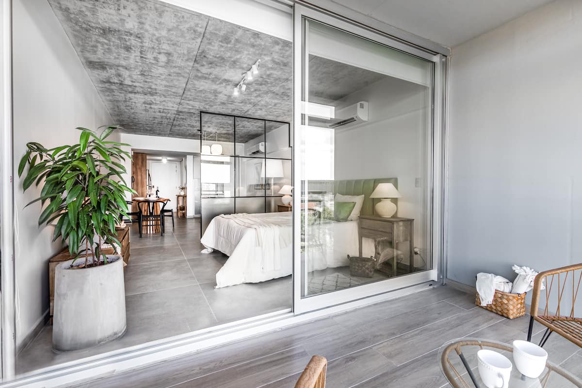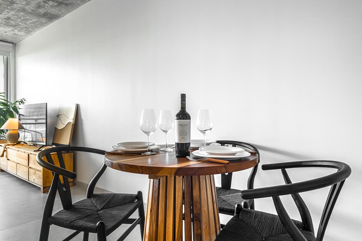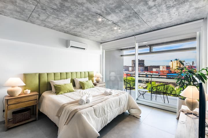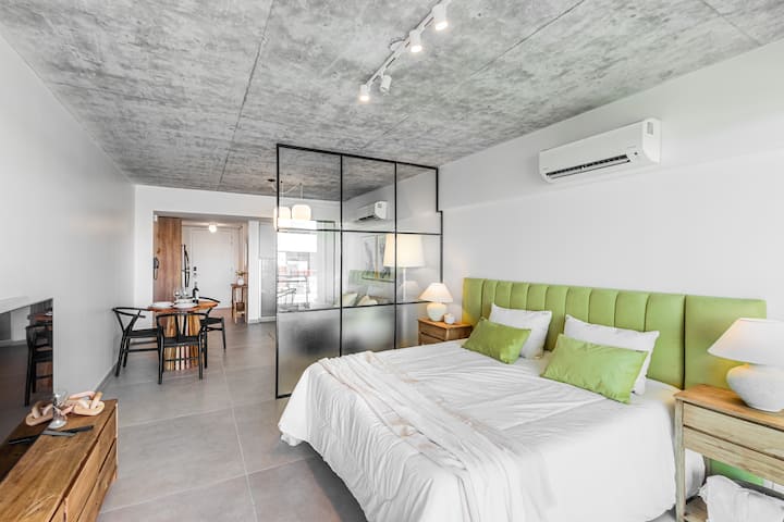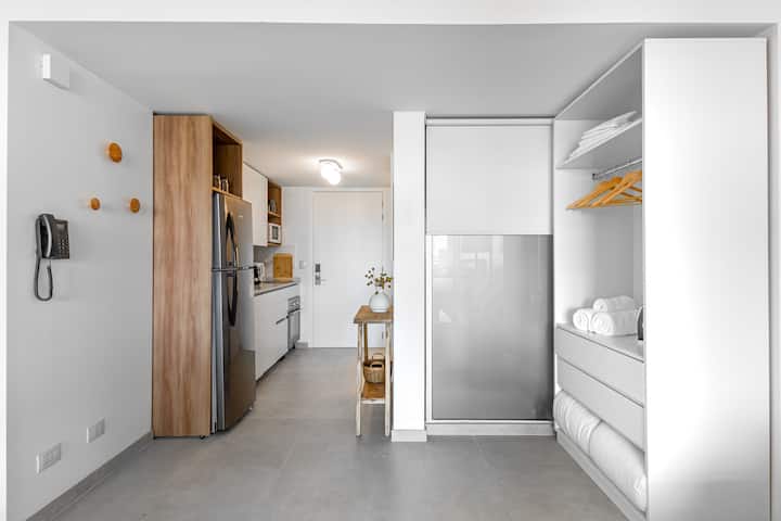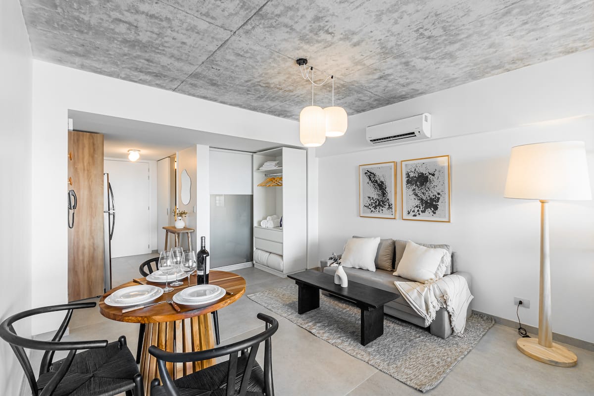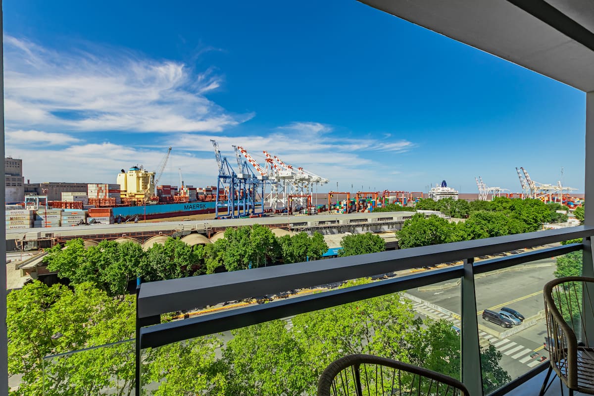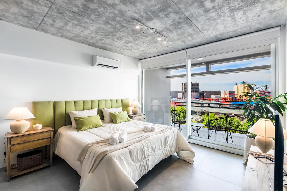 Studio no 8º andar, de frente para a rua, com vista para o porto e o Rio de la Plata. Mobiliado e equipado, com duas camas twin (90 cm x 1,90 m) ou cama king (1,80 m x 1,90 m), sofá-cama para 1 pessoa e varanda grande com mesa e poltronas. Há cortinas black-out, TV smart de 50 polegadas, ar-condicionado quente/frio e cozinha completa com geladeira com freezer, forno elétrico, micro-ondas, cafeteira Nespresso, liquidificador, torradeira, chaleira elétrica e fogão. O apartamento tem banheiro compl