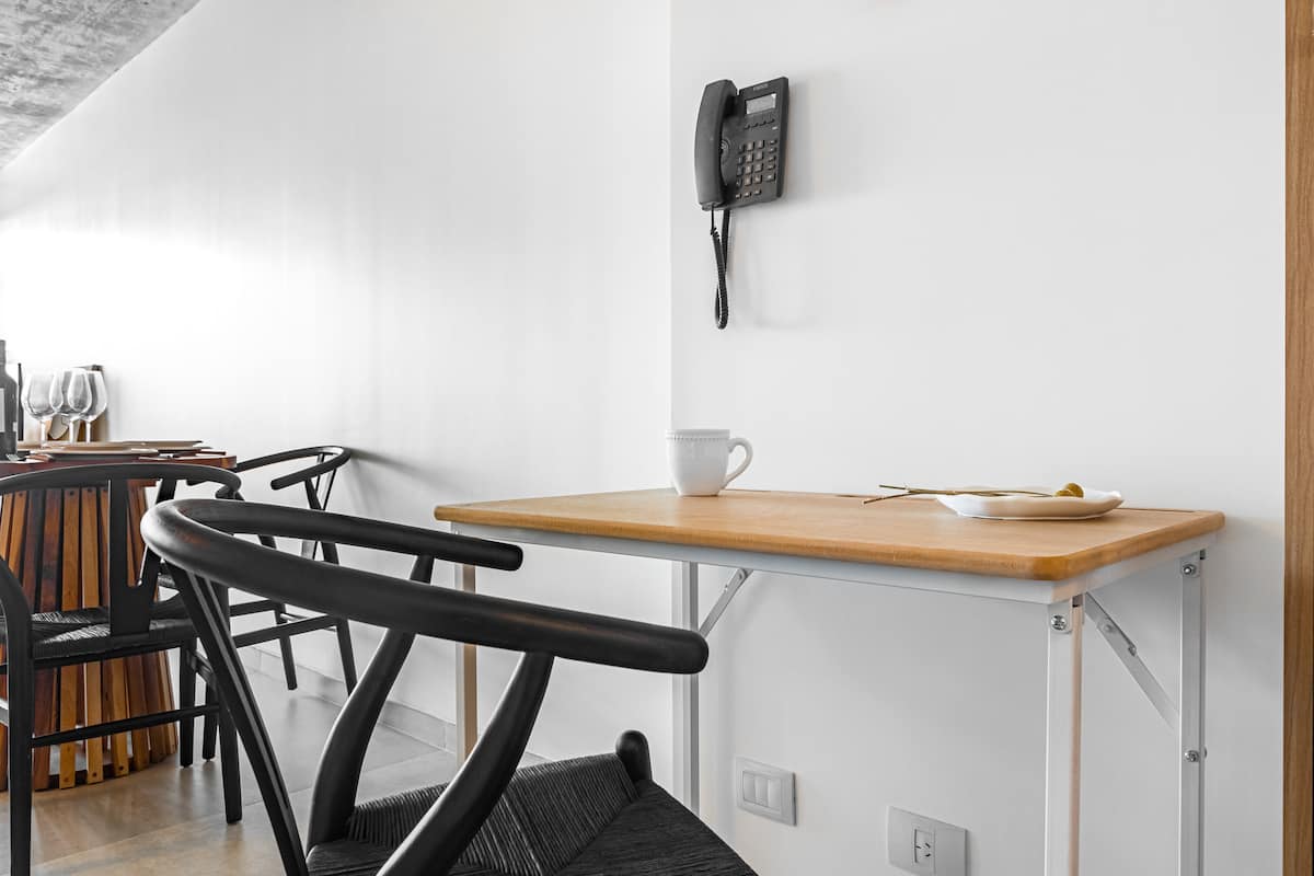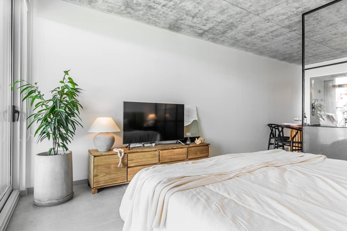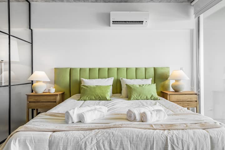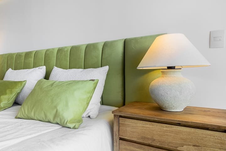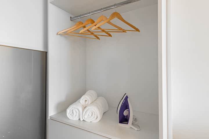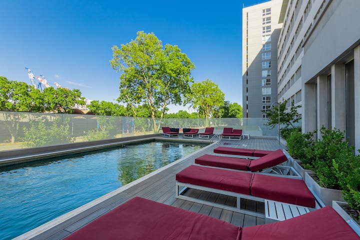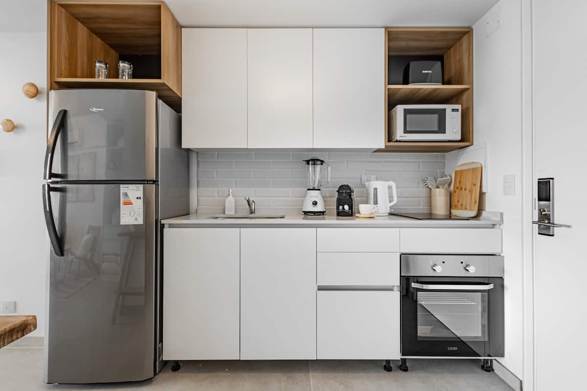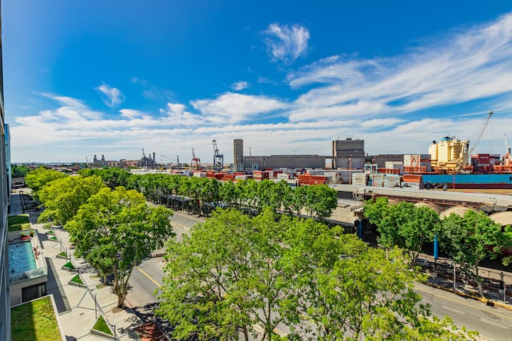Studio no 8º andar, de frente para a rua, com vista para o porto e o Rio de la Plata. Mobiliado e equipado, com duas camas twin (90 cm x 1,90 m) ou cama king (1,80 m x 1,90 m), sofá-cama para 1 pessoa e varanda grande com mesa e poltronas. Há cortinas black-out, TV smart de 50 polegadas, ar-condicionado quente/frio e cozinha completa com geladeira com freezer, forno elétrico, micro-ondas, cafeteira Nespresso, liquidificador, torradeira, chaleira elétrica e fogão. O apartamento tem banheiro compl
