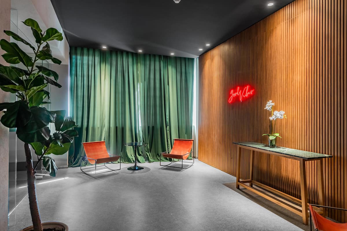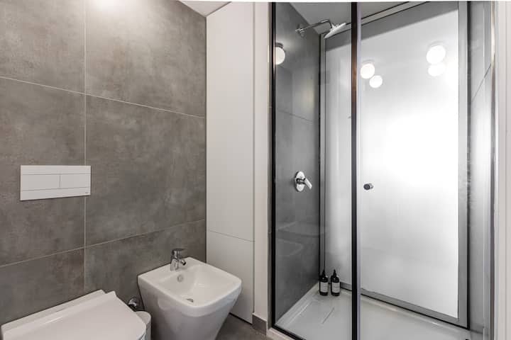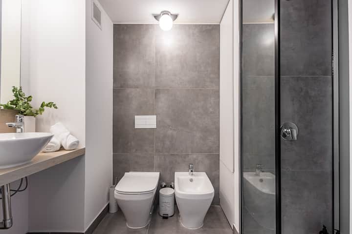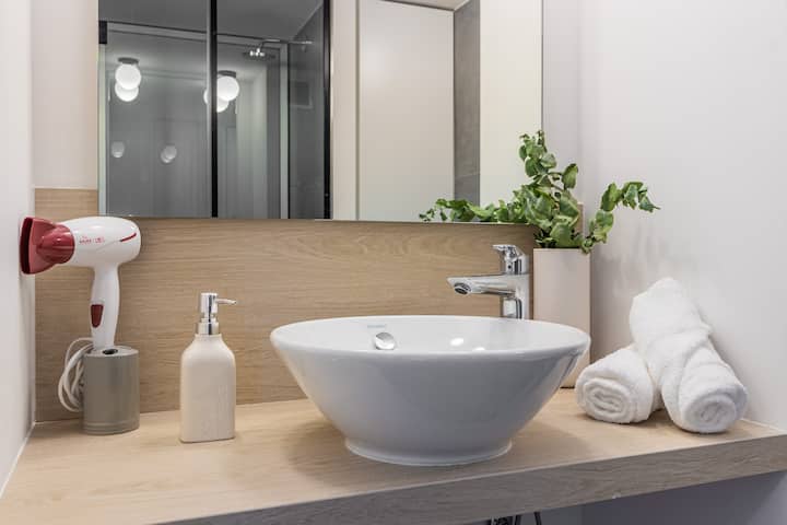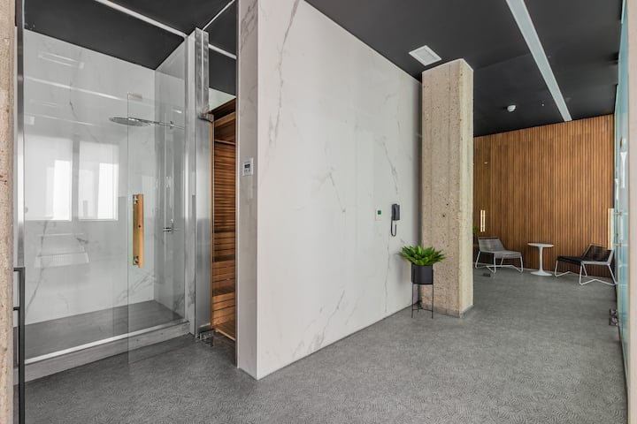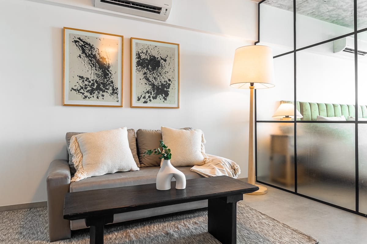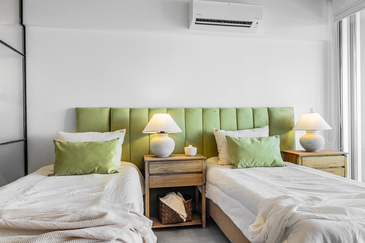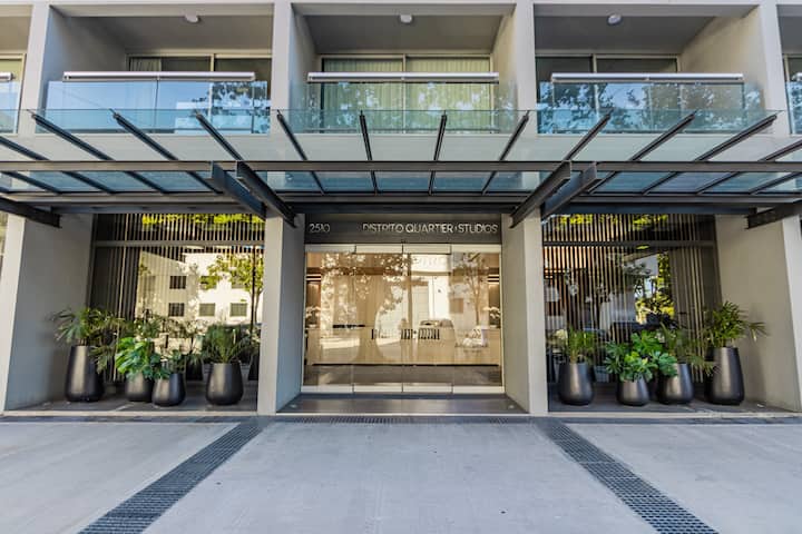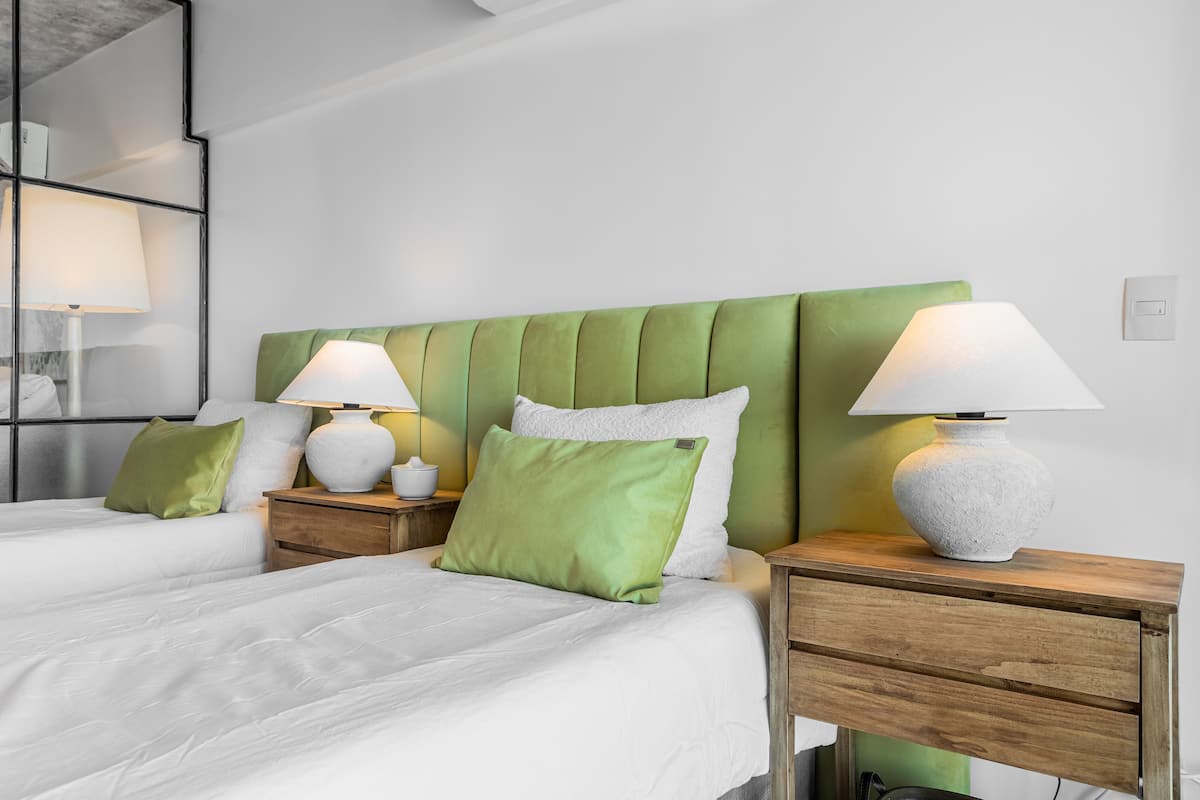 Studio no 8º andar, de frente para a rua, com vista para o porto e o Rio de la Plata. Mobiliado e equipado, com duas camas twin (90 cm x 1,90 m) ou cama king (1,80 m x 1,90 m), sofá-cama para 1 pessoa e varanda grande com mesa e poltronas. Há cortinas black-out, TV smart de 50 polegadas, ar-condicionado quente/frio e cozinha completa com geladeira com freezer, forno elétrico, micro-ondas, cafeteira Nespresso, liquidificador, torradeira, chaleira elétrica e fogão. O apartamento tem banheiro compl