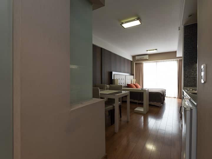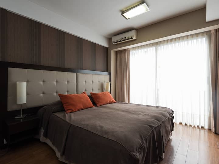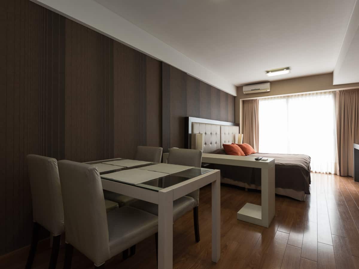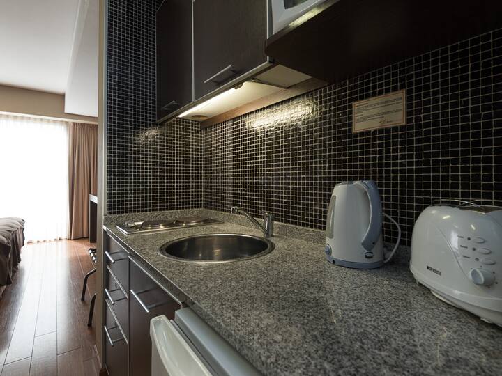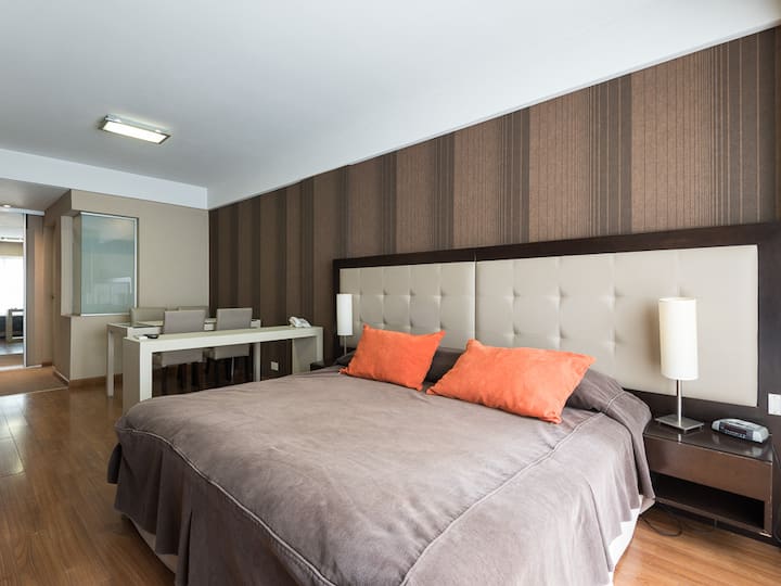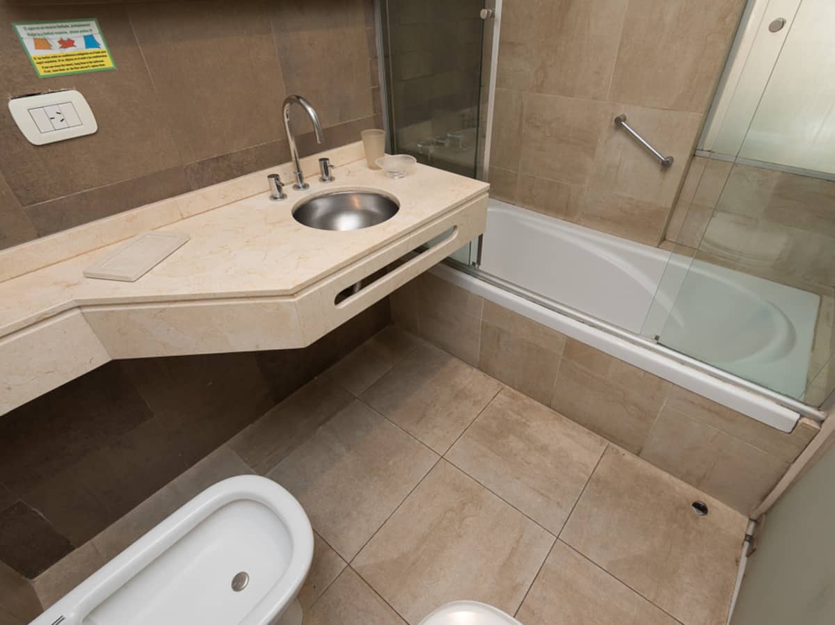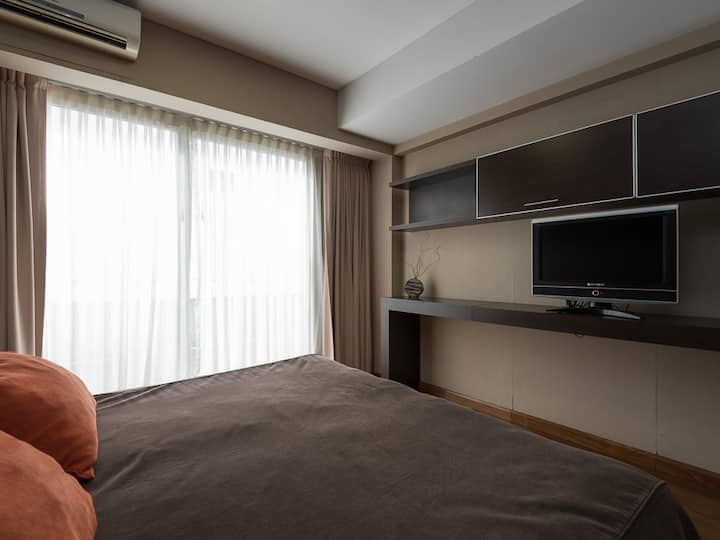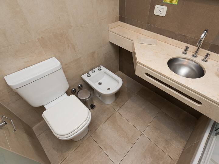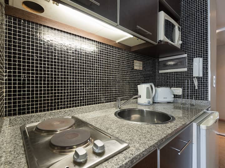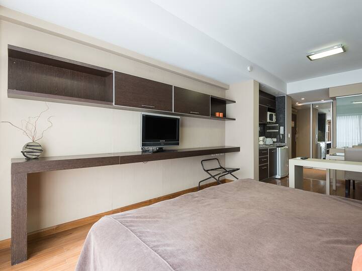Kitnet mobiliada em Retiro, com localização próxima à Av. Alvear, Av. Santa Fe e Av. 9 de Julio. Está equipada e inclui kitchenette, banheiro completo com banheira e bidê. Há duas camas simples que podem ser preparadas juntas como cama de casal e uma área com mesa e cadeiras para trabalho. O imóvel tem varanda.