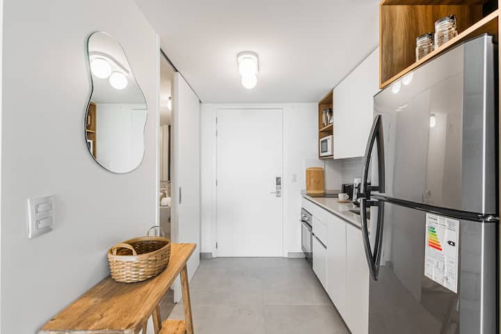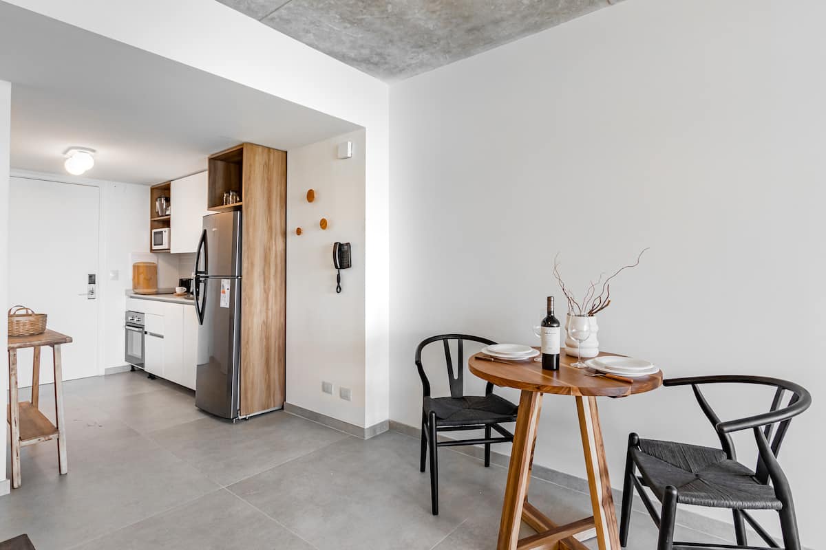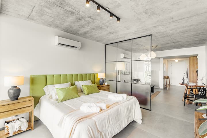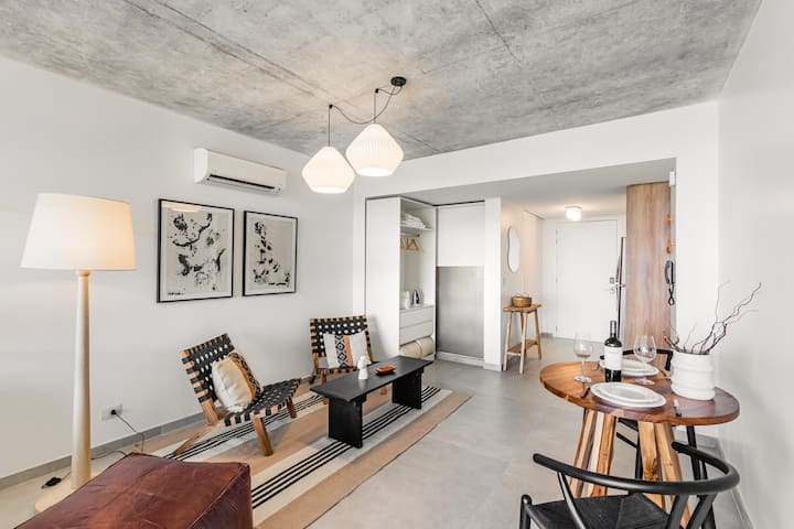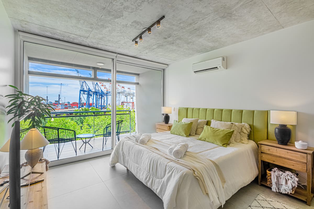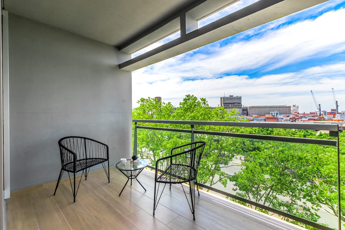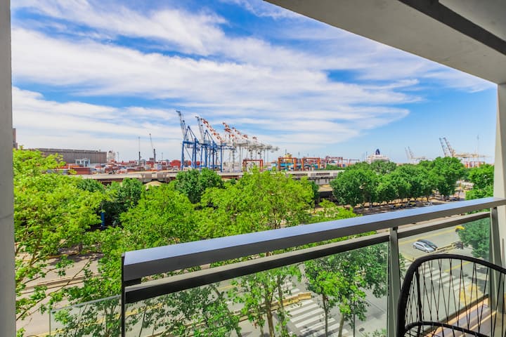Studio no 6º andar, de frente e com vista para o porto e para o Rio de la Plata, em Retiro. Varanda ampla com mesa e cadeiras. Está equipado com cortinas blackout, TV Smart de 50 polegadas e ar-condicionado quente/frio.