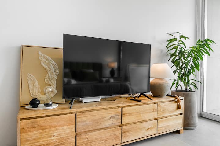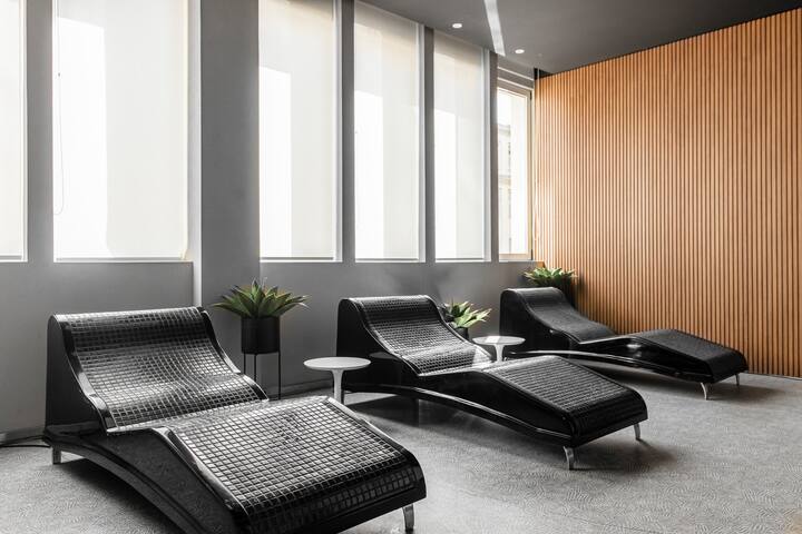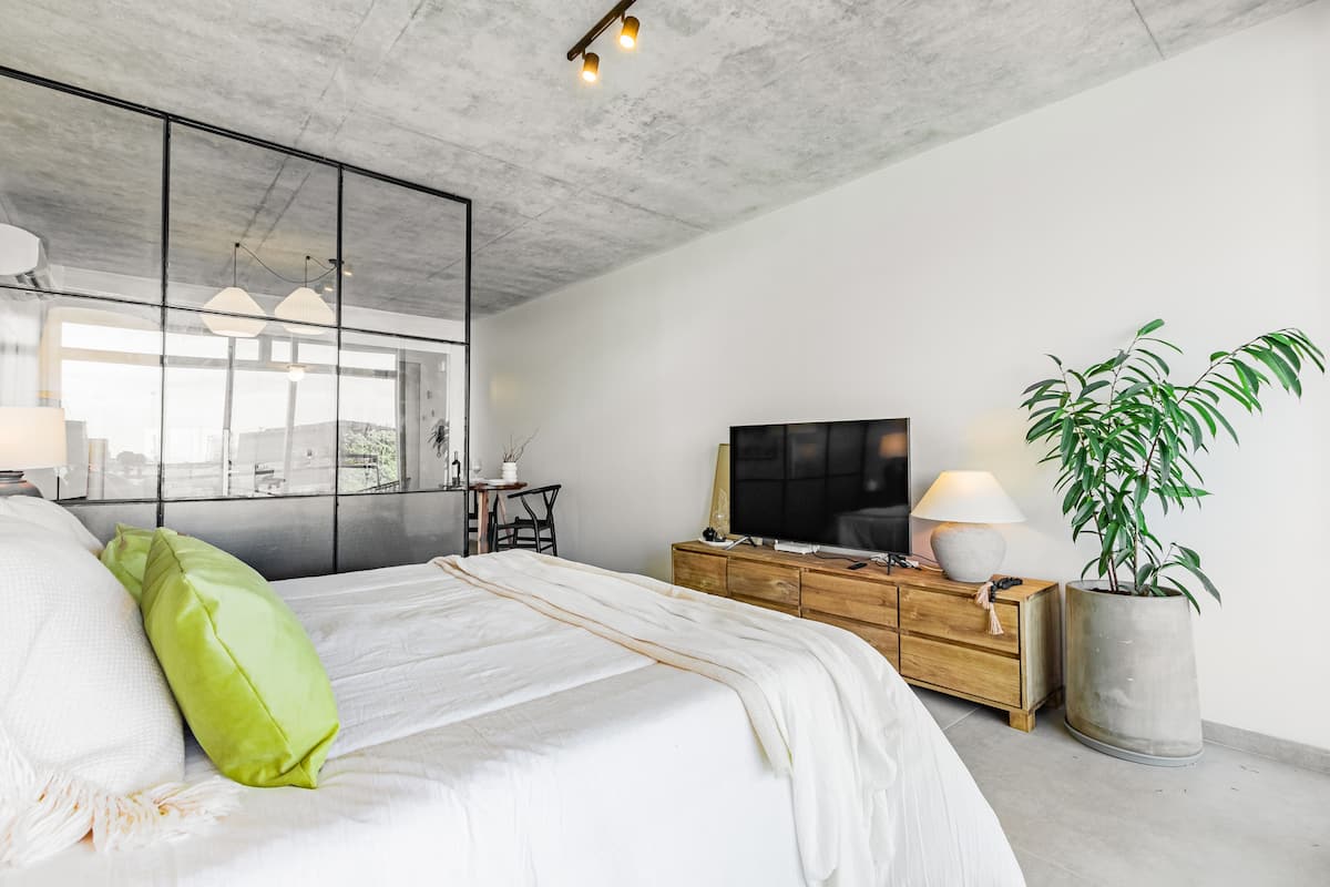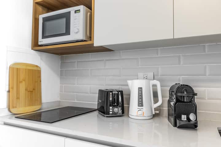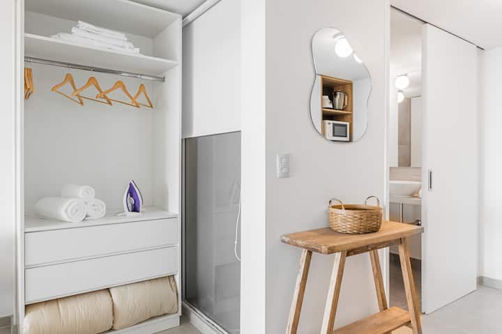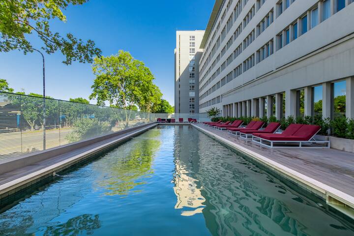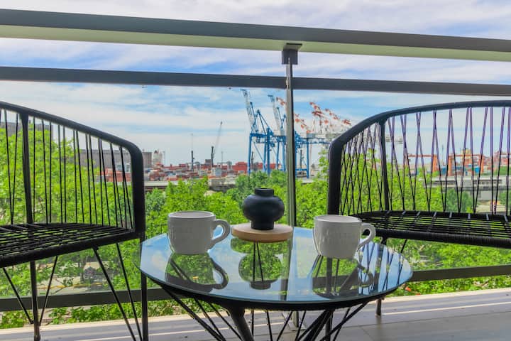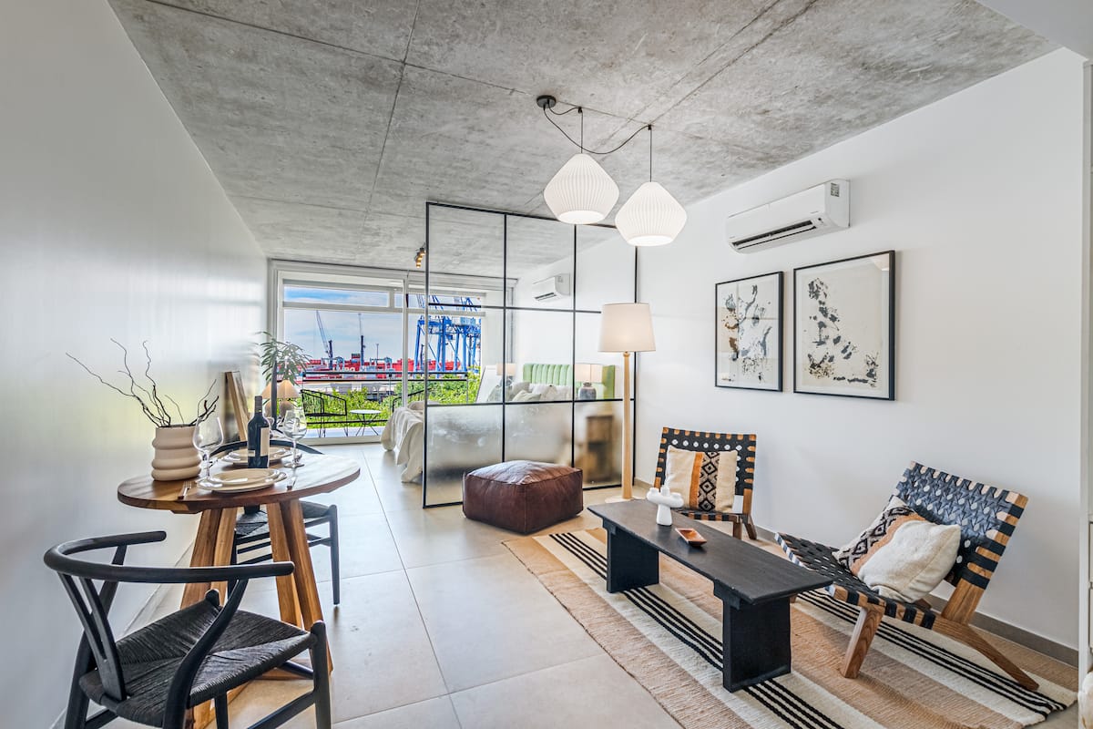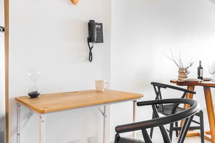 Studio no 6º andar, de frente e com vista para o porto e para o Rio de la Plata, em Retiro. Varanda ampla com mesa e cadeiras. Está equipado com cortinas blackout, TV Smart de 50 polegadas e ar-condicionado quente/frio.