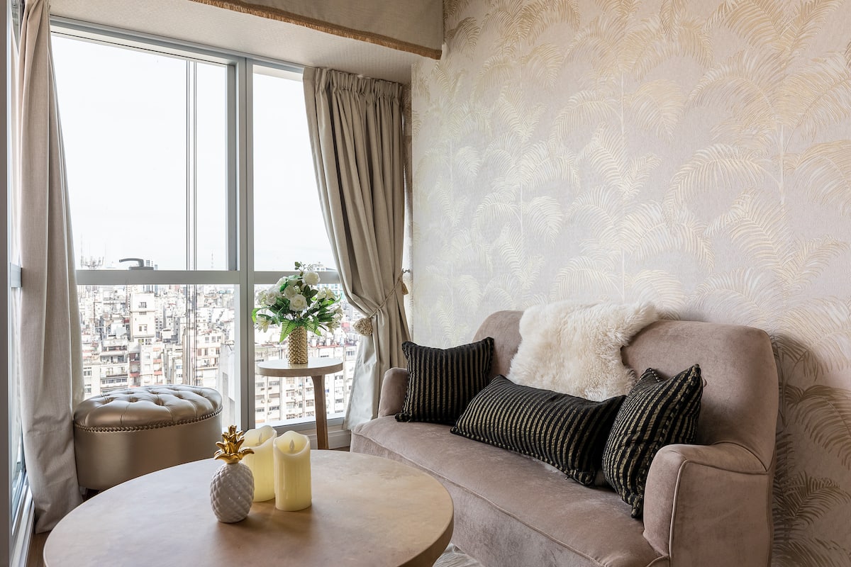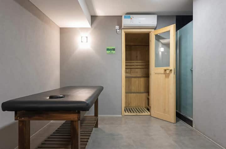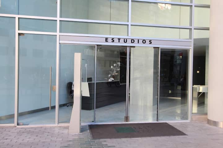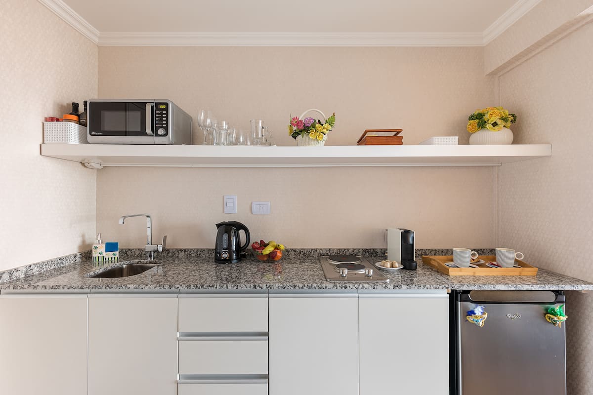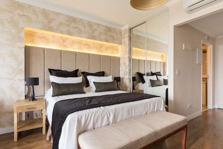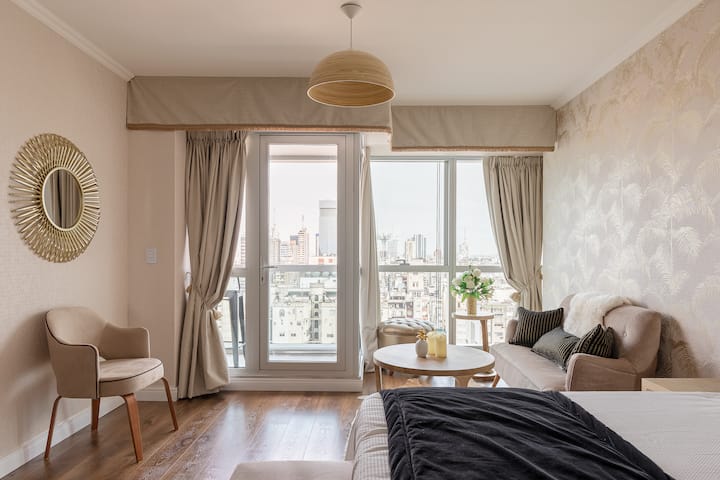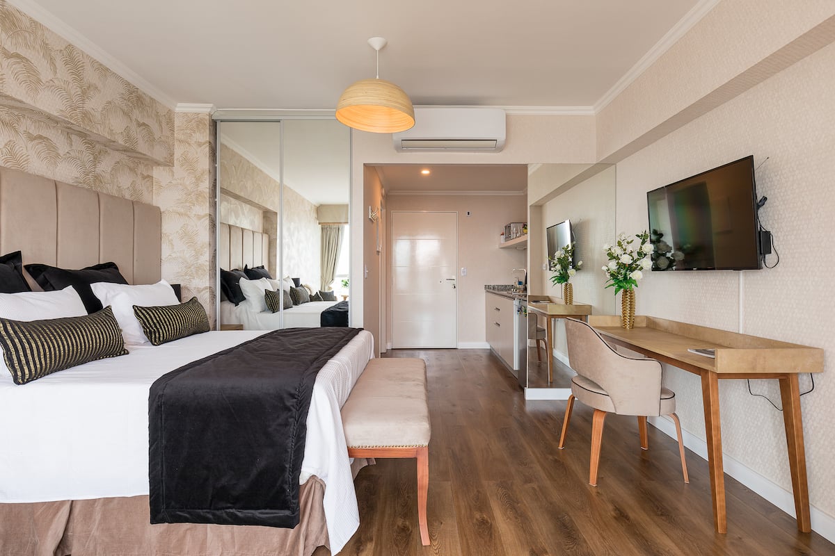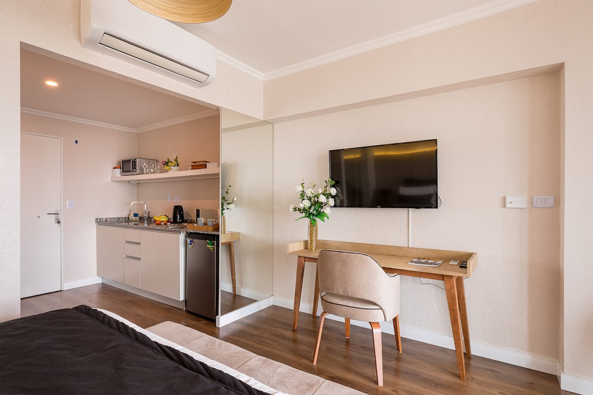 Estúdio no 21º andar da torre Bellini Esmeralda, em Retiro. Inclui varanda e área com sala pequena, cama queen-size e mesa. Há Wi-Fi de 50 Mbps, além de acesso a piscina e academia no prédio.