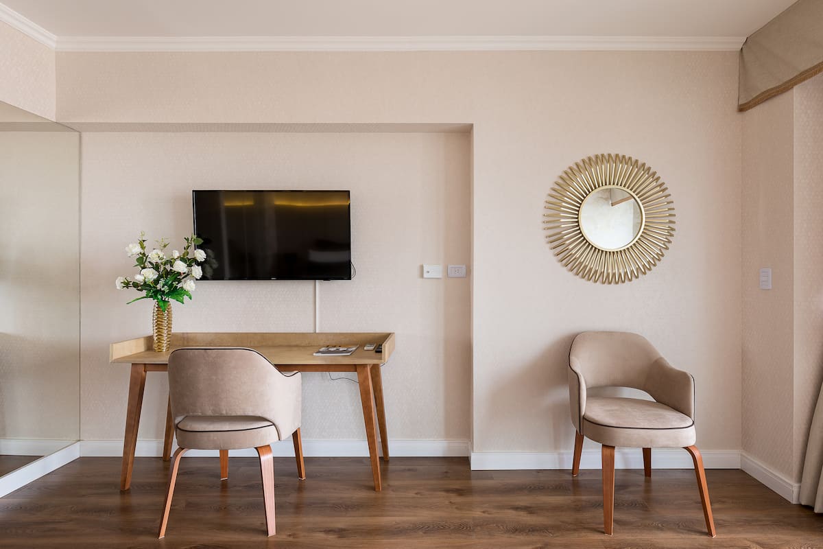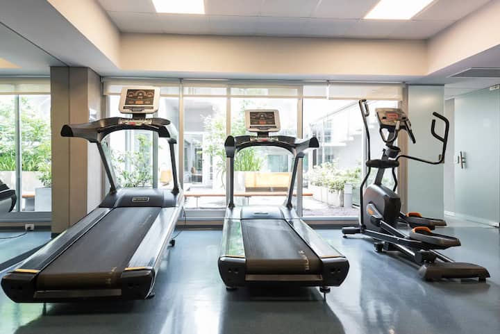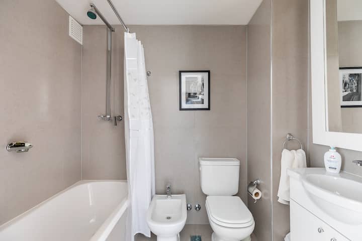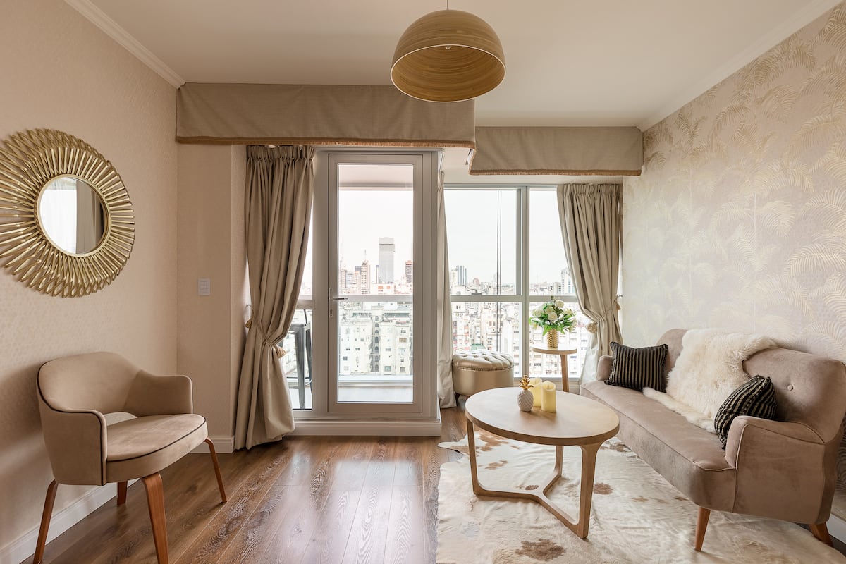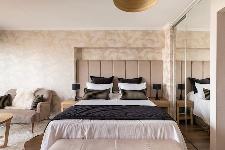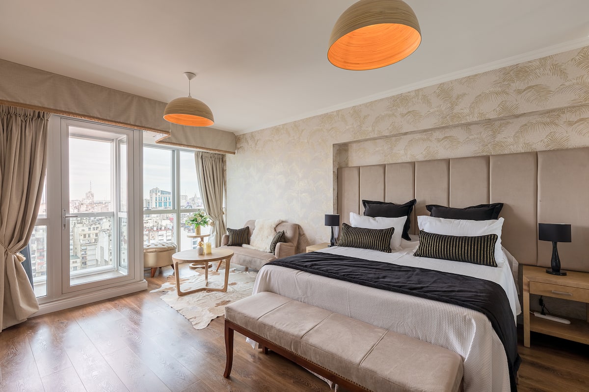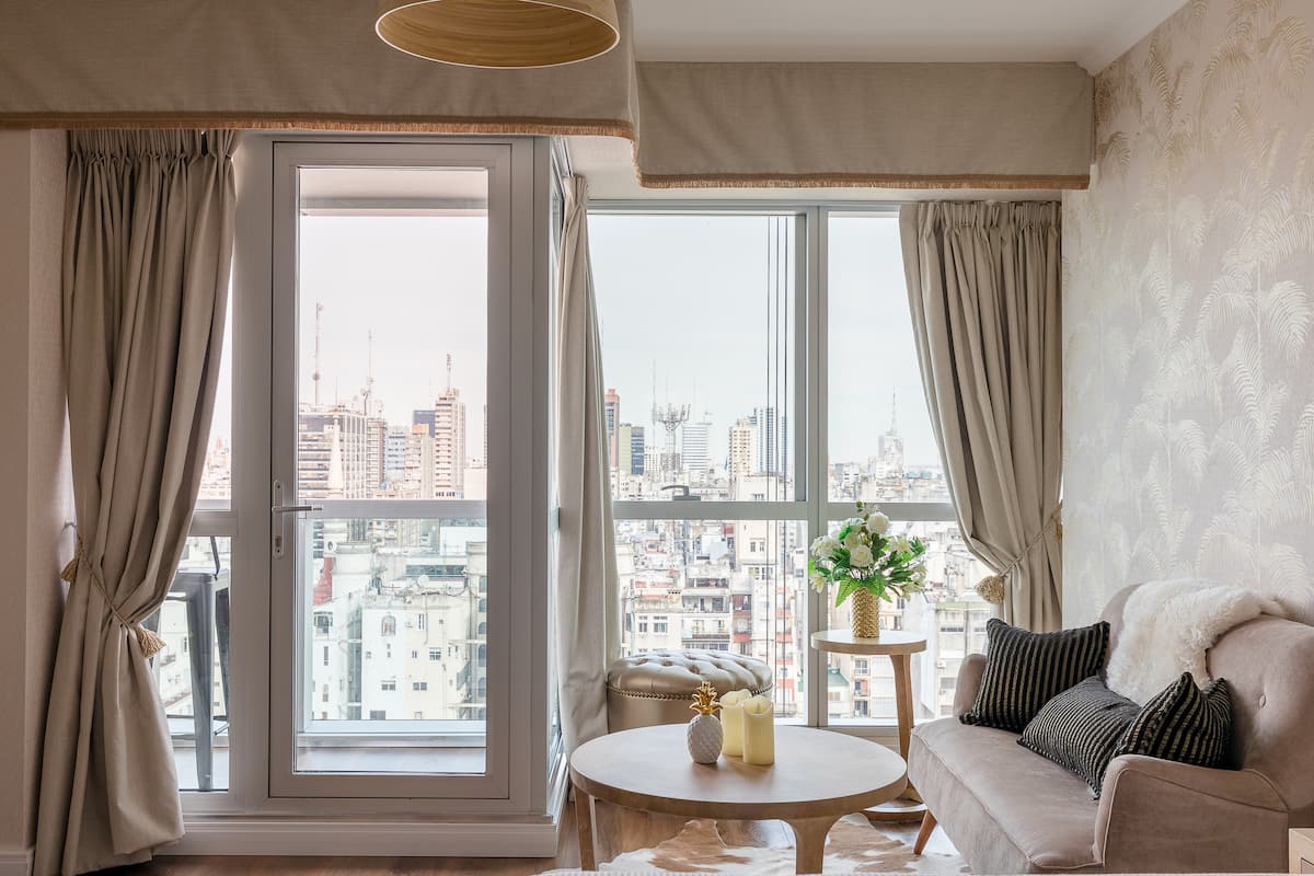 Estúdio no 21º andar da torre Bellini Esmeralda, em Retiro. Inclui varanda e área com sala pequena, cama queen-size e mesa. Há Wi-Fi de 50 Mbps, além de acesso a piscina e academia no prédio.