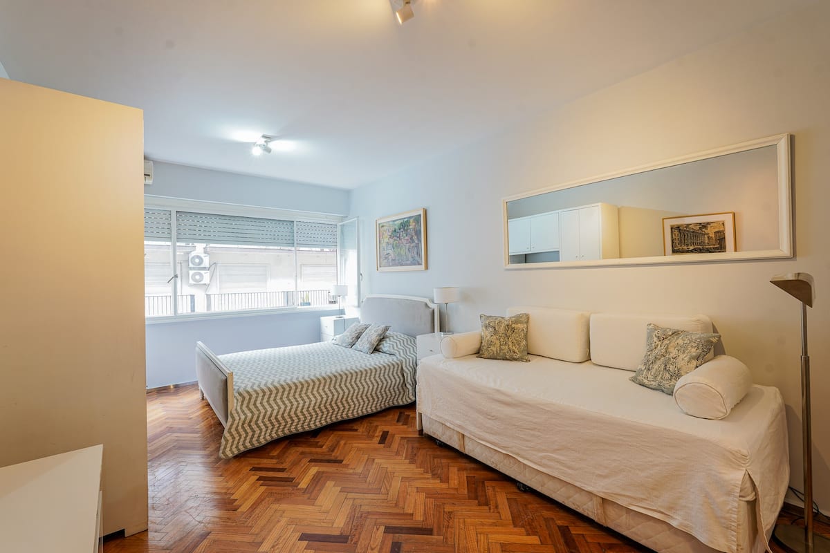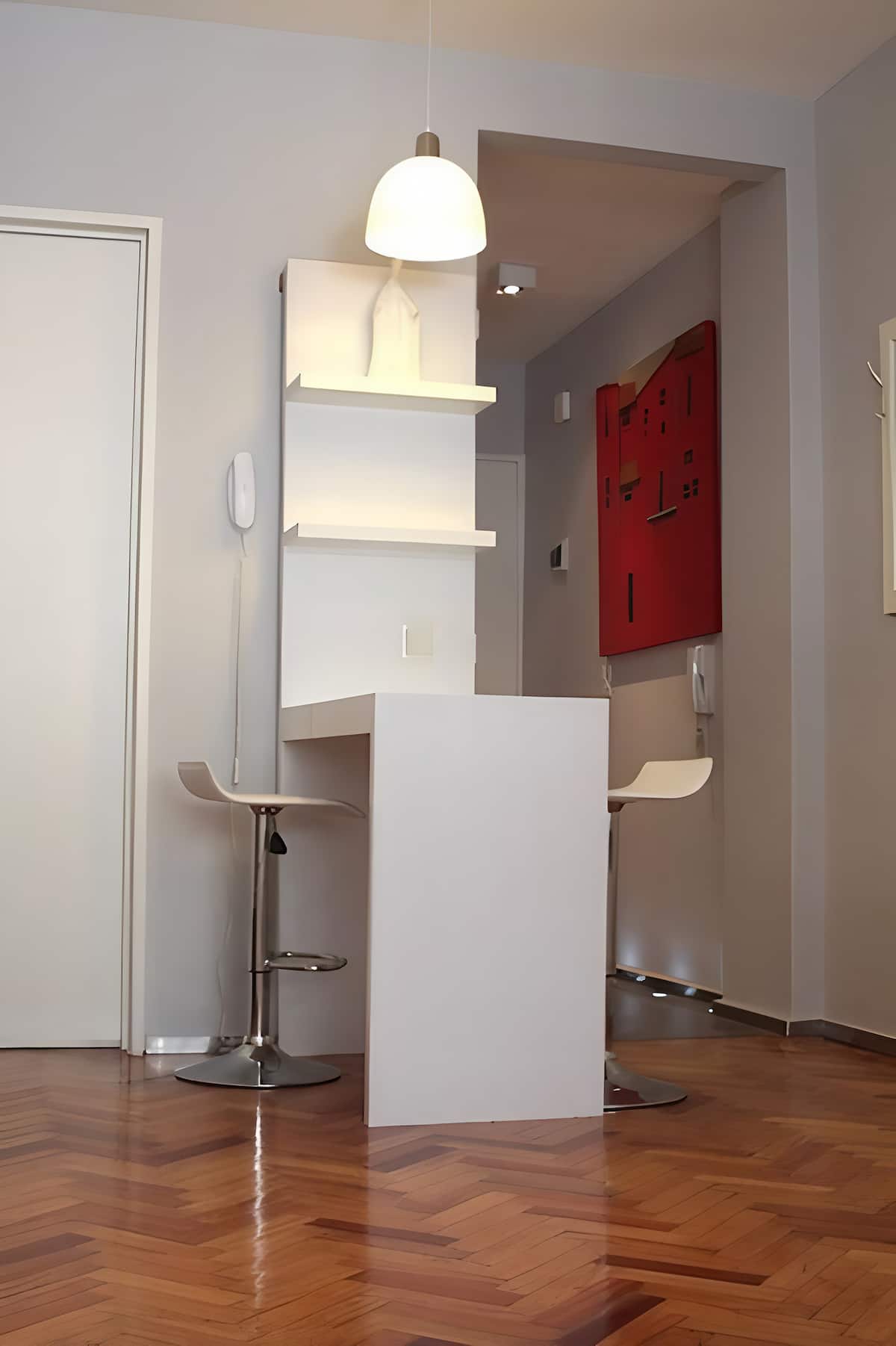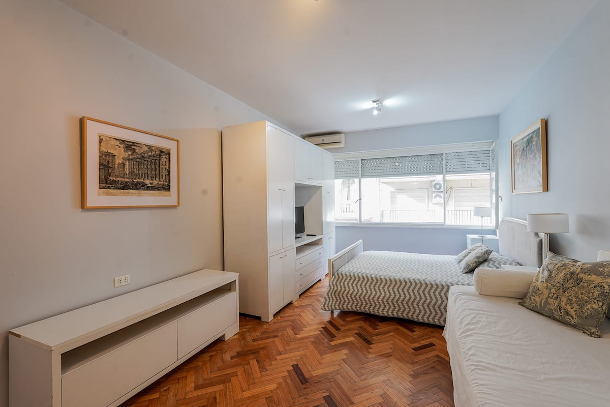 Apartamento studio no bairro Retiro, em boas condições, totalmente mobiliado. Com piso de parquet, cozinha compacta planejada e banheiro completo. Inclui cama de casal e sofá-cama com cama extra; sala com área de jantar reduzida; armário amplo para guarda-roupa e armazenamento; TV e internet. Localizado a poucos blocos do Obelisco, Galerías Pacífico e Calle Florida.