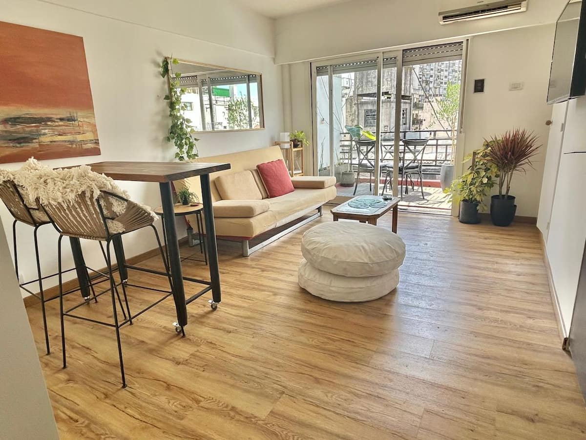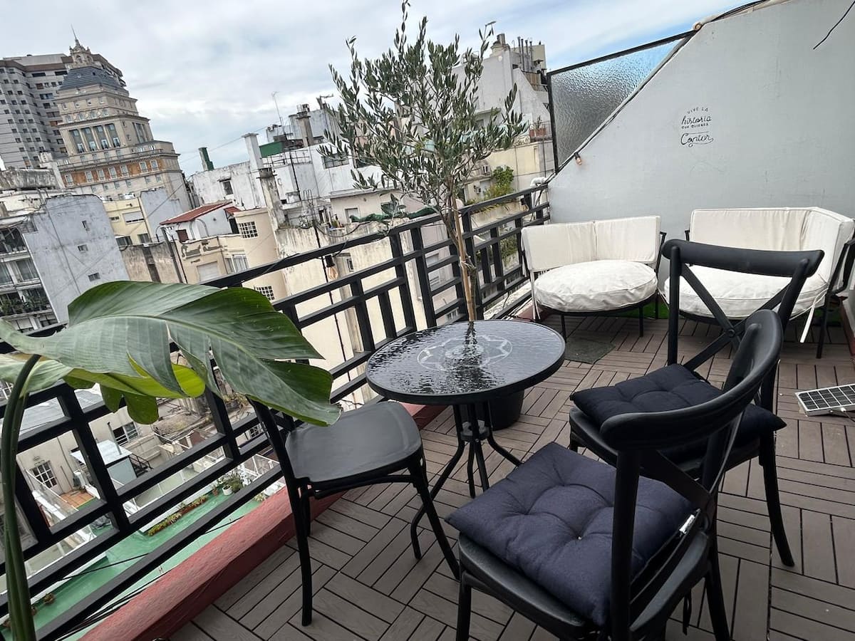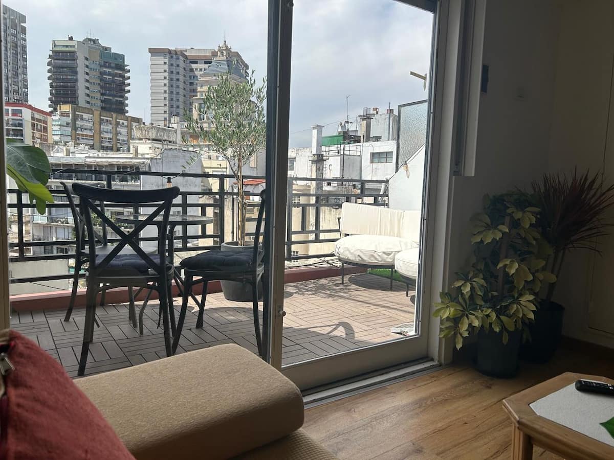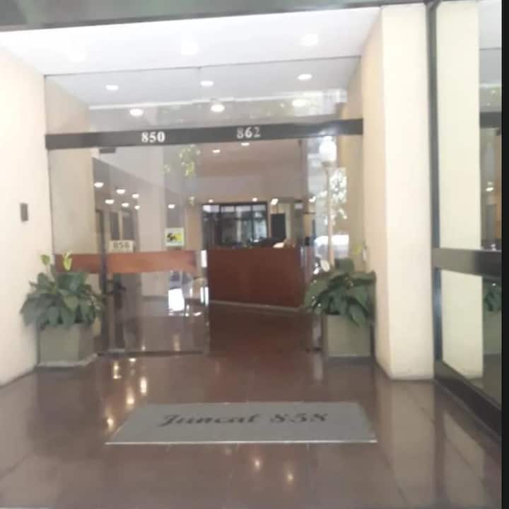 Kitnet (ambiente único) com varanda/terraço. Fica a 1,5 quarteirão da Av. 9 de Julio, da Av. Libertador e do Palacio Paz, na Plaza San Martín. Há estacionamento pago a um quarteirão; a região do entorno da Chancelaria tem bares, pontos turísticos e restaurantes.