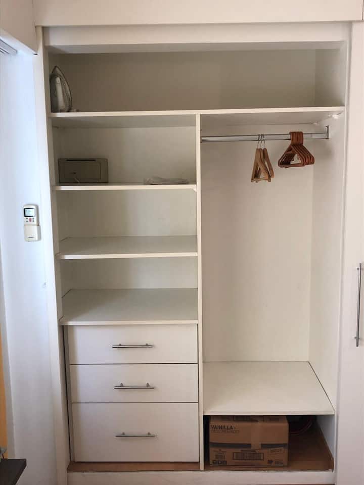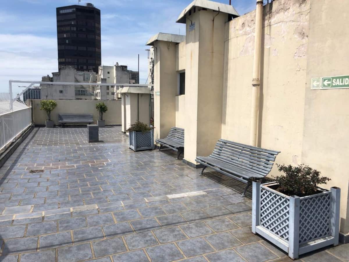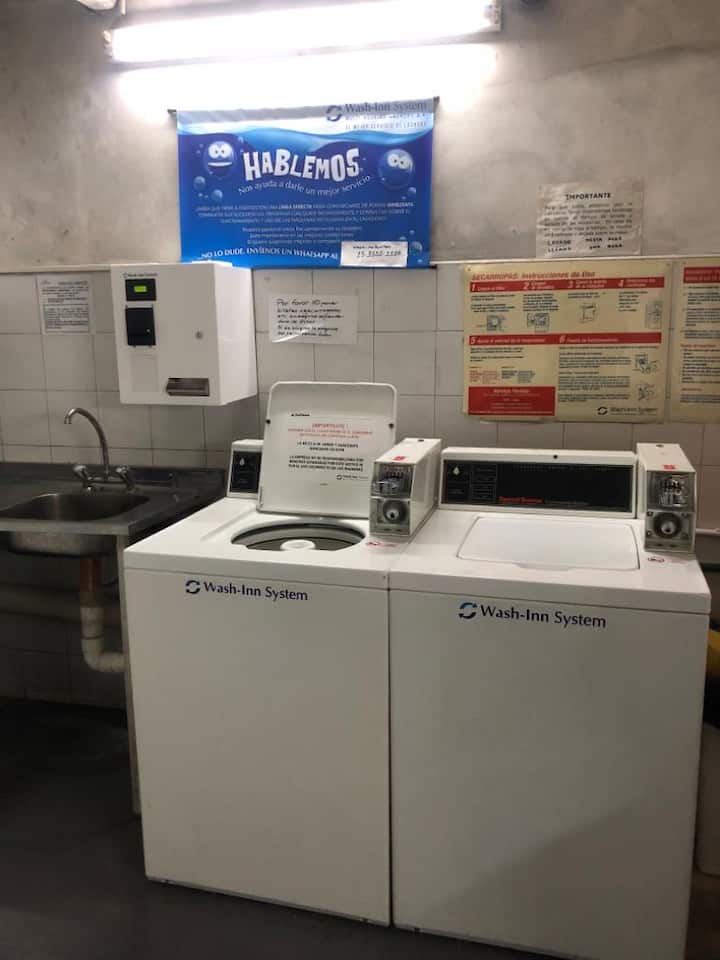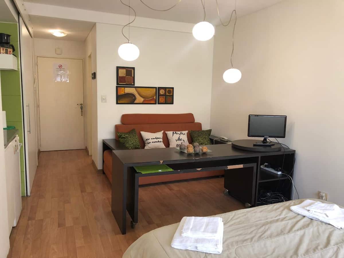 Kitnet mobiliada em Retiro/Recoleta. Ambiente único com divisória que funciona como mesa, ar-condicionado para frio e aquecimento por piso radiante. Inclui TV a cabo e Wi-Fi, cofre, cama e roupa de cama, toalhas de hotel e itens de banho; o banheiro tem banheira com chuveiro. Cozinha com geladeira, micro-ondas, cafeteira e itens completos de cozinha, além de utensílios e ferro. O prédio tem 4 elevadores e segurança 24 horas.