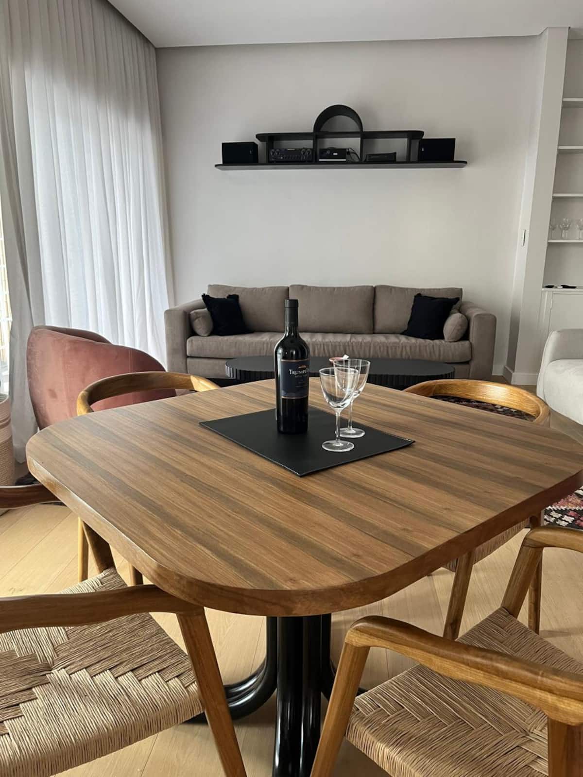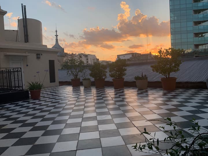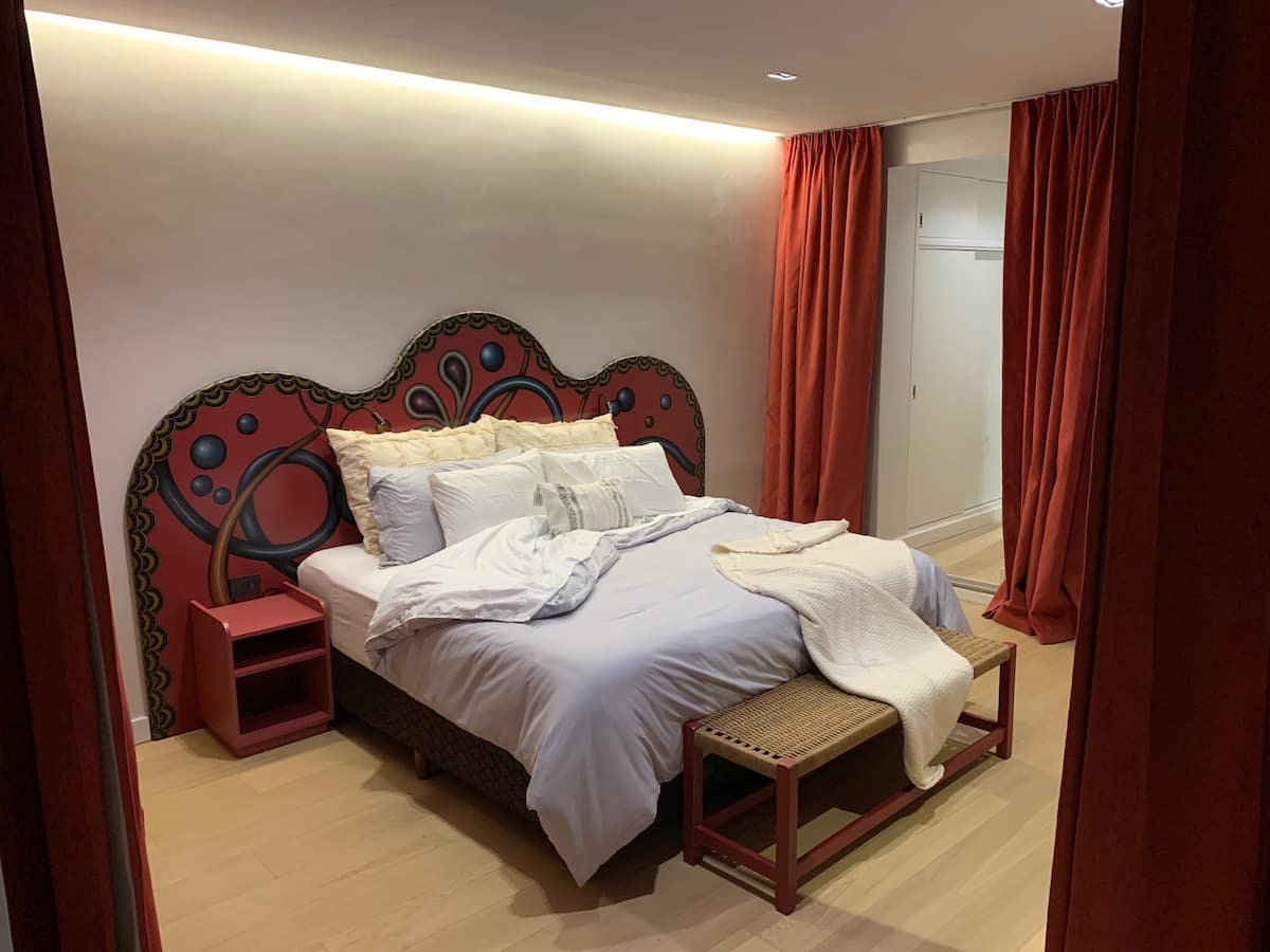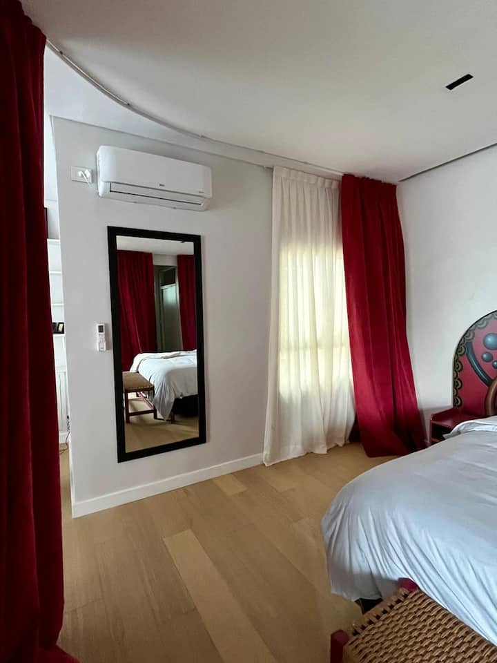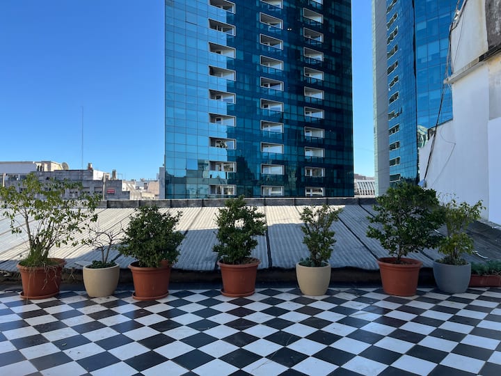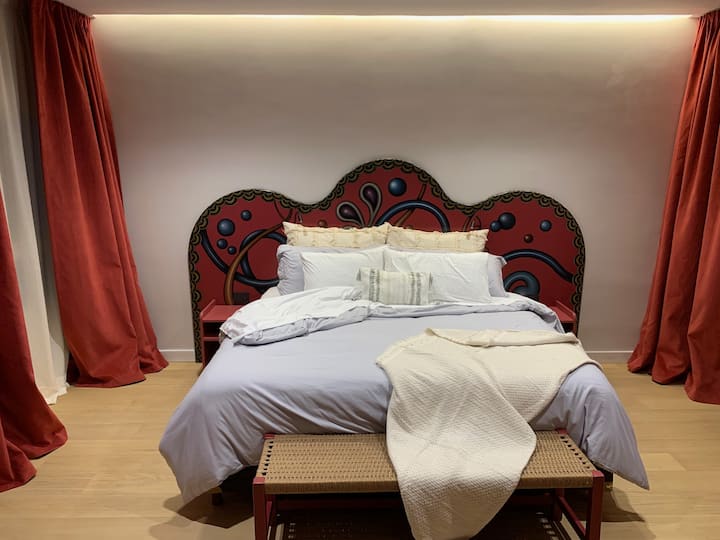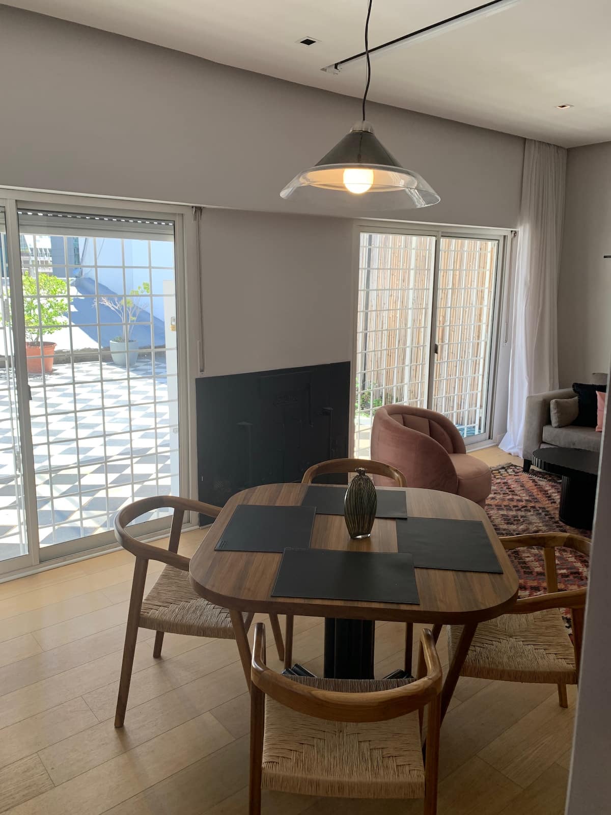 Loft no último andar com 68 m² em Retiro, com área de dormir na parte de trás que pode ser totalmente separada por cortinas móveis do teto ao chão. A área de estar inclui centro de entretenimento com tela de projeção de 90 polegadas embutida no teto, além de mesa de trabalho com vista para a varanda. A entrada dá acesso a uma varanda privativa de 68 m² com portas de correr de vidro; a unidade tem armários e banheiro principal junto à área de dormir, além de lavabo e lavanderia com máquina de lav