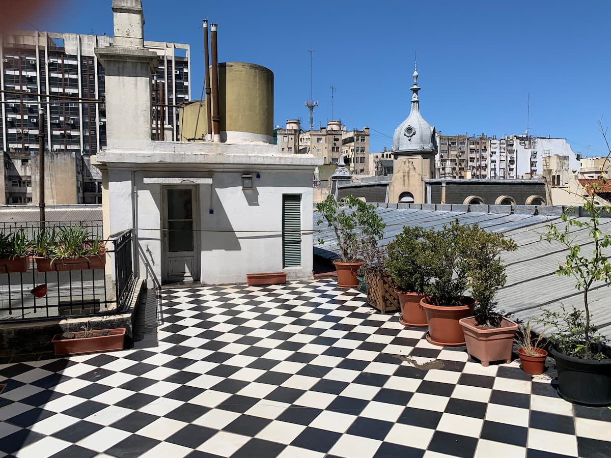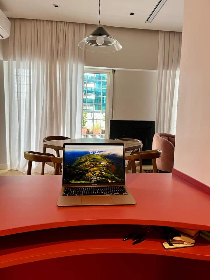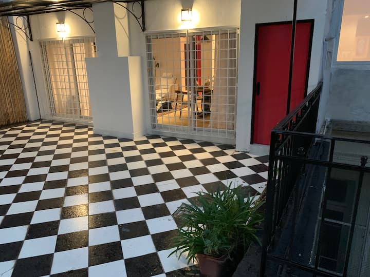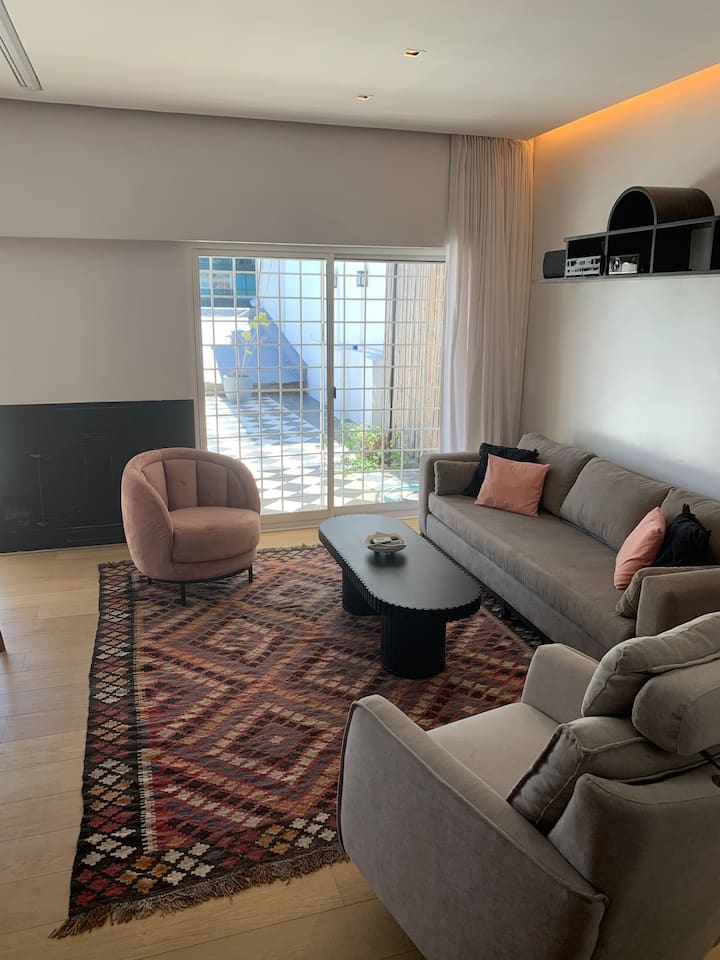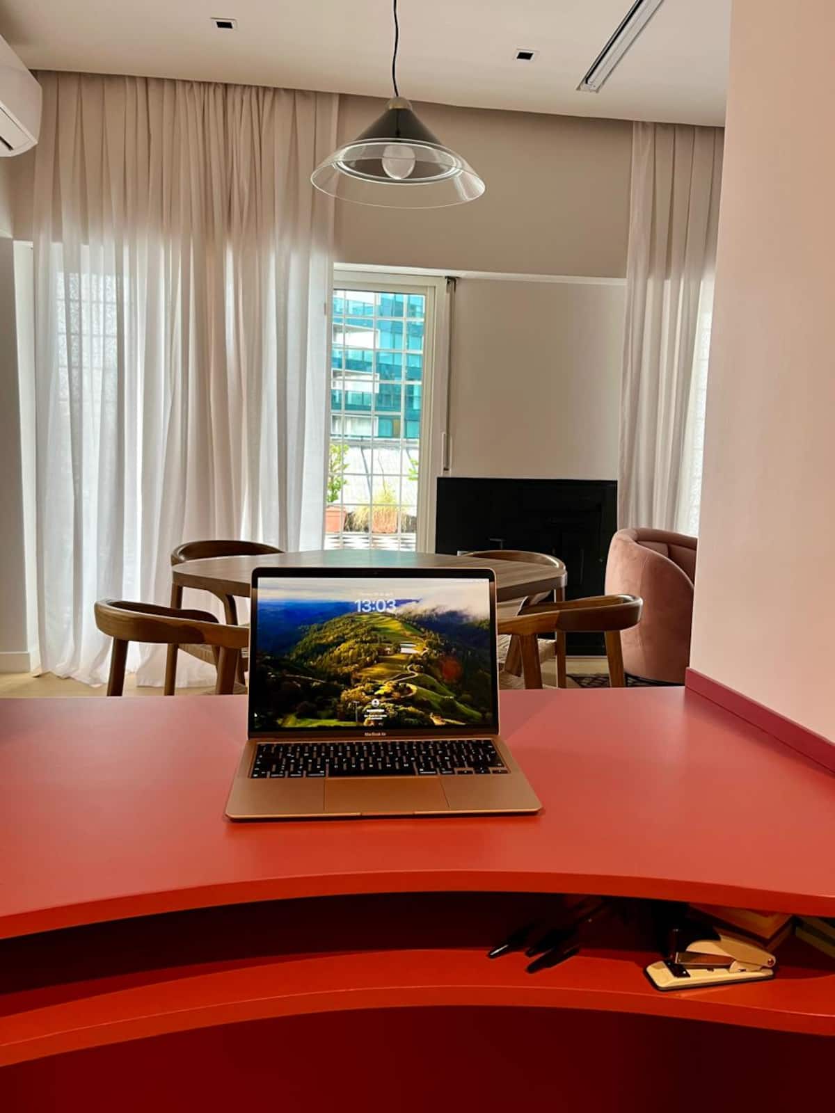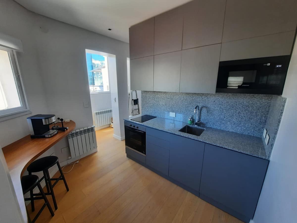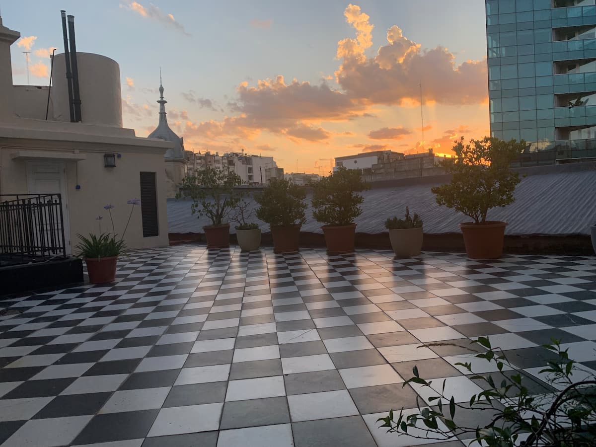 Loft no último andar com 68 m² em Retiro, com área de dormir na parte de trás que pode ser totalmente separada por cortinas móveis do teto ao chão. A área de estar inclui centro de entretenimento com tela de projeção de 90 polegadas embutida no teto, além de mesa de trabalho com vista para a varanda. A entrada dá acesso a uma varanda privativa de 68 m² com portas de correr de vidro; a unidade tem armários e banheiro principal junto à área de dormir, além de lavabo e lavanderia com máquina de lav