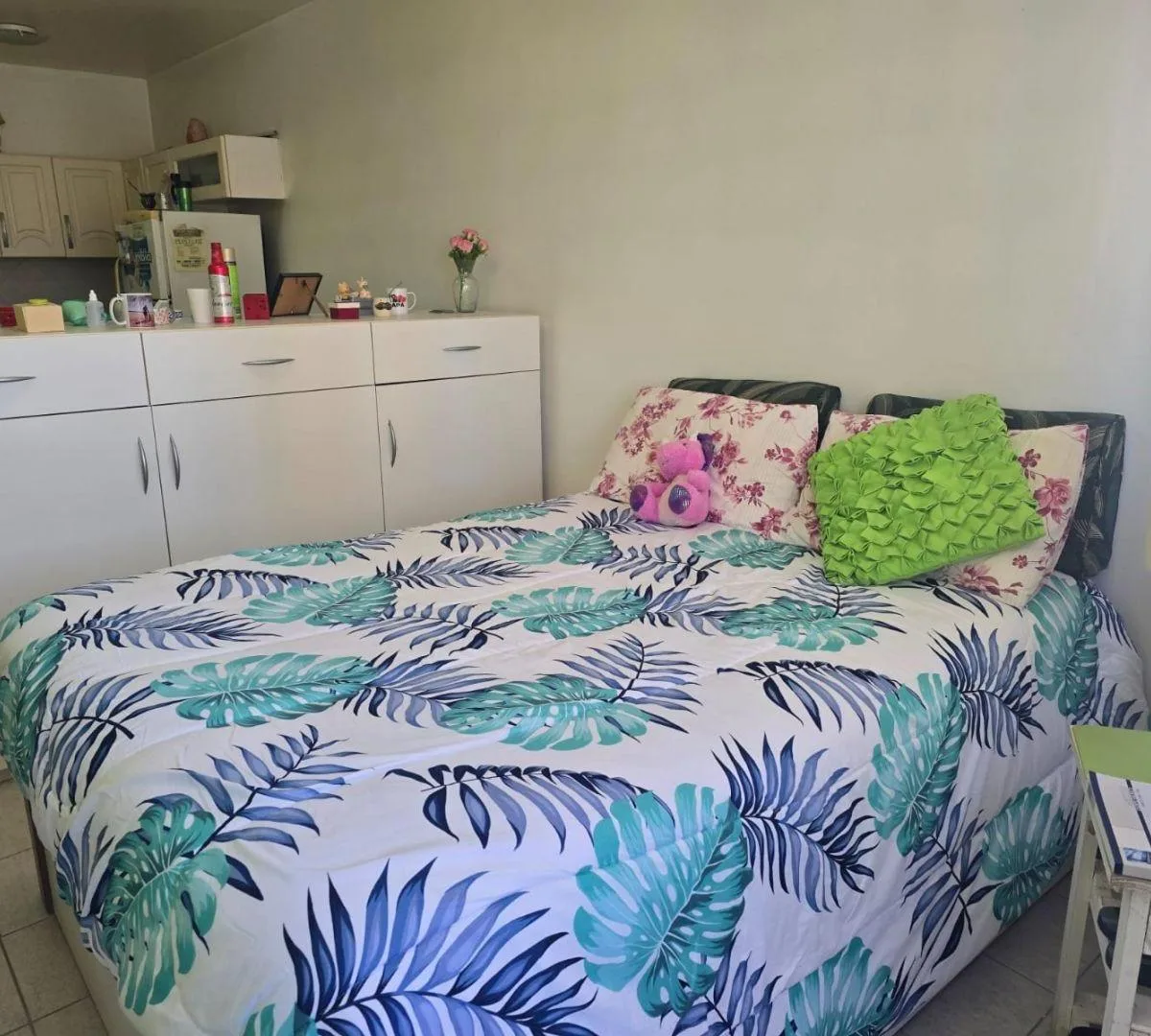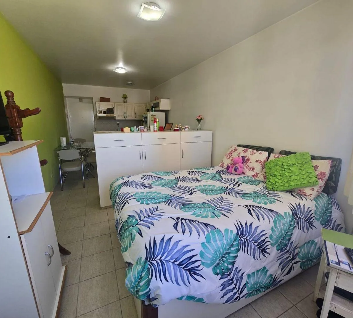 Kitnet mobiliado em San Miguel, no edifício Ibiza II. Possui cozinha integrada à área de jantar, com armário sob a bancada, armários aéreos, fogão, geladeira, sofá e móvel separado tipo roupeiro, além de cama de 2 praças com espaço de armazenamento e gavetas. Inclui banheiro completo. O prédio tem amenities.