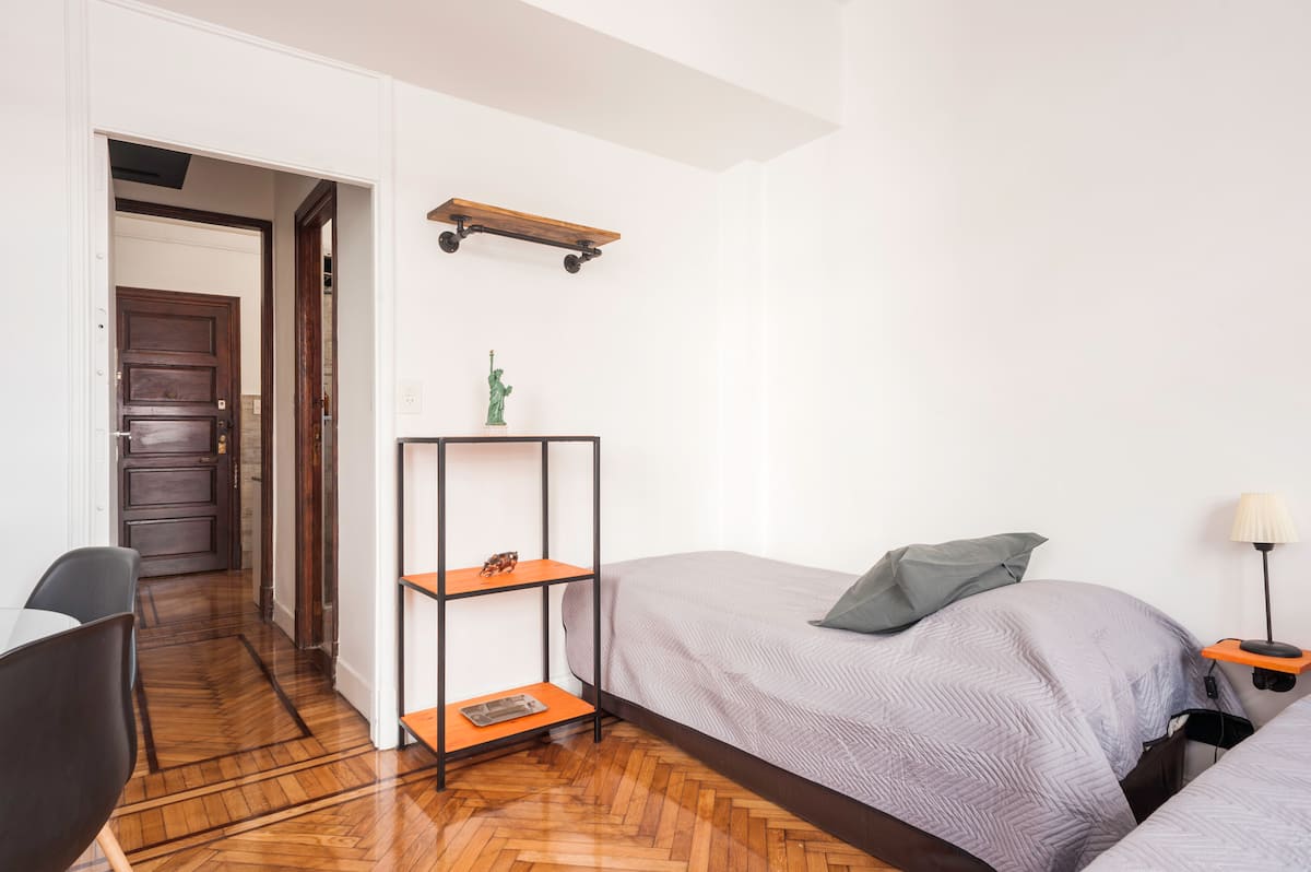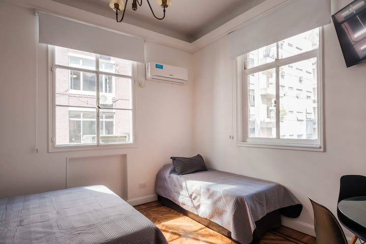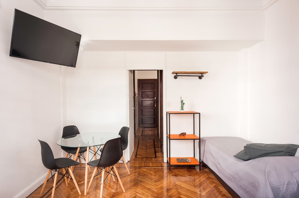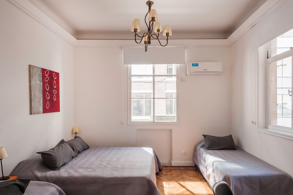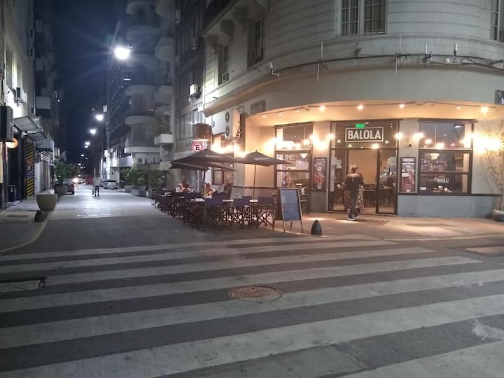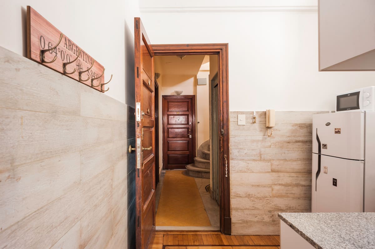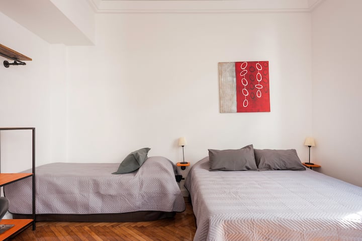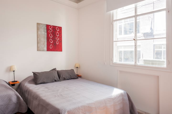 Apartamento em edifício tradicional de estilo francês, em rua de pedestres. Unidade mobiliada com cama queen (1,60 x 1,90) e duas camas de solteiro (0,80 x 1,90), com capacidade máxima para 4 hóspedes. Check-in e check-out são autônomos, com retirada de chave em um cofre com código. Há estação de metrô a 100 metros e estacionamento disponível em áreas próximas; também é mencionado um local para deixar o carro na rua em Puerto Madero, a 6 quarteirões.