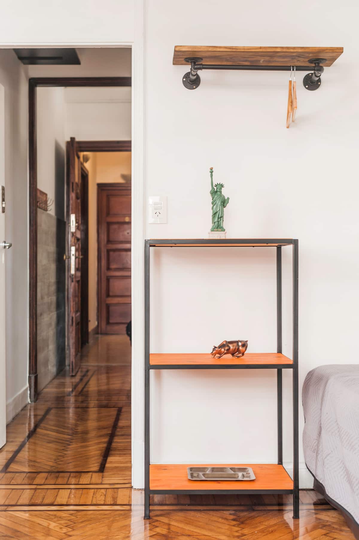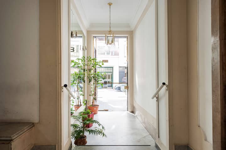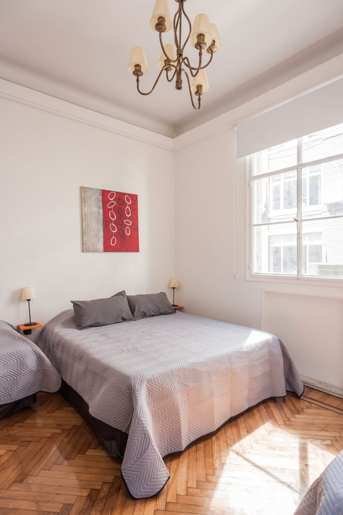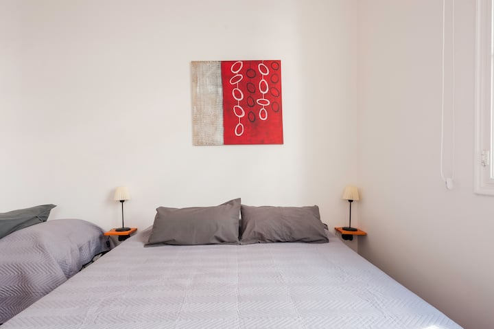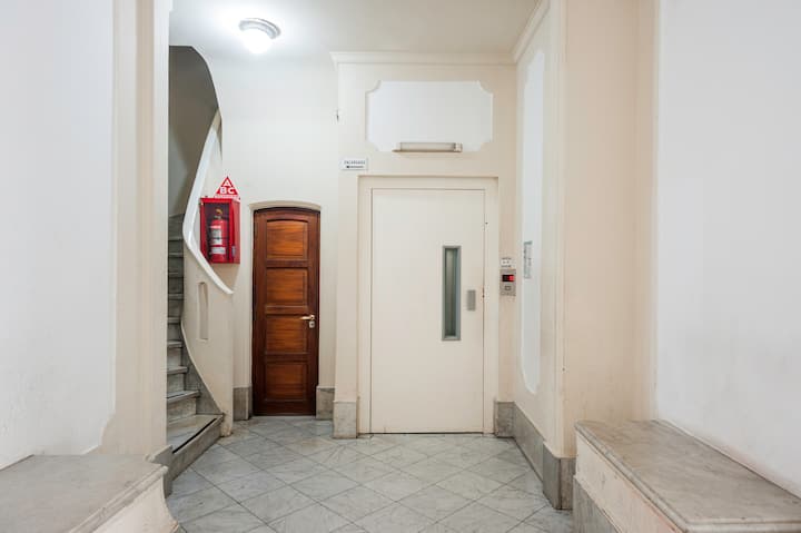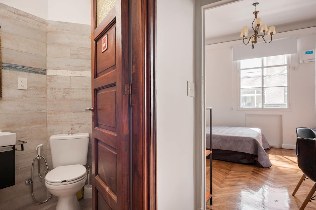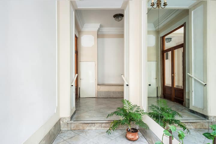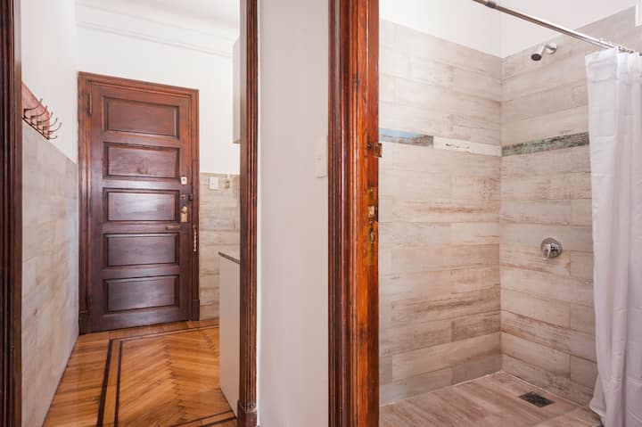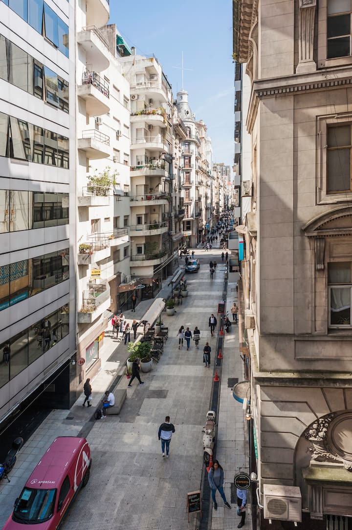 Apartamento em edifício tradicional de estilo francês, em rua de pedestres. Unidade mobiliada com cama queen (1,60 x 1,90) e duas camas de solteiro (0,80 x 1,90), com capacidade máxima para 4 hóspedes. Check-in e check-out são autônomos, com retirada de chave em um cofre com código. Há estação de metrô a 100 metros e estacionamento disponível em áreas próximas; também é mencionado um local para deixar o carro na rua em Puerto Madero, a 6 quarteirões.