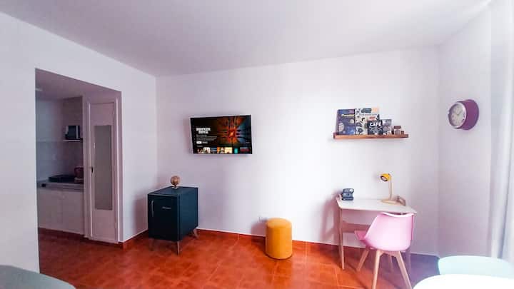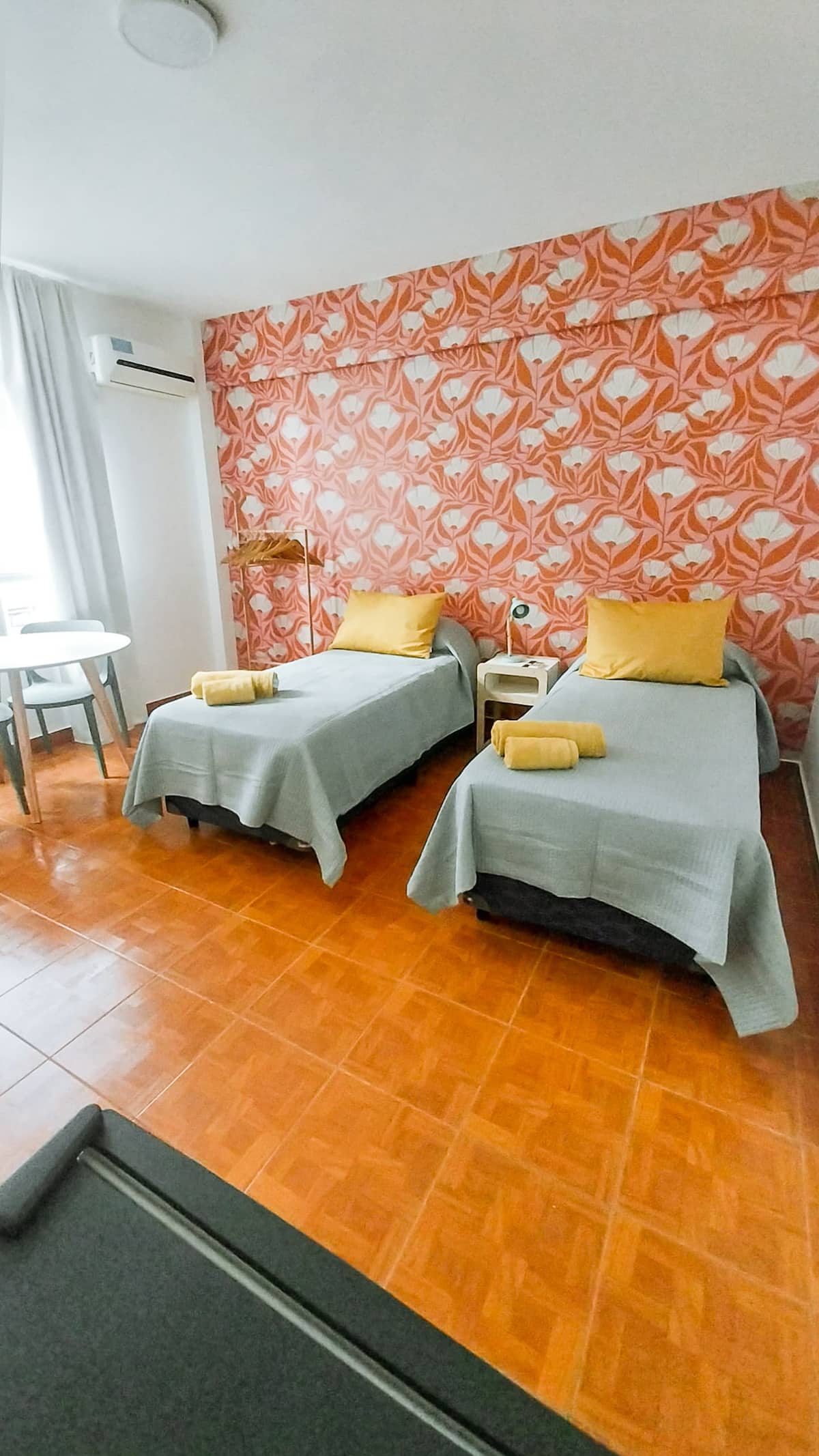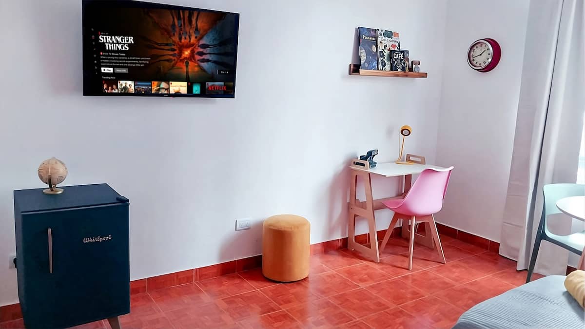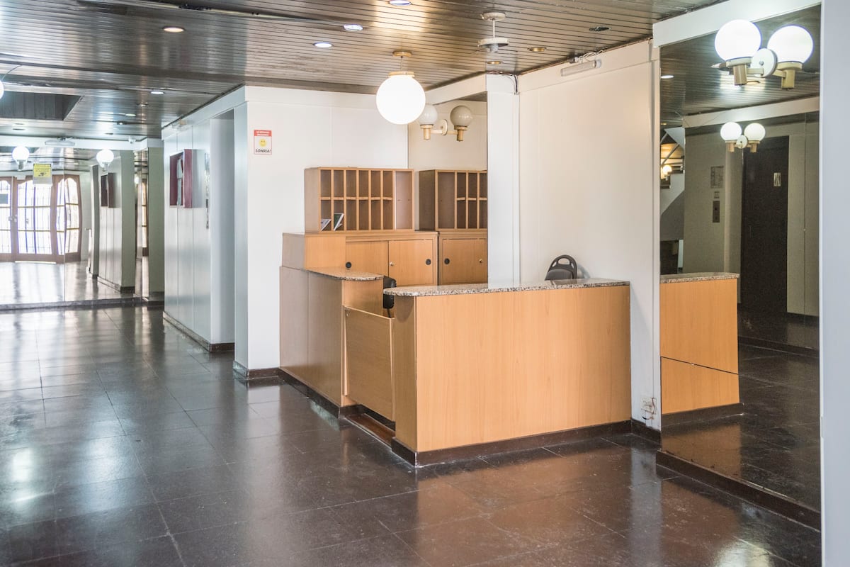Apartamento estúdio de 28 m² em andar alto, acima da Avenida Corrientes, em San Nicolás. Fica a uma quadra da Calle Florida, a alguns blocos de Puerto Madero e próximo de San Telmo. Tem duas camas de solteiro que podem ser unidas para formar uma cama de casal, ar-condicionado (quente/frio), cozinha compacta com fogão elétrico de 2 bocas, micro-ondas, torradeira, chaleira elétrica e cafeteira de gotejamento, além de geladeira, Smart TV de 43" com Netflix, Wi-Fi, secador de cabelo e ferro de passa