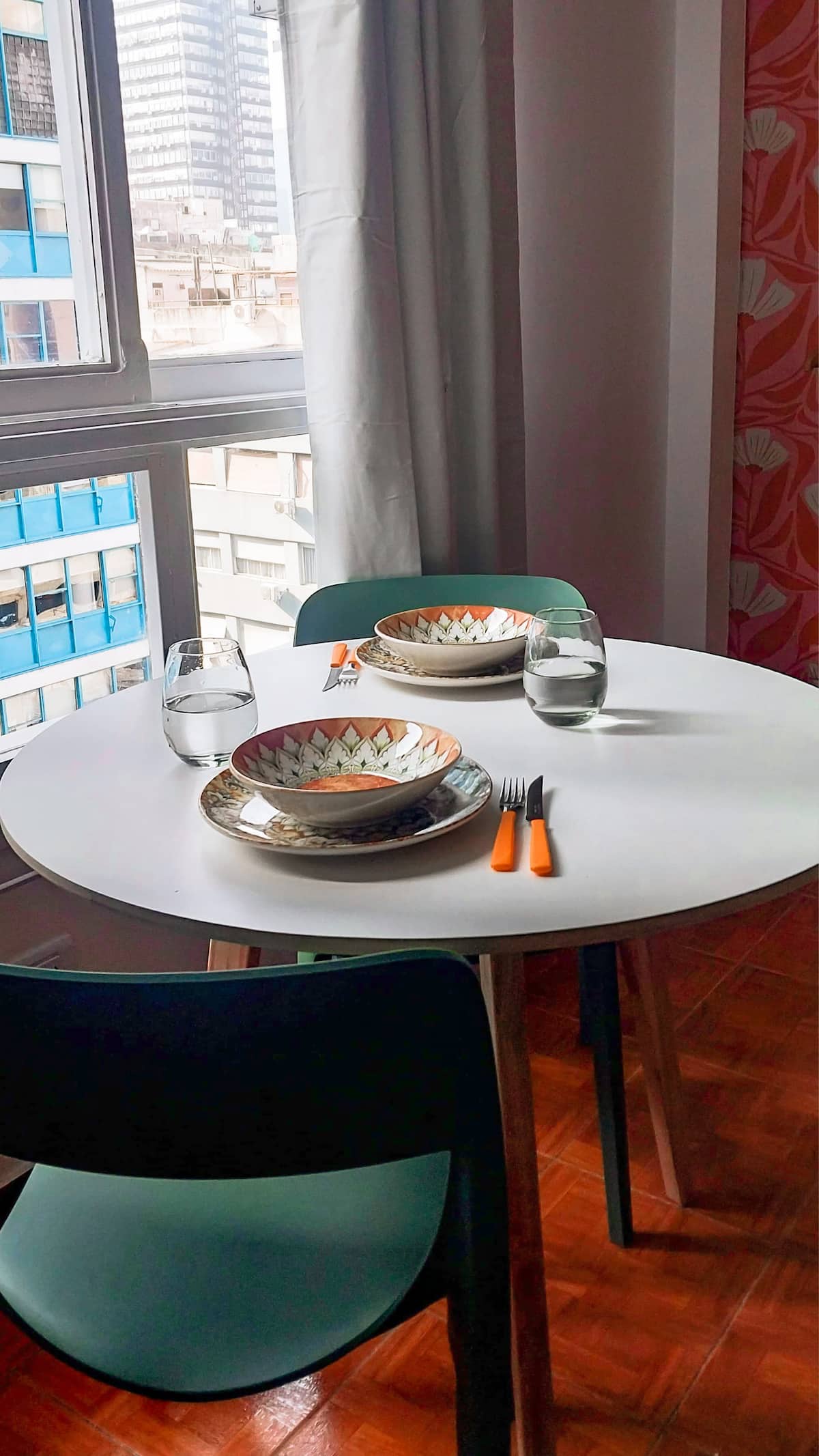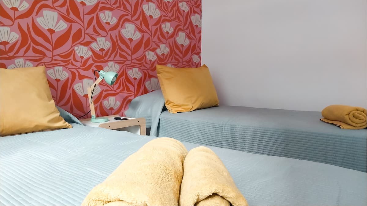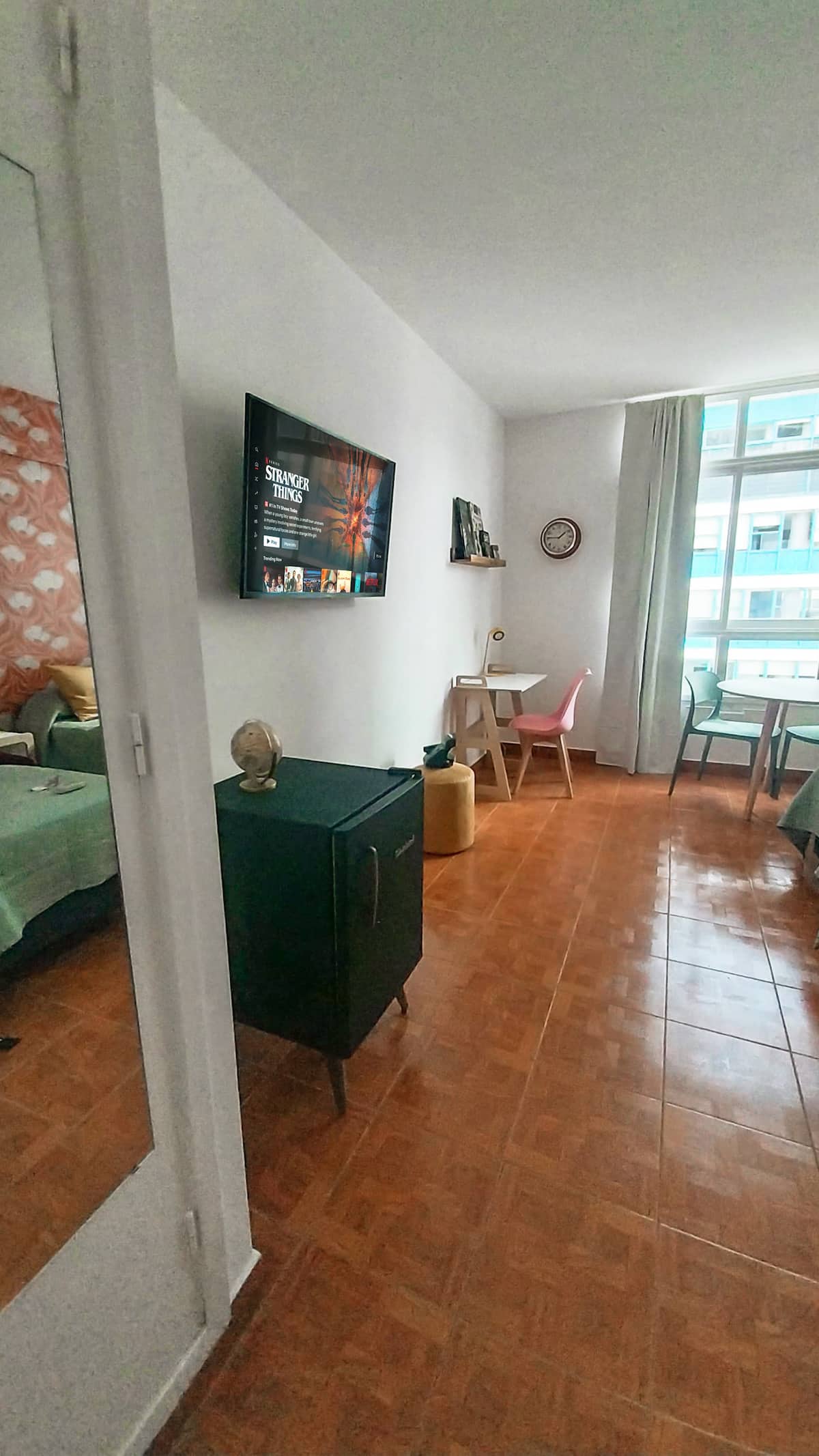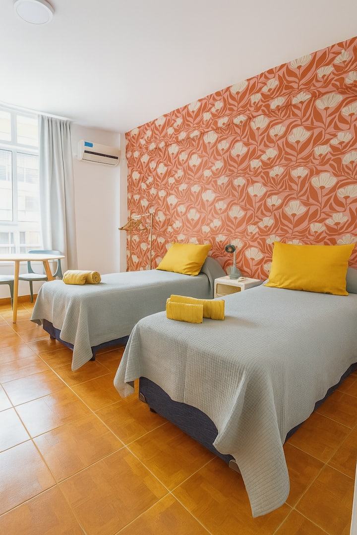 Apartamento estúdio de 28 m² em andar alto, acima da Avenida Corrientes, em San Nicolás. Fica a uma quadra da Calle Florida, a alguns blocos de Puerto Madero e próximo de San Telmo. Tem duas camas de solteiro que podem ser unidas para formar uma cama de casal, ar-condicionado (quente/frio), cozinha compacta com fogão elétrico de 2 bocas, micro-ondas, torradeira, chaleira elétrica e cafeteira de gotejamento, além de geladeira, Smart TV de 43" com Netflix, Wi-Fi, secador de cabelo e ferro de passa