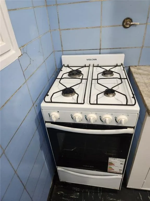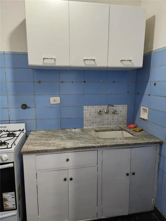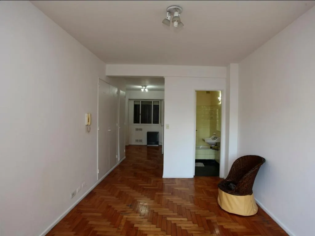 Kitnet de 1 ambiente de fundos, com varanda aberta. Conta com banheiro e cozinha completa, em bom estado, recém-pintado e com piso plastificado. O hall mede 3x2 e o living 5x3; a cozinha mede 2x1,80. O condomínio tem serviços centrais e vigilância. Não aceita animais de estimação. Fica a meia quadra da Av. Córdoba.