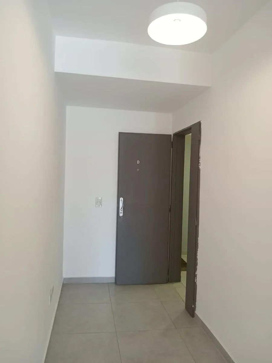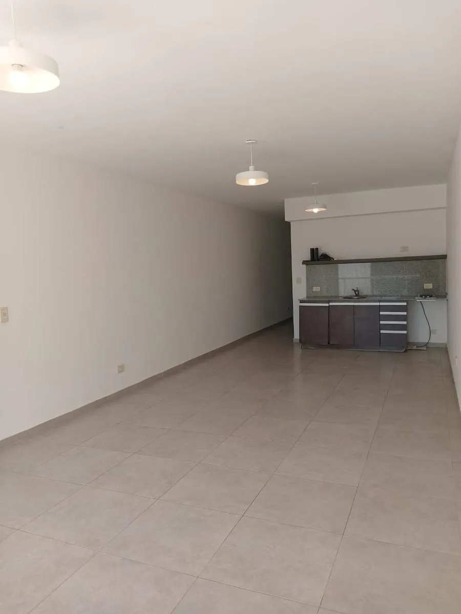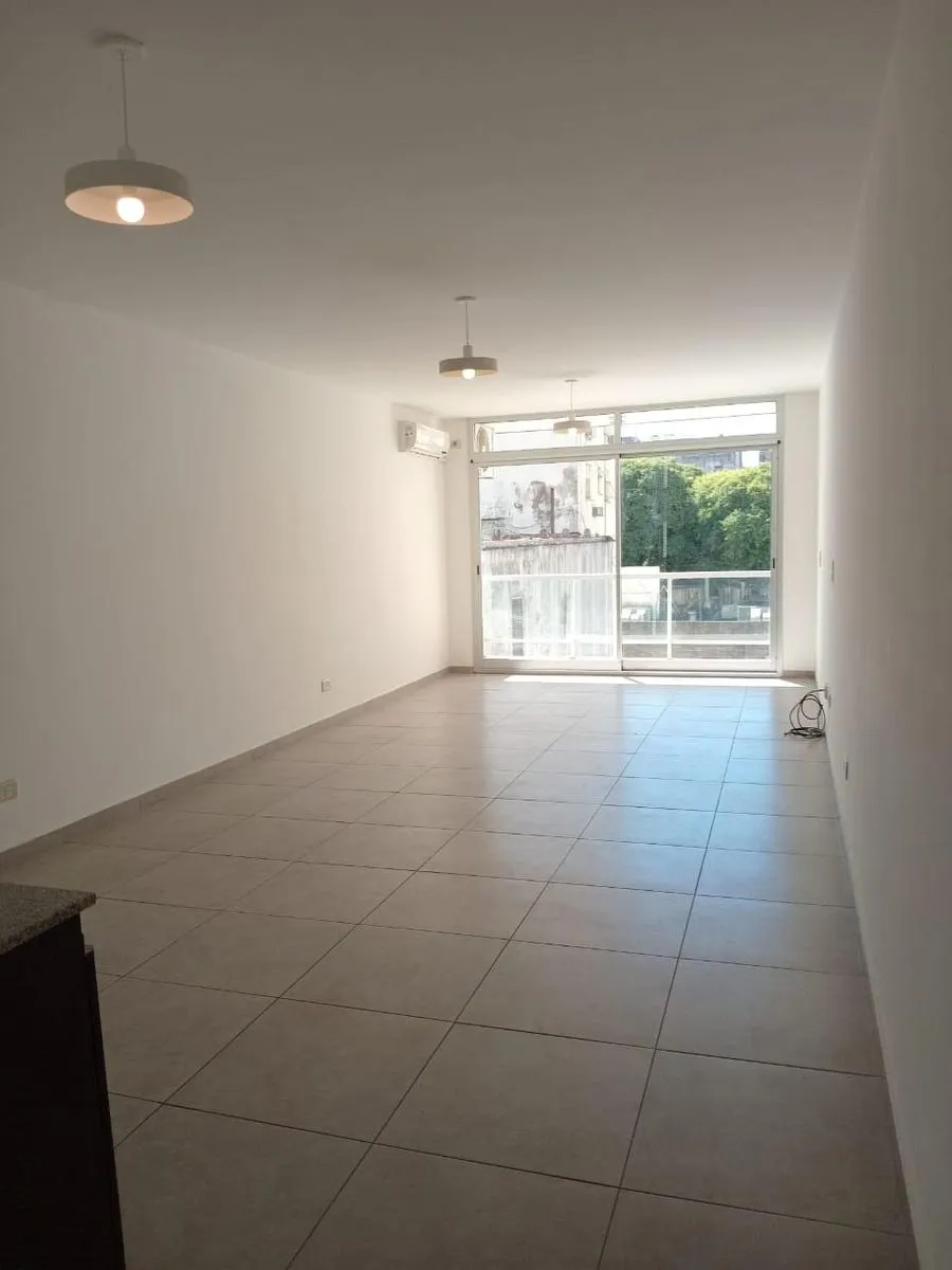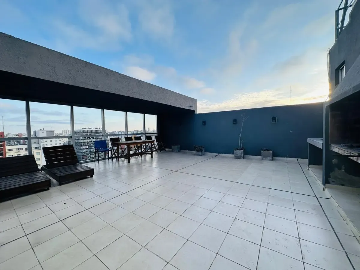 Apartamento monoambiente com 1 ambiente, apto profissional, com hall de entrada. Área principal com piso cerâmico branco e uma janela com acesso a varanda corrida; orientação norte. Cozinha americana com bancada de granito cinza, armários inferiores com alacenas e cooktop elétrico de 2 bocas. Banheiro completo com vanity e banheira, além de ar-condicionado split frio e quente. Condomínio inclui AYSA. Prédio de poucos anos com terraço de uso comum, churrasqueira e lavanderia. Contrato de 2 anos,