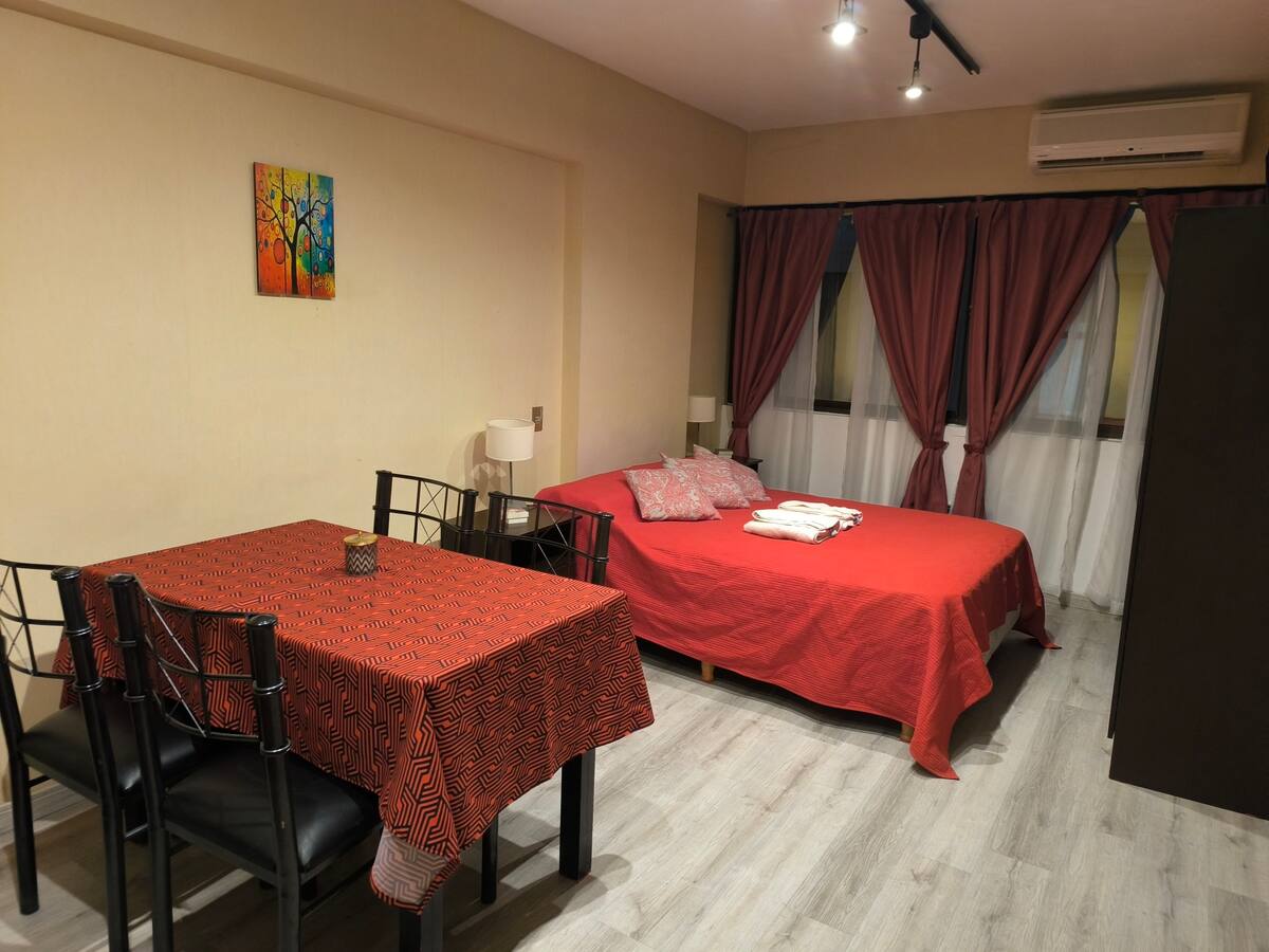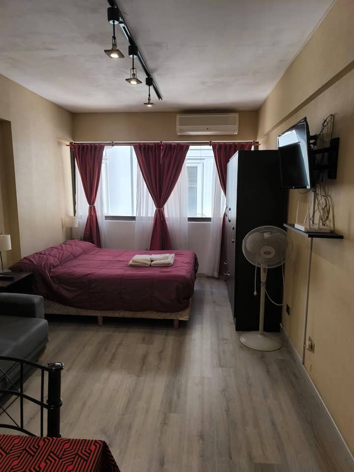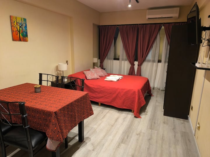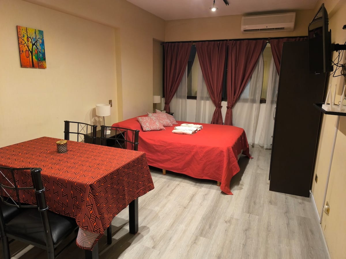 Kitnet em San Nicolás, a 300 metros do Obelisco. Conta com cozinha completa, forno elétrico e geladeira com freezer. Banheiro completo com chuveiro e bidê. Área de refeições com mesa para 4 pessoas, base de cama de 2,5 lugares, sofá e TV com Chromecast, além de ar-condicionado quente e frio.