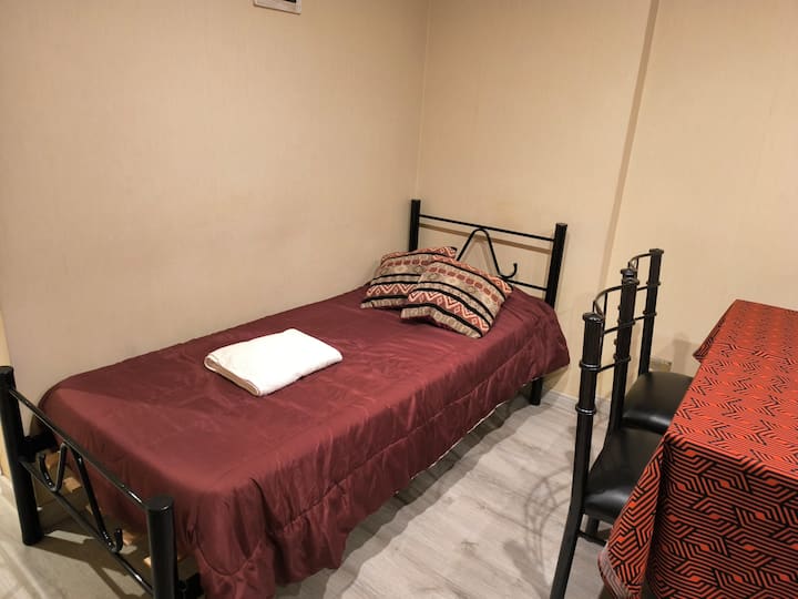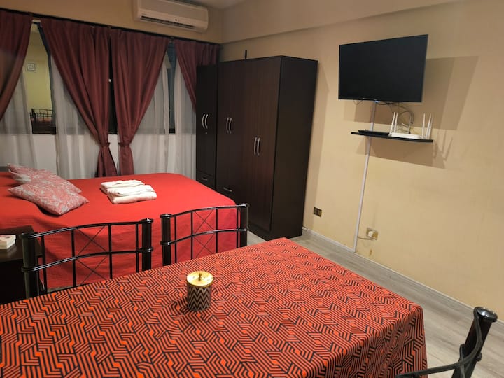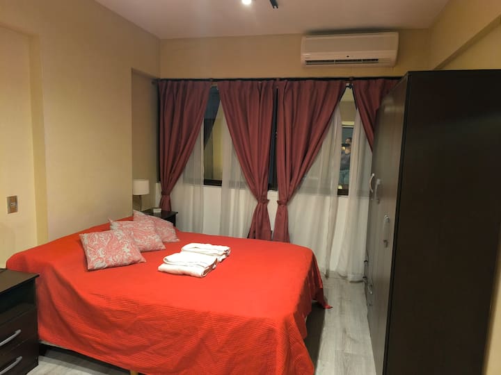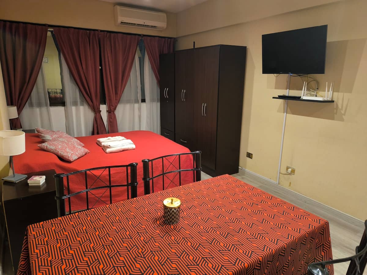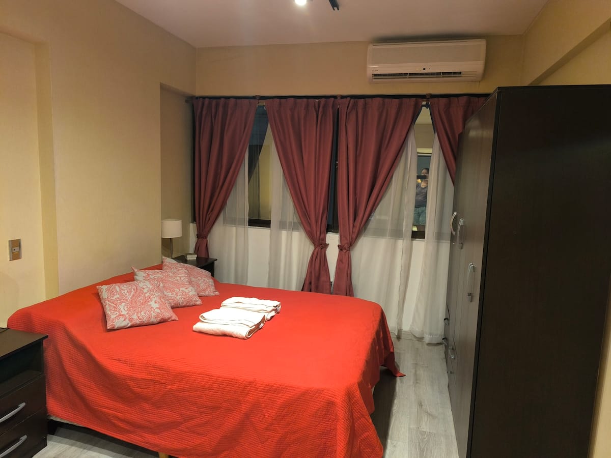 Kitnet em San Nicolás, a 300 metros do Obelisco. Conta com cozinha completa, forno elétrico e geladeira com freezer. Banheiro completo com chuveiro e bidê. Área de refeições com mesa para 4 pessoas, base de cama de 2,5 lugares, sofá e TV com Chromecast, além de ar-condicionado quente e frio.
