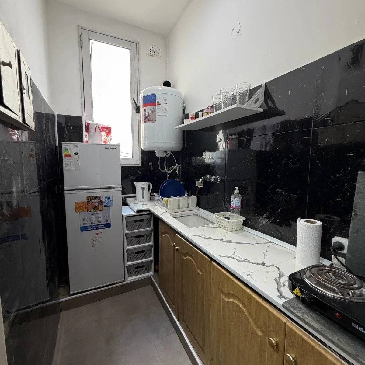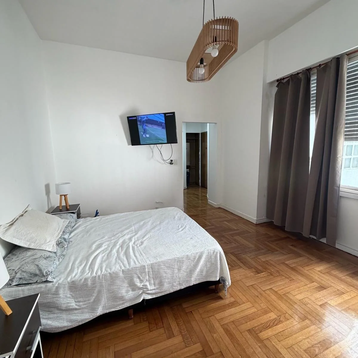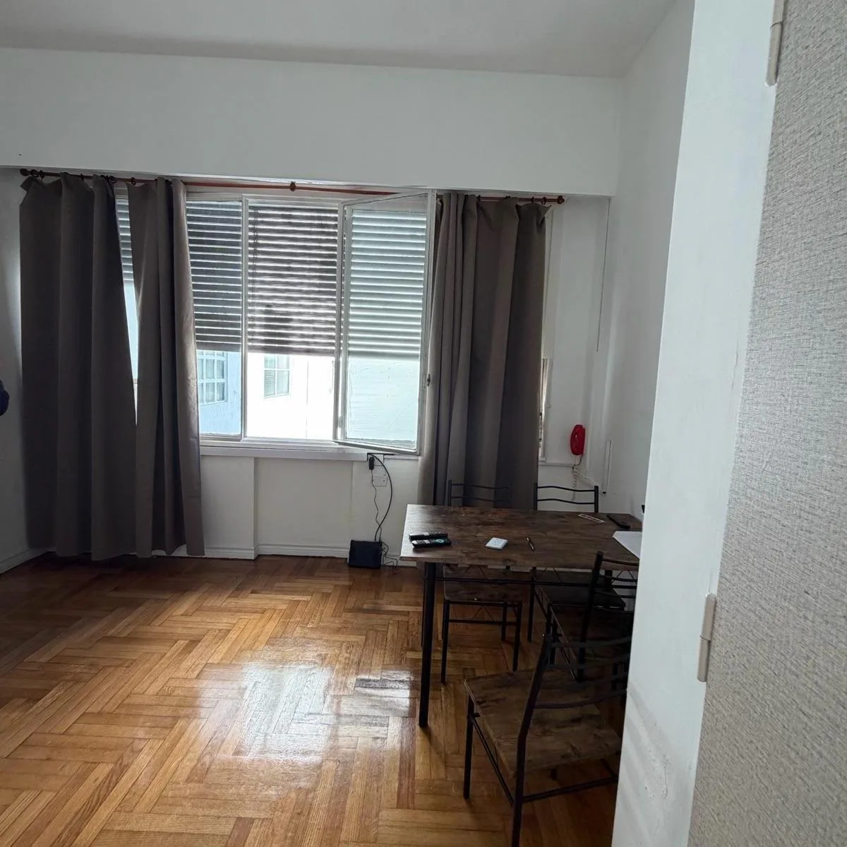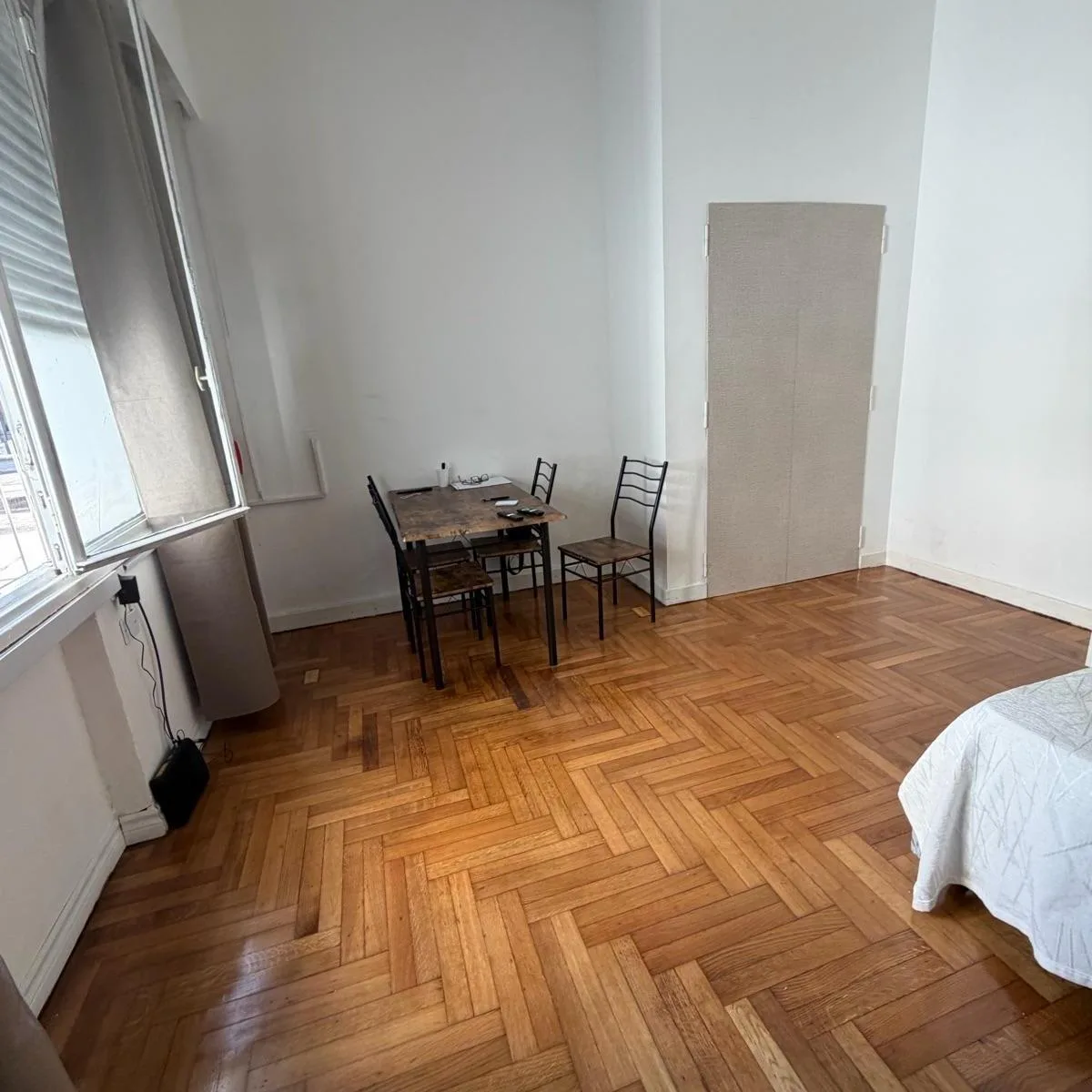 Kitnet de ambiente único no Microcentro, com cozinha separada. O anúncio indica boa luminosidade. O preço inclui internet, luz e cabo, com pack de futebol. Fica a poucos passos da Av. Corrientes, perto de teatros, bares e restaurantes, e com acesso a linhas de ônibus e metrô.