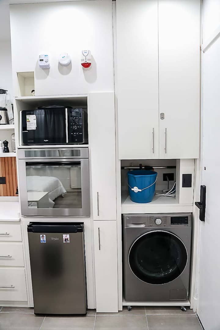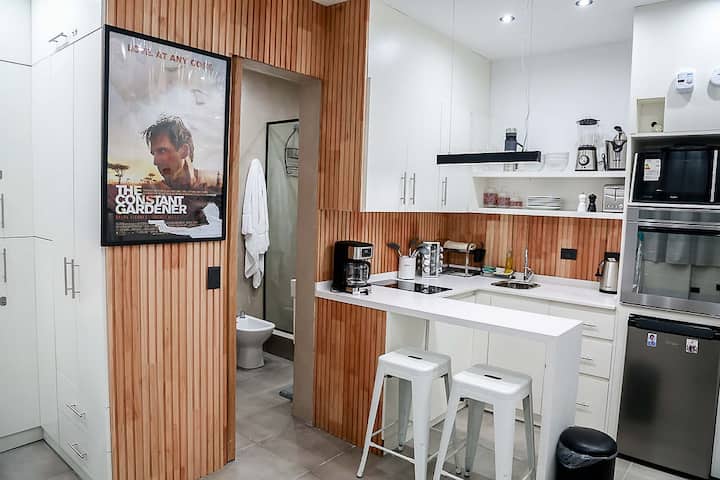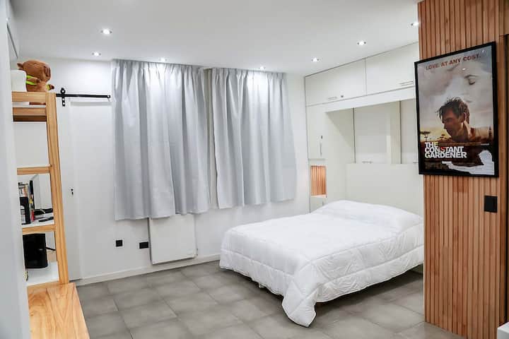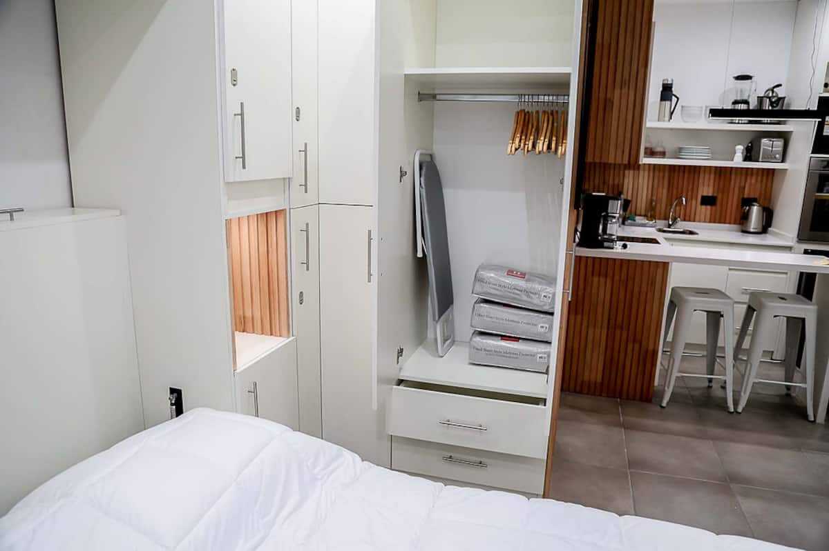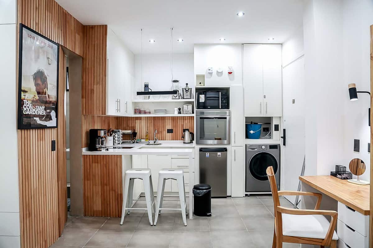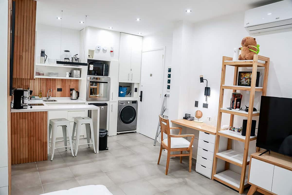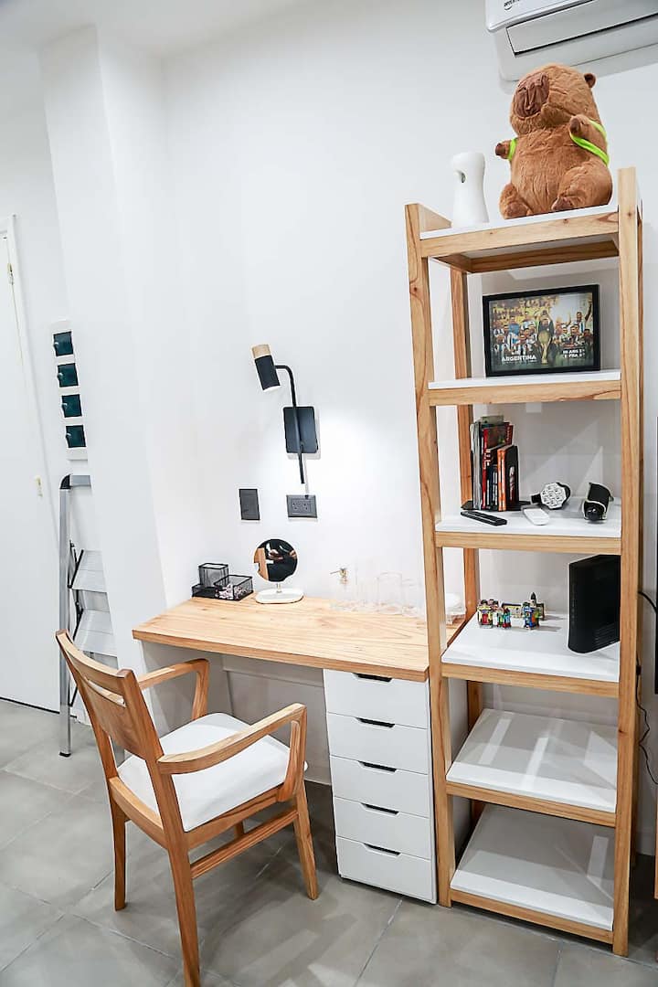 Kitnet mobiliado em San Nicolás, a 5 quadras do Obelisco, no centro de Buenos Aires. Cozinha com minifrigorífico, micro-ondas, cafeteira, chaleira elétrica, forno, fogão e torradeira, além de mesa para refeições. Dormitório com cama queen e roupa de cama, banheiro com bidê e itens de higiene, incluindo secador, condicionador e shampoo; ar-condicionado, TV smart 4K, wi-fi e TV a cabo, além de máquina de lavar, ferro e mesa de trabalho.