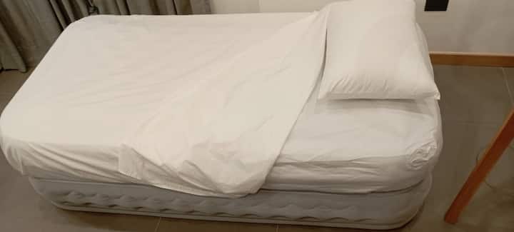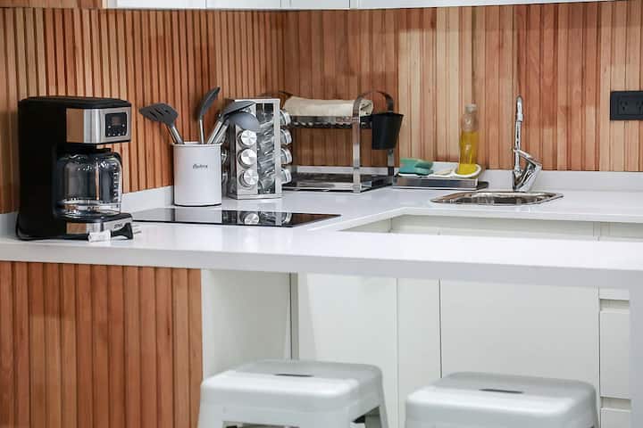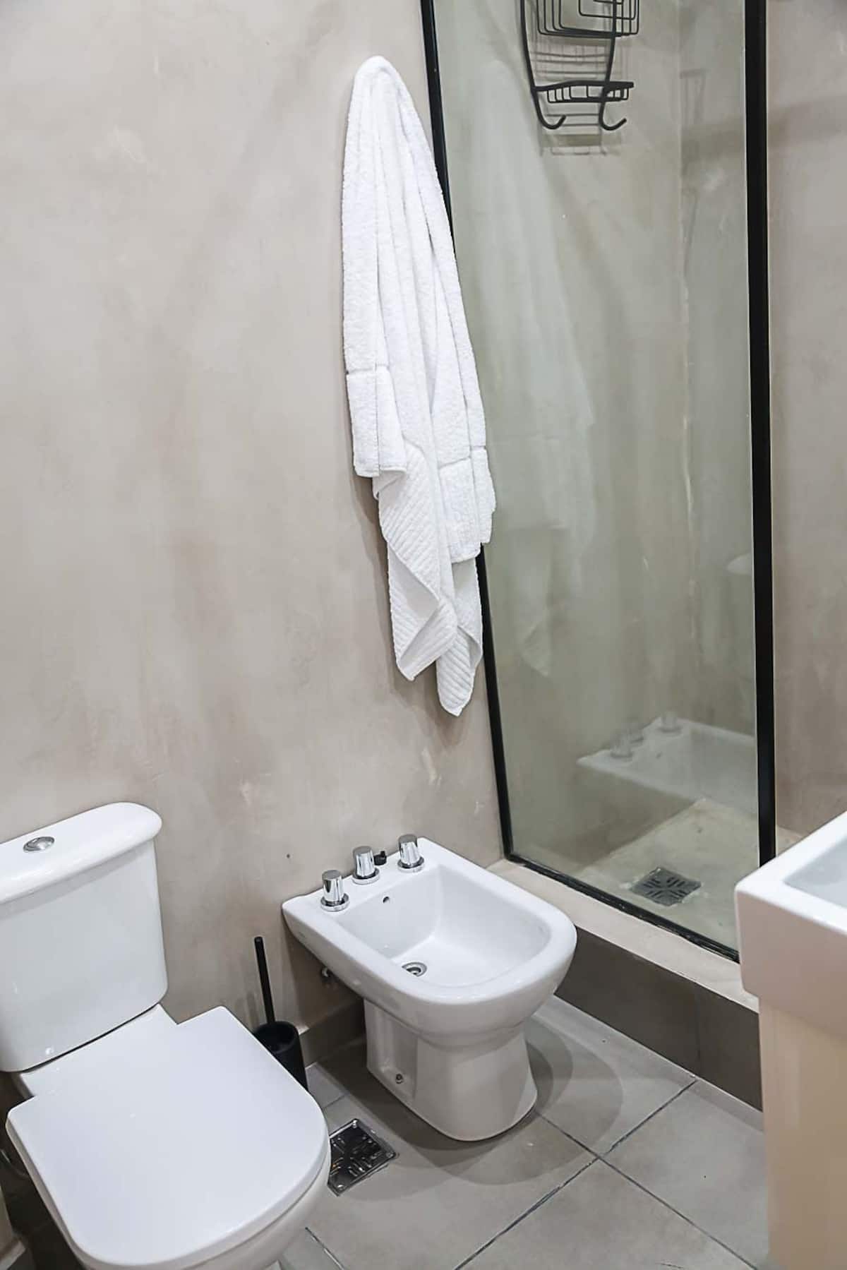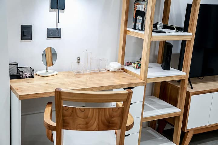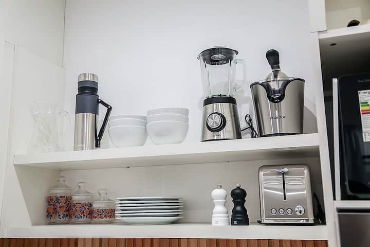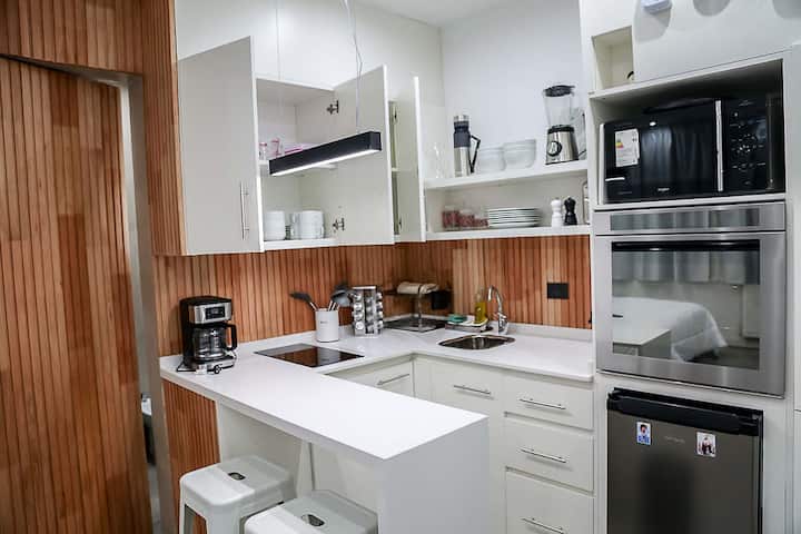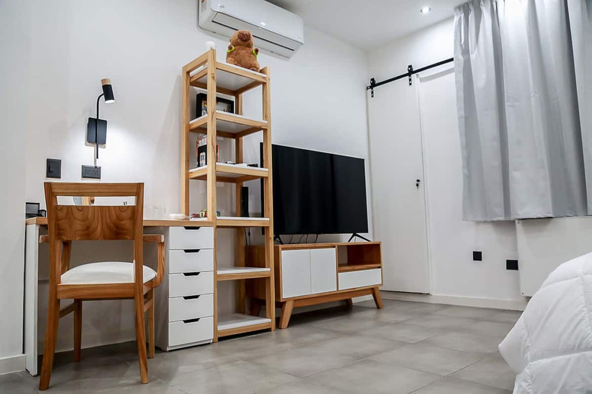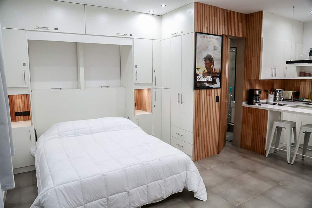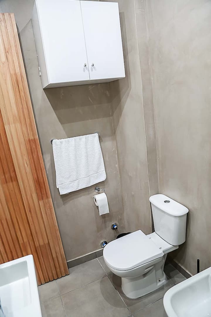 Kitnet mobiliado em San Nicolás, a 5 quadras do Obelisco, no centro de Buenos Aires. Cozinha com minifrigorífico, micro-ondas, cafeteira, chaleira elétrica, forno, fogão e torradeira, além de mesa para refeições. Dormitório com cama queen e roupa de cama, banheiro com bidê e itens de higiene, incluindo secador, condicionador e shampoo; ar-condicionado, TV smart 4K, wi-fi e TV a cabo, além de máquina de lavar, ferro e mesa de trabalho.