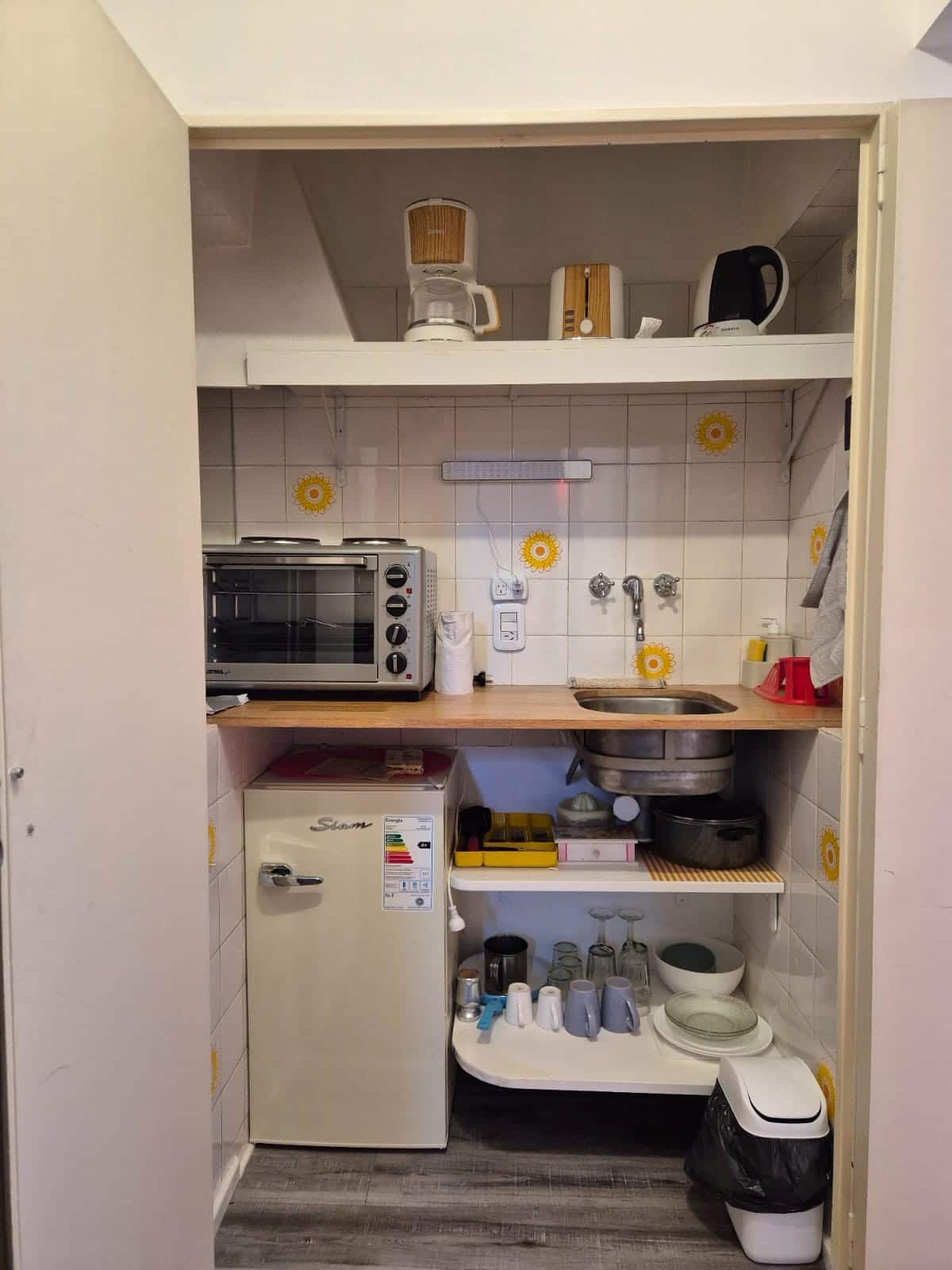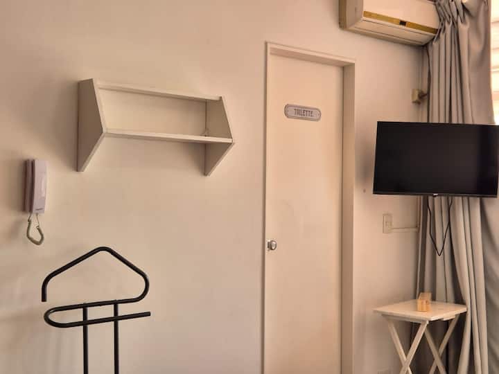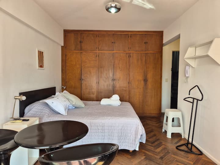 Apartamento tipo studio em San Nicolás, na área do El Obelisco, com varanda/terraço. Foi reformado recentemente. Dispõe de cozinha totalmente equipada com eletrodomésticos, uma cama de 1,40 m x 1,90 m, armário, TV smart de 32 polegadas e ar-condicionado split frio. Banheiro completo com banheira. Há lavanderia e garagem paga em frente ao imóvel. Fica a 2 quarteirões (200 m) da Calle Corriente e a 5 quarteirões (500 m) do Obelisco.