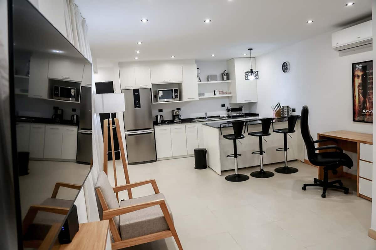 Studio mobiliado e totalmente equipado em Buenos Aires, a 5 quadras do Obelisco. O espaço conta com cama queen e roupa de cama; banheiro com bidê e itens de higiene, além de secador de cabelo e condicionador. A cozinha tem geladeira, lava-louças, micro-ondas, cafeteira, chaleira elétrica, forno, fogão e torradeira, com mesa de jantar. Há TV Smart 4K, TV a cabo, Wi-Fi e ar-condicionado, além de mesa de trabalho, ferro, secador de cabelo, kit de primeiros socorros e itens de lavanderia. A tarifa i