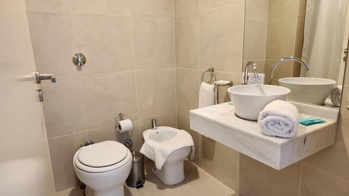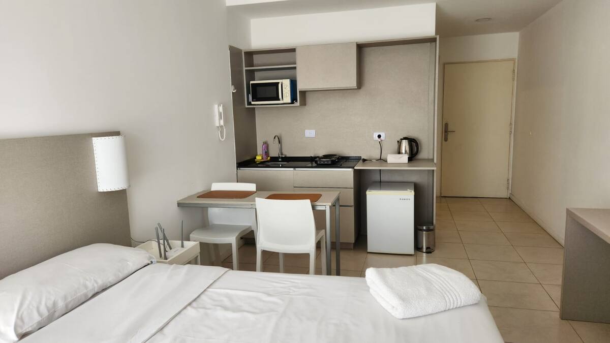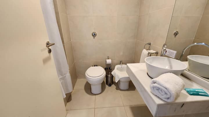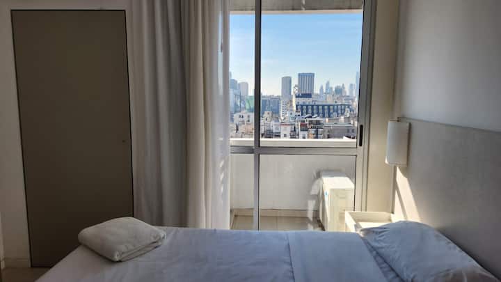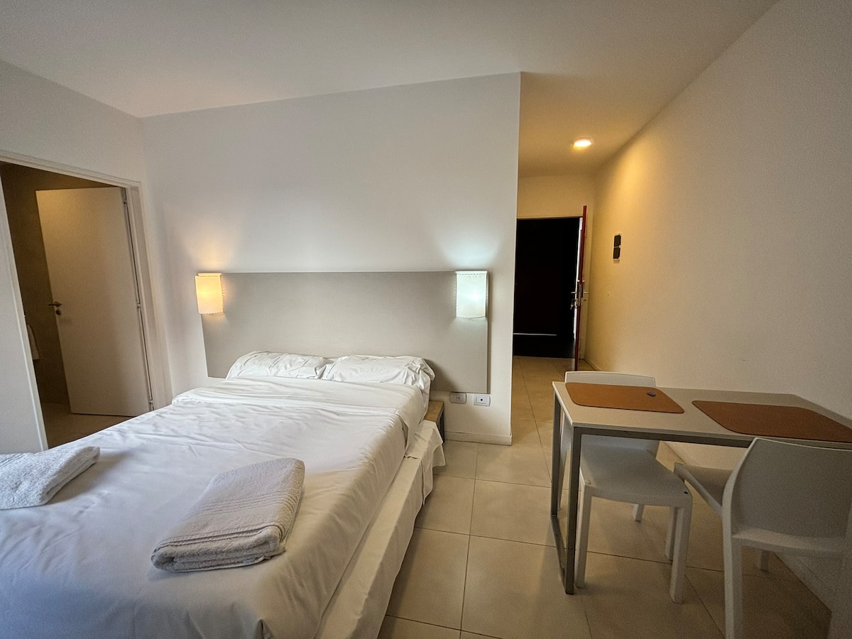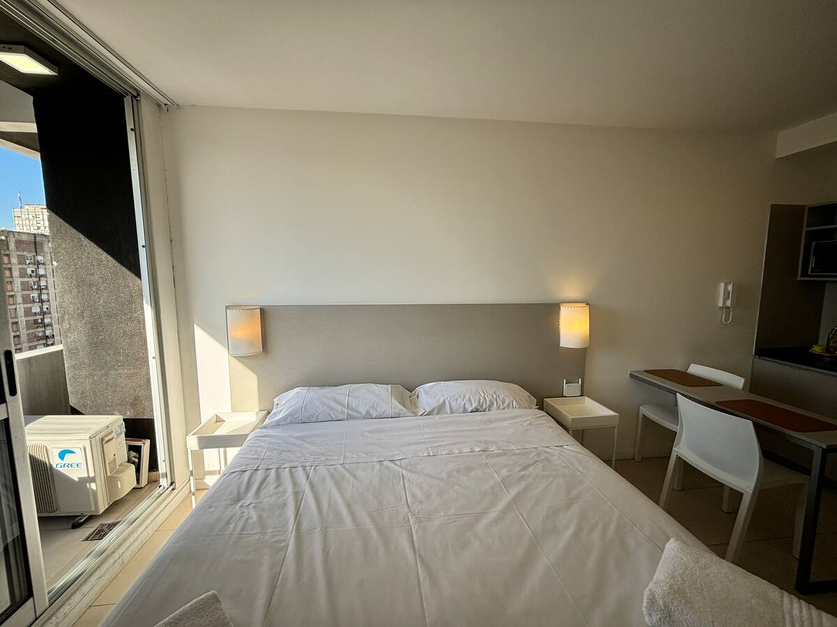 Studio em um edifício inaugurado em março de 2018, com varanda. Há cama de casal, área com mesa/desk e cadeiras, cozinha com utensílios e louça, geladeira e banheiro privativo com banheira. O metrô (linhas A, B, C e H) fica a poucos metros de Bartolomé Mitre 1444, e a Avenida de Mayo fica a 150 metros. Starbucks a 200 metros e Plaza de Mayo e Cabildo a 900 metros.