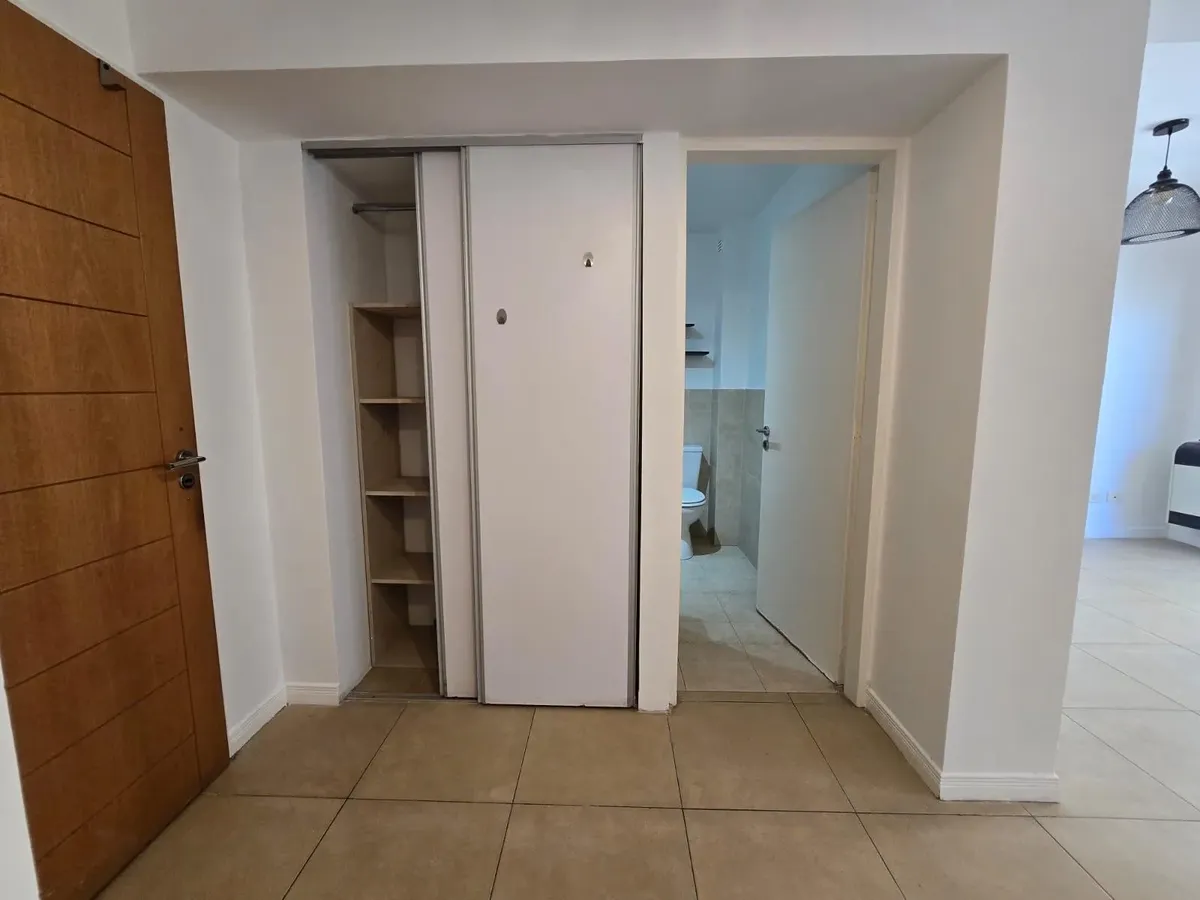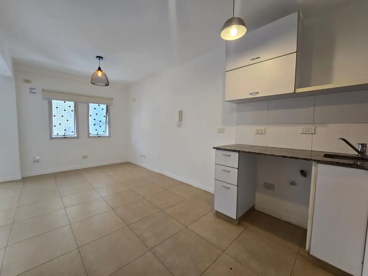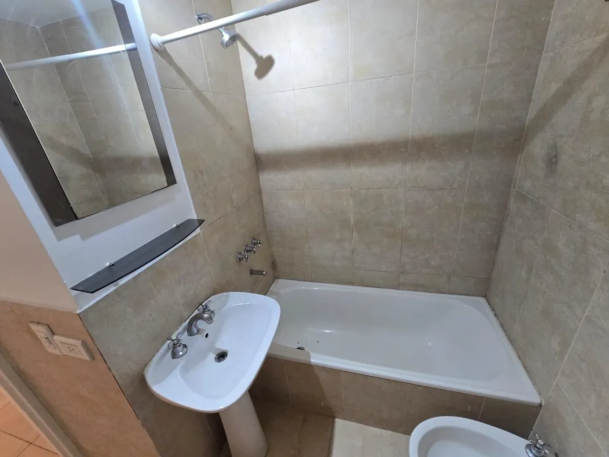 Apartamento de um ambiente com armário embutido em Caseros, com possibilidade de separar o espaço de dormir. A cozinha tem aquecedor elétrico (termotanque) e fogão a gás natural, com móveis de alacena e base. Há banheiro completo, aquecimento por estufa a gás de chaminé balanceada e varanda semicoberta com rede de proteção. O edifício conta com salão de festas (SUM) e piscina. Para entrar, é exigida garantia do tipo proprietária, Finaer ou Garantia Ya, além de comprovantes de renda.