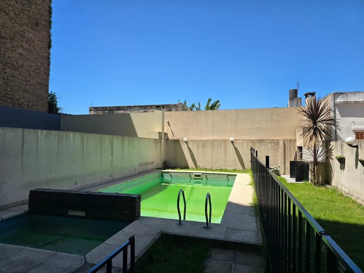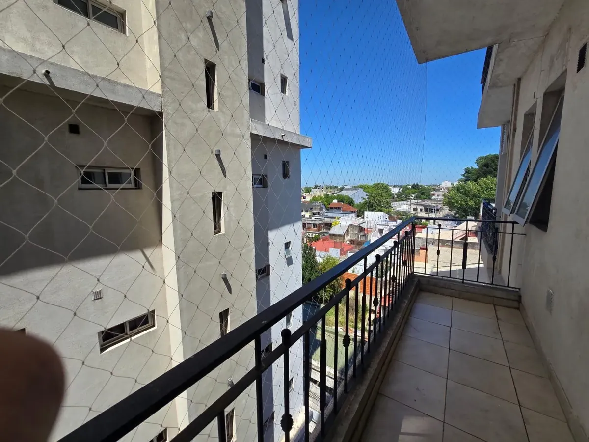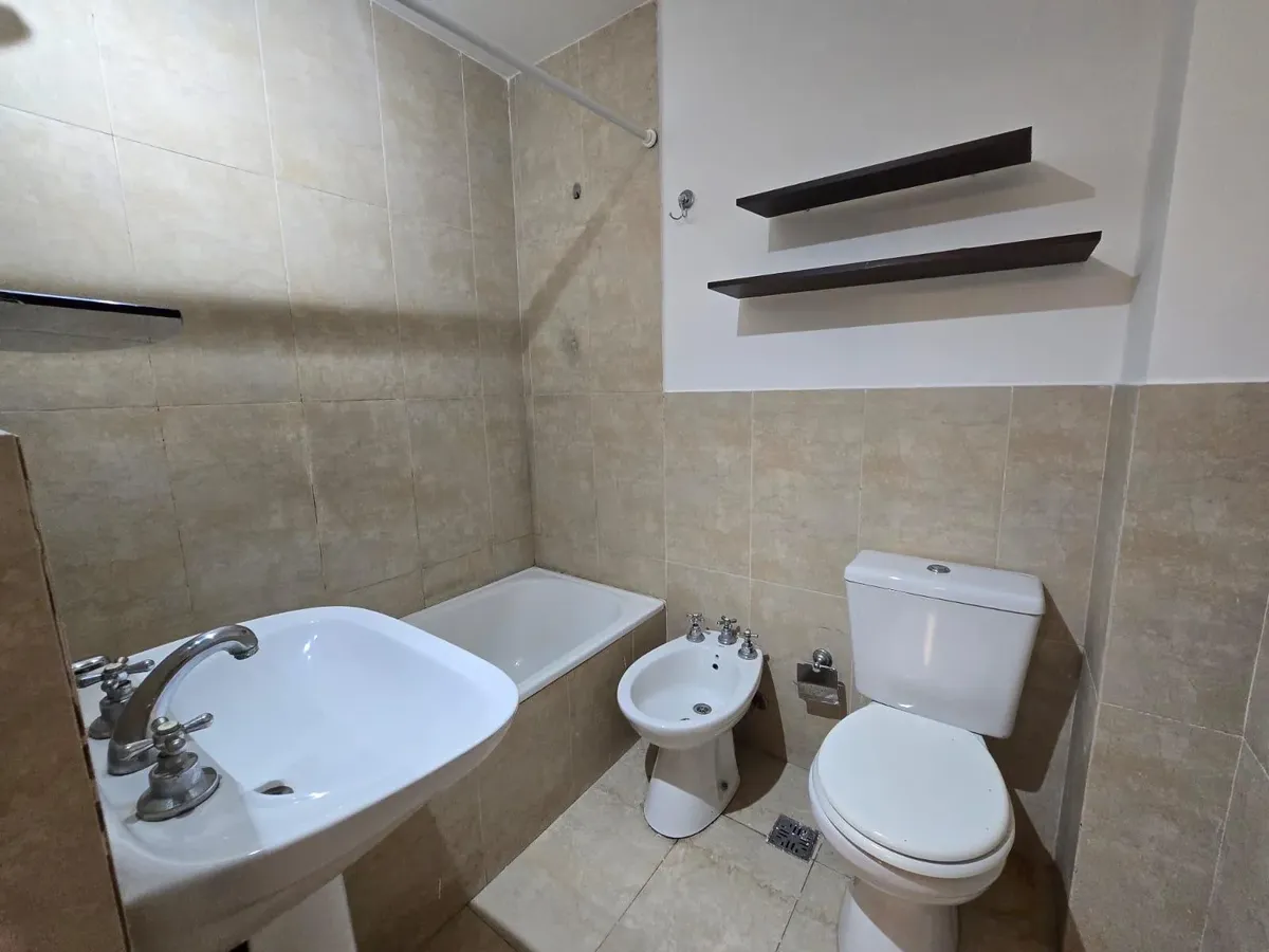 Apartamento de um ambiente com armário embutido em Caseros, com possibilidade de separar o espaço de dormir. A cozinha tem aquecedor elétrico (termotanque) e fogão a gás natural, com móveis de alacena e base. Há banheiro completo, aquecimento por estufa a gás de chaminé balanceada e varanda semicoberta com rede de proteção. O edifício conta com salão de festas (SUM) e piscina. Para entrar, é exigida garantia do tipo proprietária, Finaer ou Garantia Ya, além de comprovantes de renda.