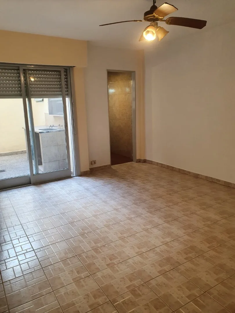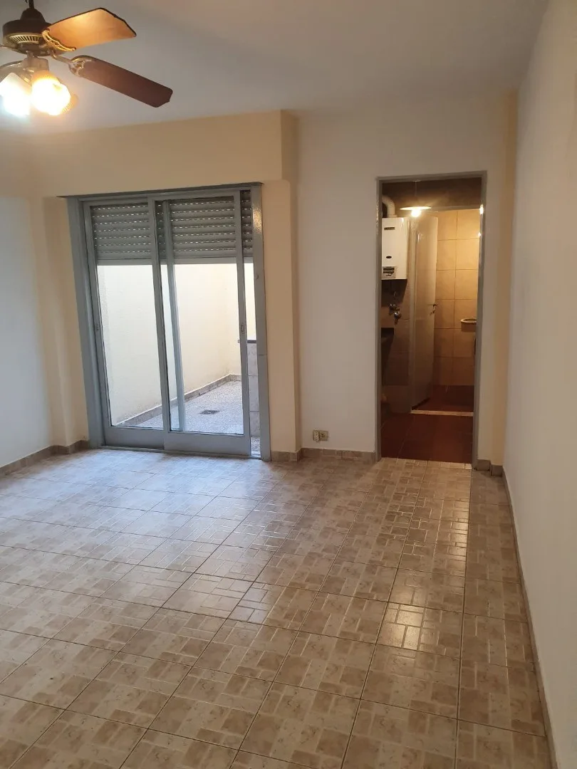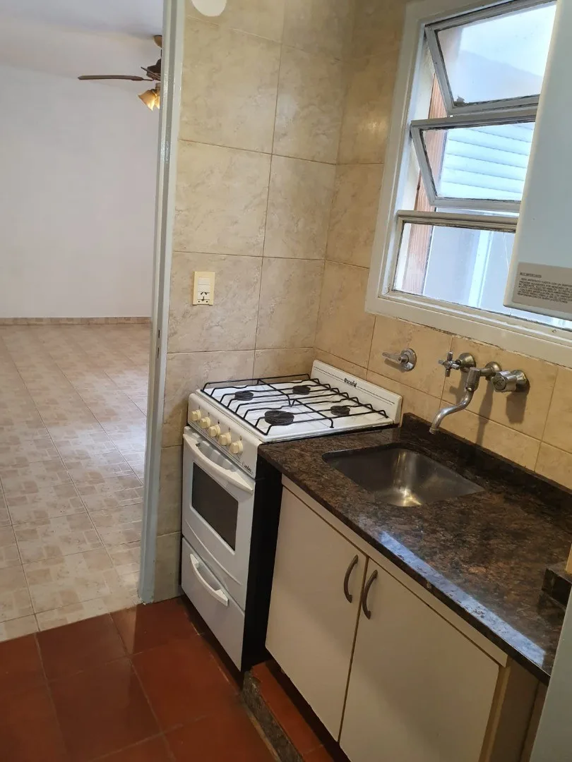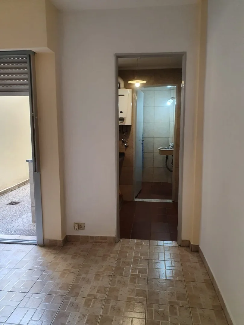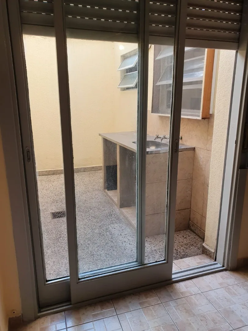 Apartamento de 1 ambiente com pátio em andar térreo. A planta baixa tem ambiente com portas de correr para acesso ao pátio, com bancada em aço inox, pia e conexão para lavadora. Cozinha independente com armário inferior em mármore e aquecedor a gás (calefón); banheiro com chuveiro. Aceita animais de estimação. Disponível para ocupação a partir de junho de 2026.
