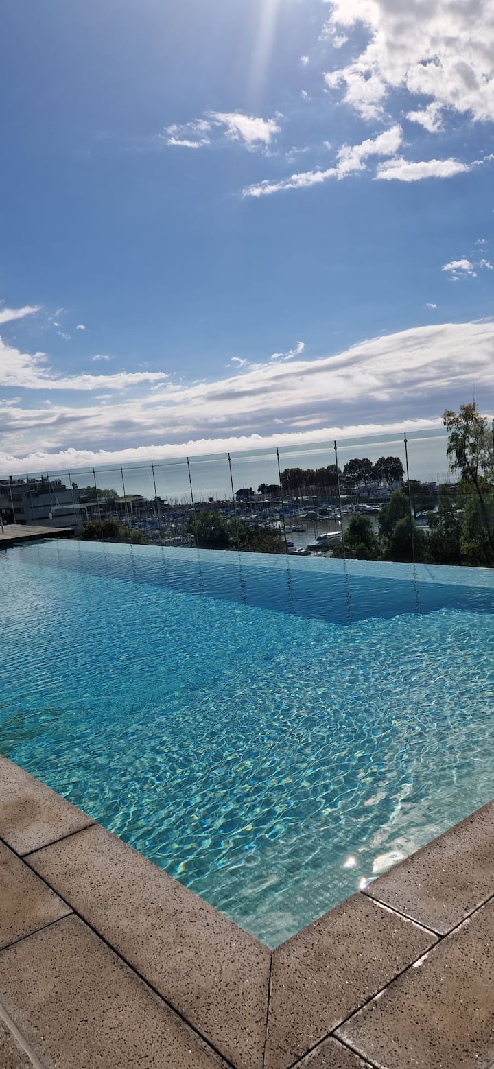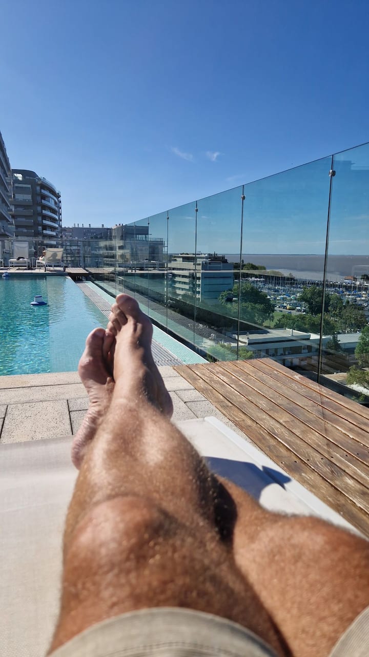 Apartamento de um ambiente com cozinha completa, cama de casal e sofá-cama. O condomínio tem piscina com vista para o rio, área de churrasco e pátio externo, além de espaço de trabalho e áreas verdes para caminhadas e ciclismo.
