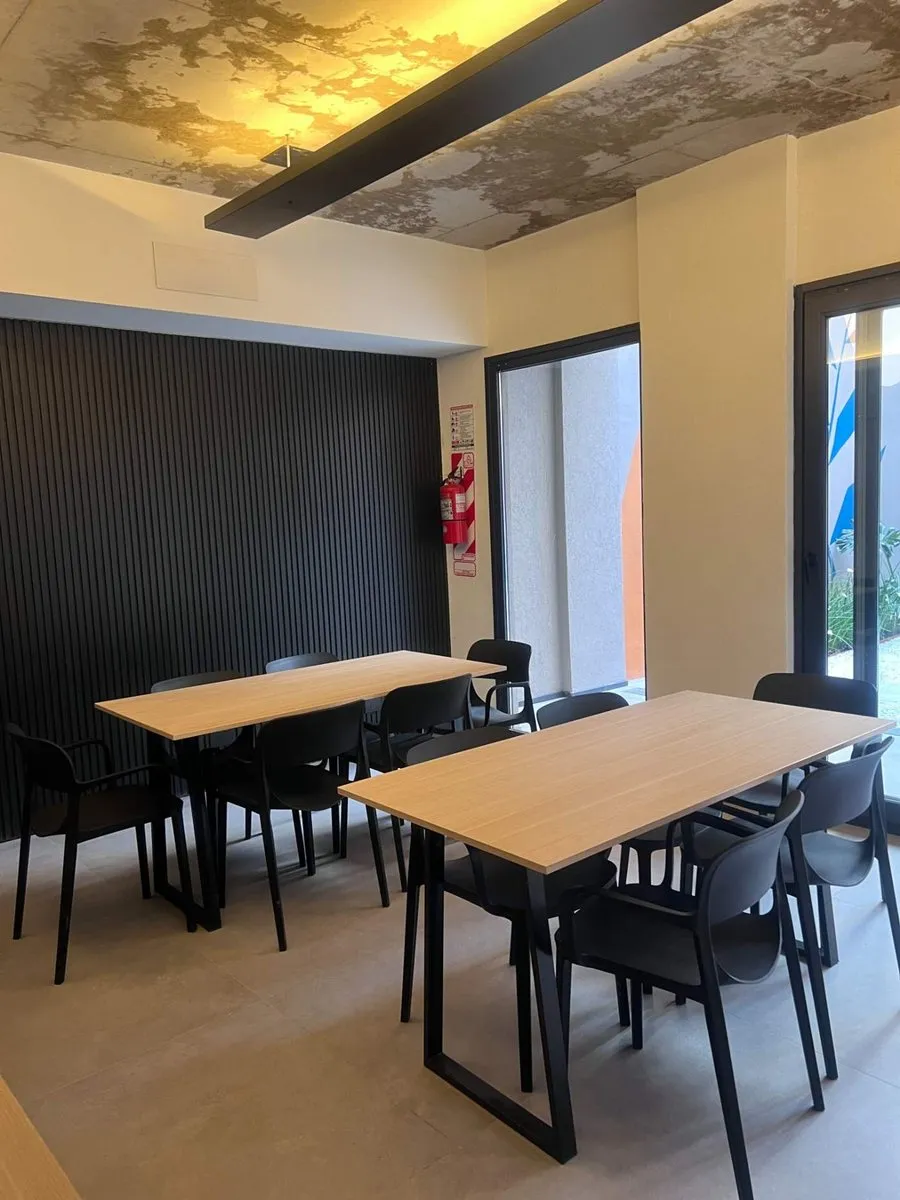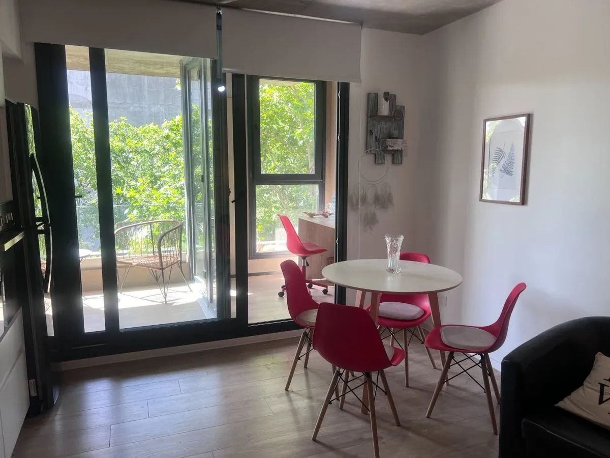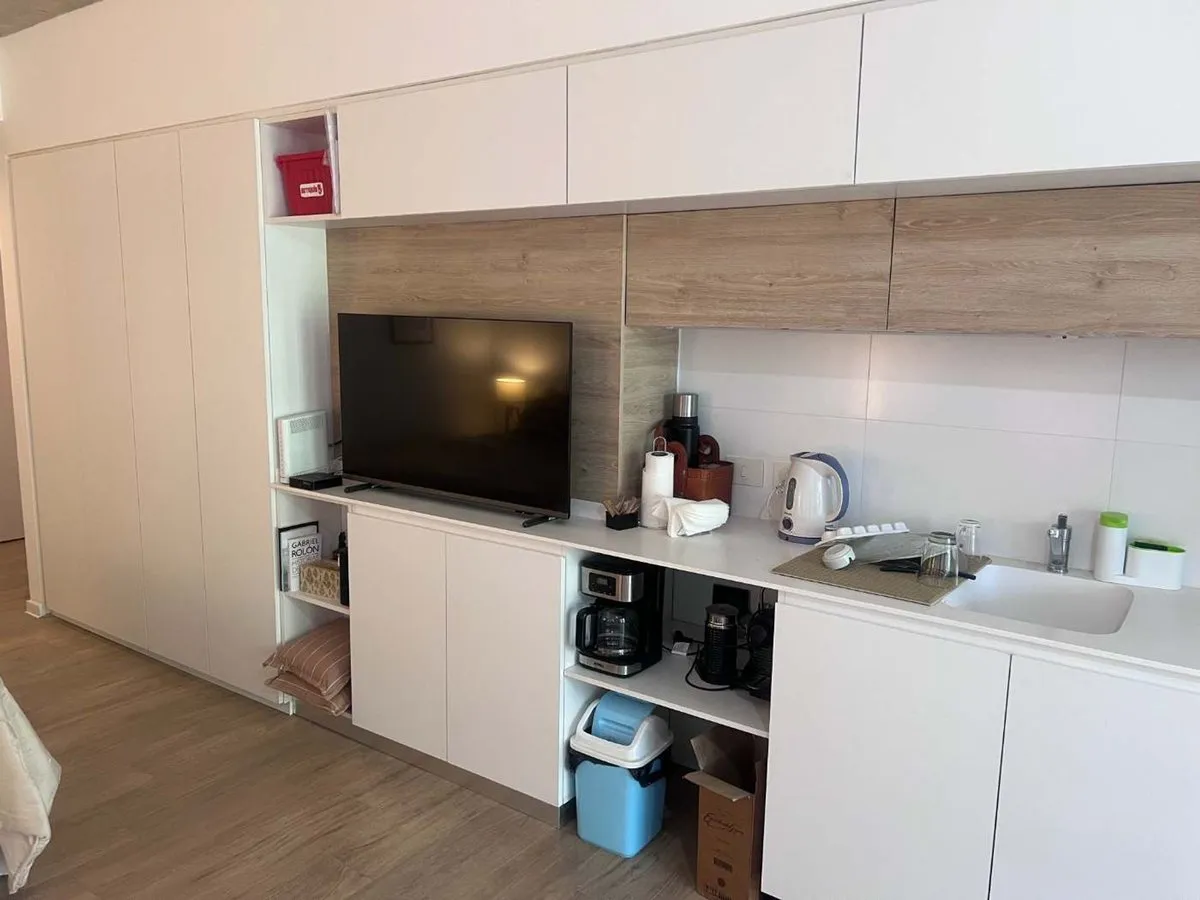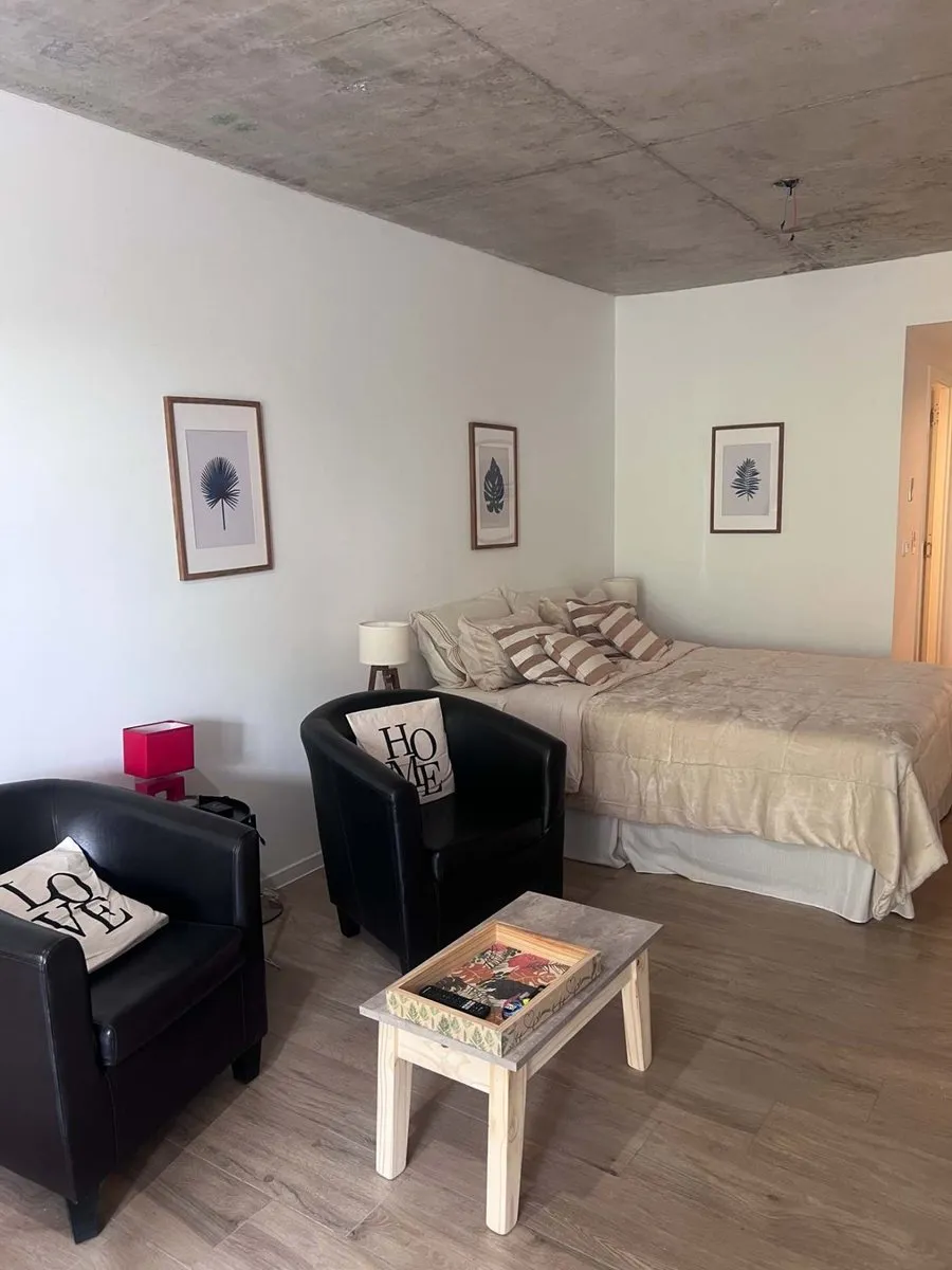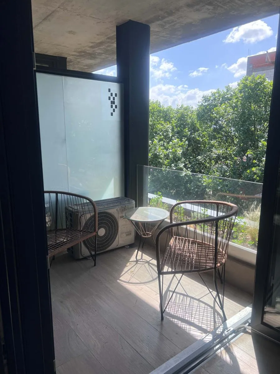 Apartamento tipo kitnet mobiliado em Villa Crespo, com varanda e espaço de home office independente. Tem água quente individual com calefão inteligente Ariston, aquecimento por piso radiante e ar-condicionado. A cozinha inclui cooktop vitrocerâmico, forno elétrico, e o ambiente conta com salão de usos múltiplos com área de churrasco, além de jardim e espaço para guardar bicicletas.
