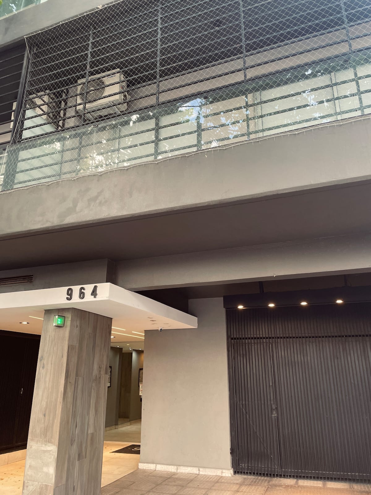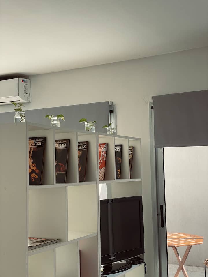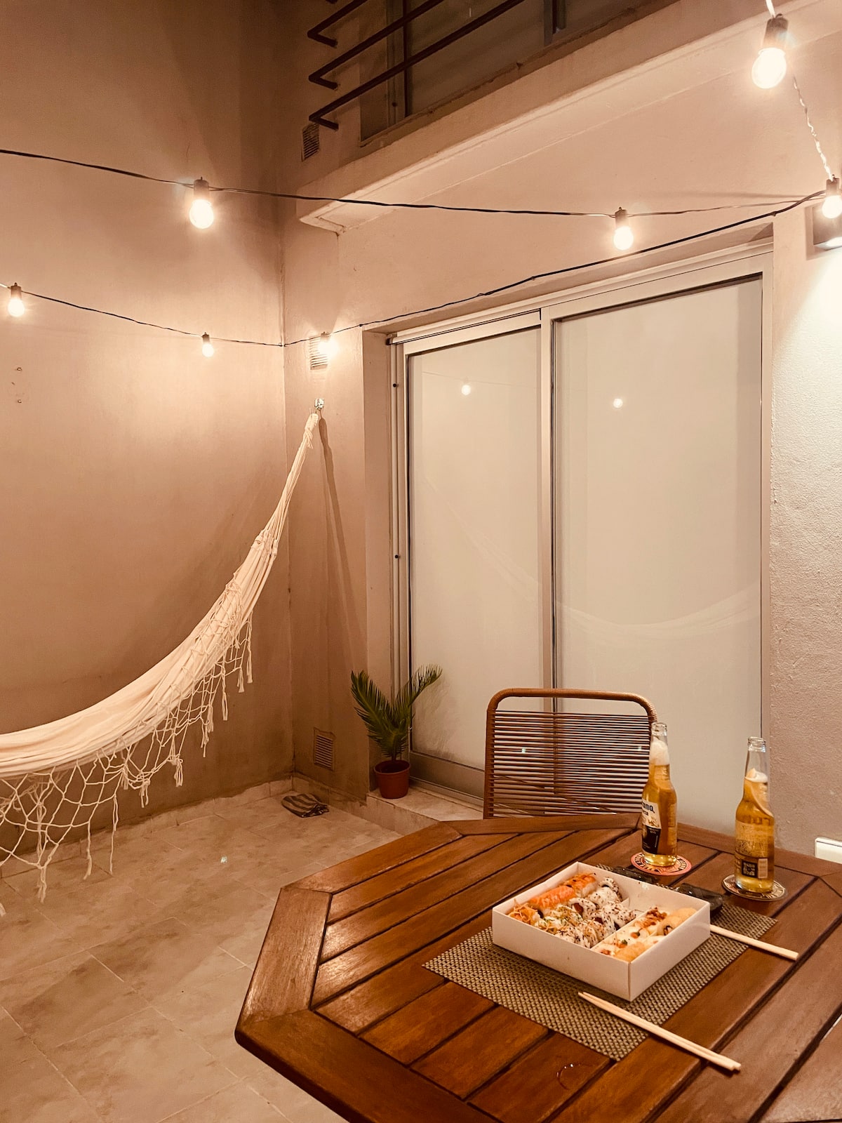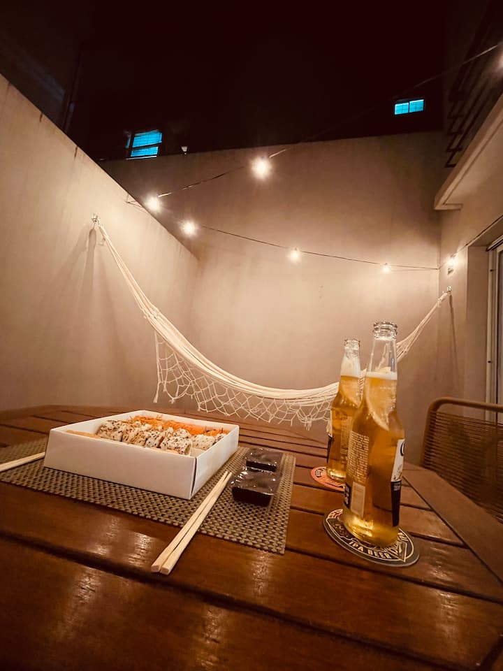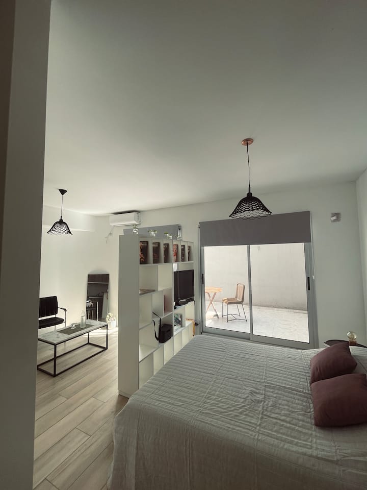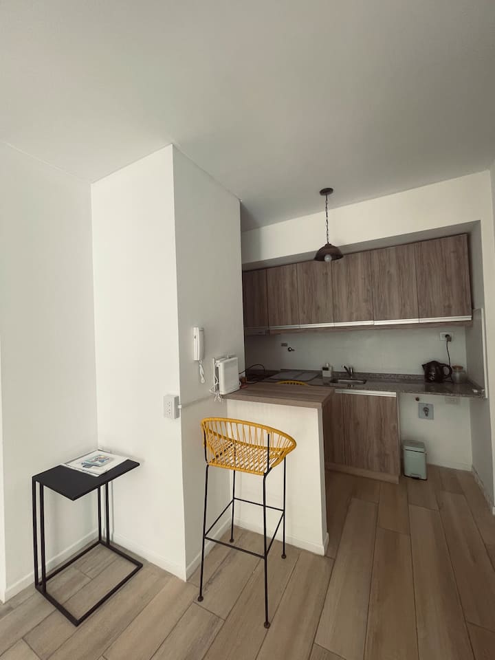 Kitnet em Villa Crespo, com pátio privativo. O imóvel é descrito como mobiliado e decorado, com espaço para plantas e área de biblioteca. O prédio tem lavanderia e SUM com área de churrasco. A localização informada é a proximidade da Movistar Arena.
