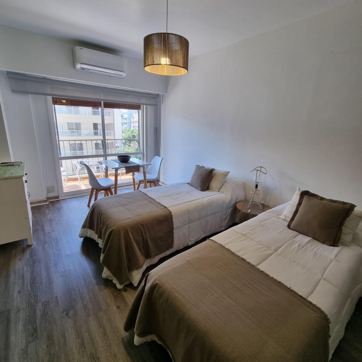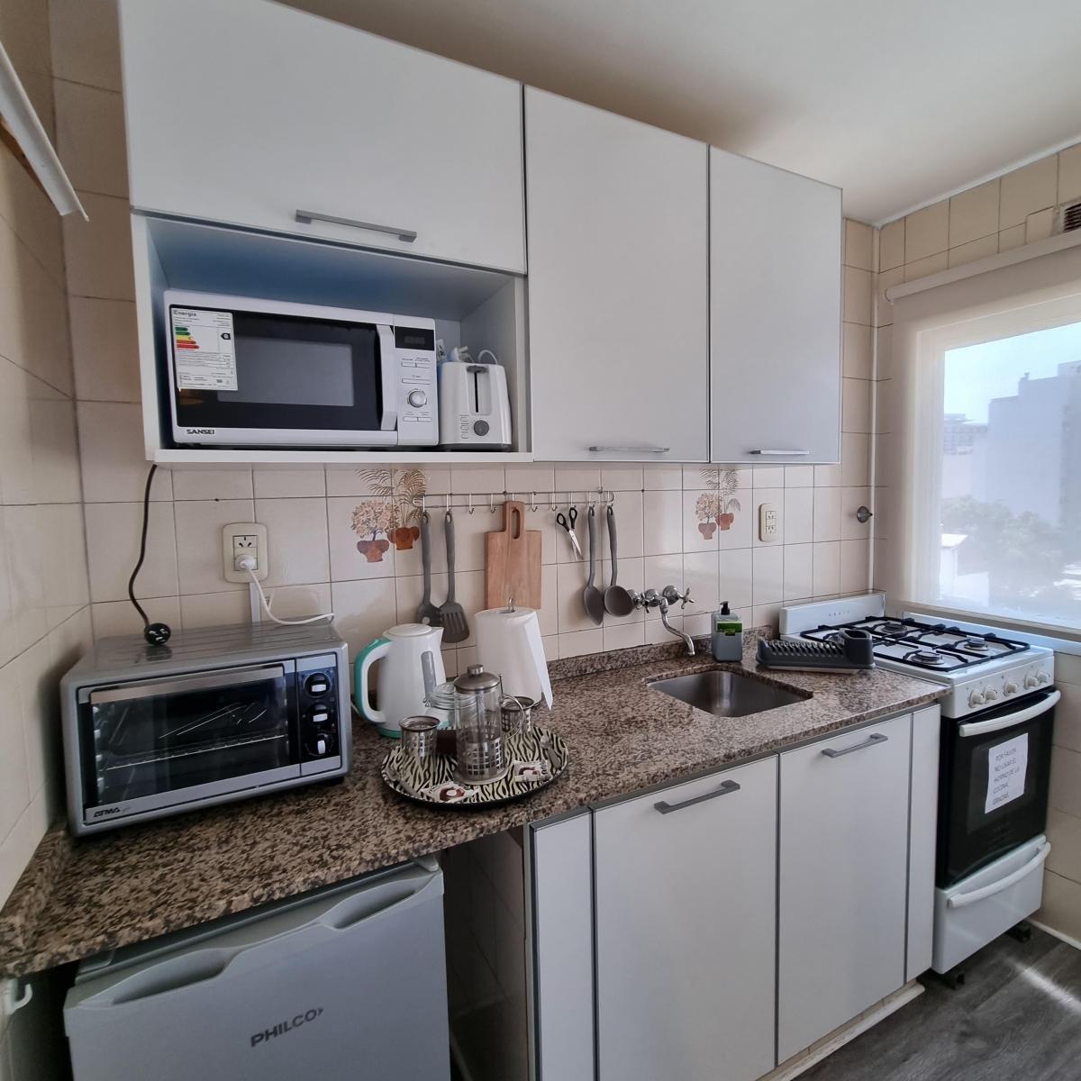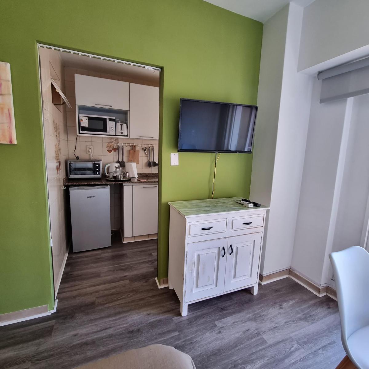 Kitnet mobiliada para aluguel temporário em Villa Crespo. O apartamento tem cozinha separada equipada com chaleira elétrica, micro-ondas, forno elétrico e geladeira, além de banheiro completo com ducha. Conta com 2 camas de 1 praça e varanda de fundos. O aluguel temporário é para até 3 meses e fica a 2 quadras do Movistar Arena.