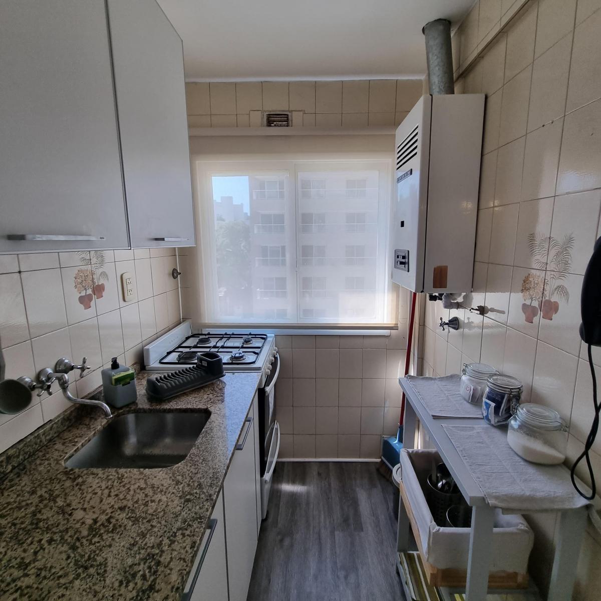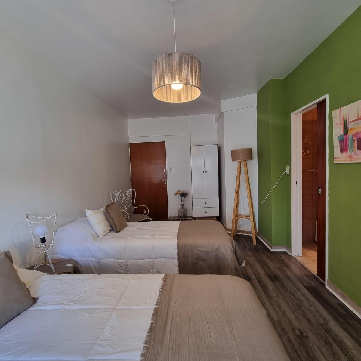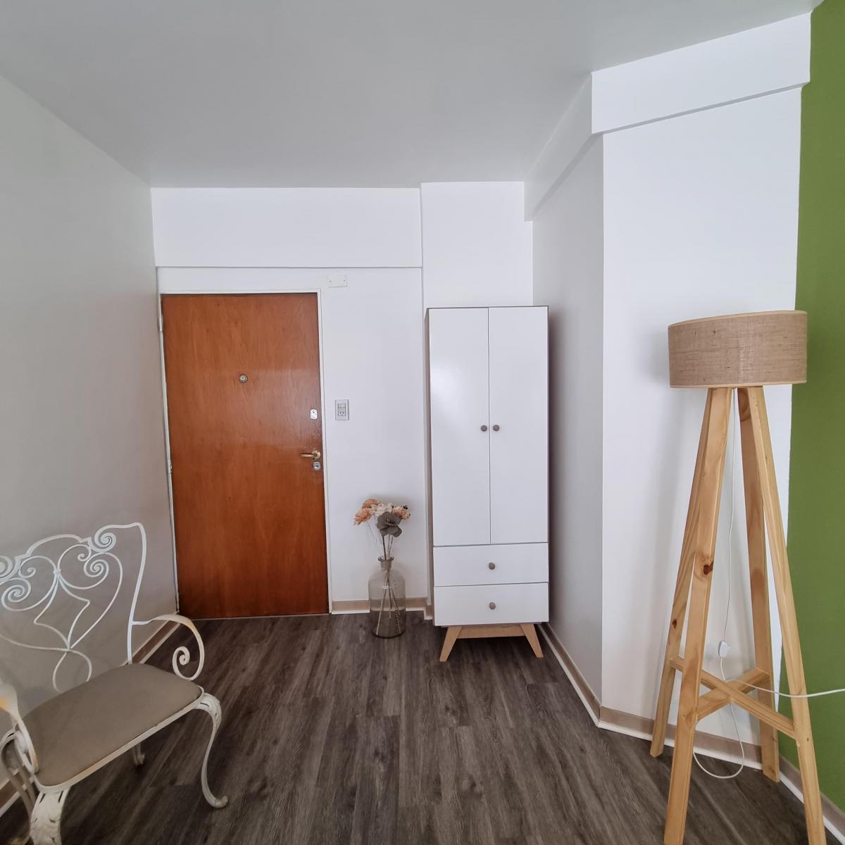 Kitnet mobiliada para aluguel temporário em Villa Crespo. O apartamento tem cozinha separada equipada com chaleira elétrica, micro-ondas, forno elétrico e geladeira, além de banheiro completo com ducha. Conta com 2 camas de 1 praça e varanda de fundos. O aluguel temporário é para até 3 meses e fica a 2 quadras do Movistar Arena.