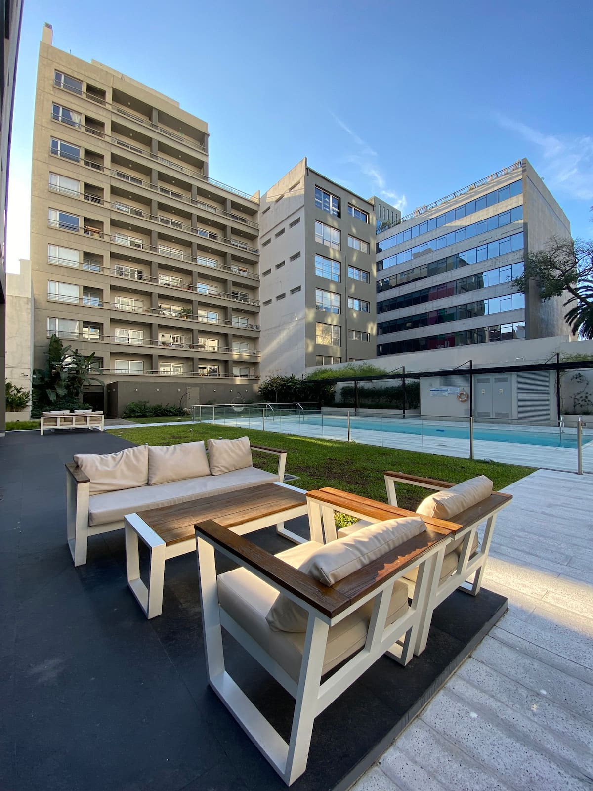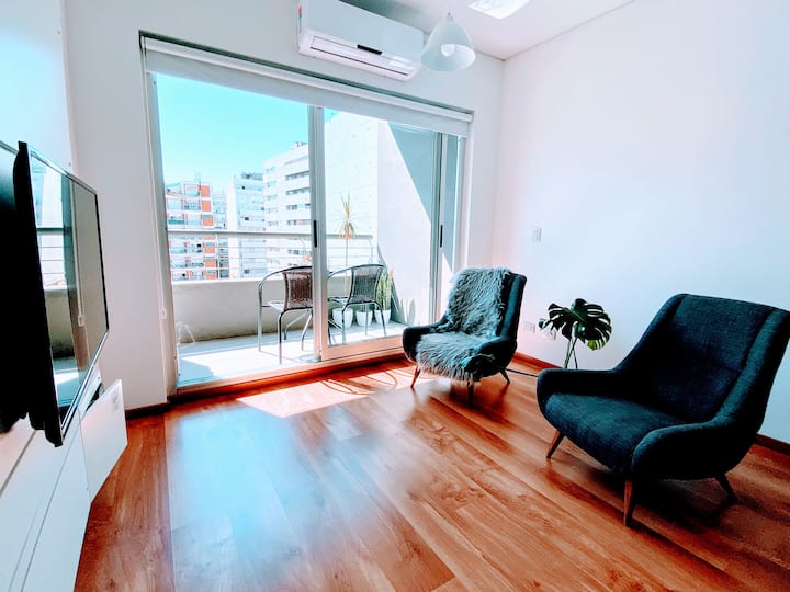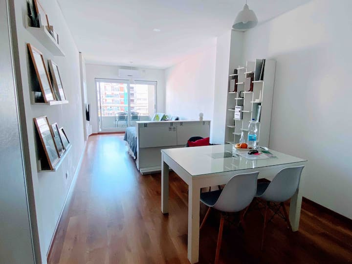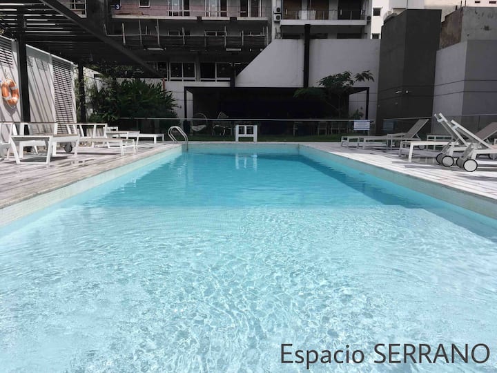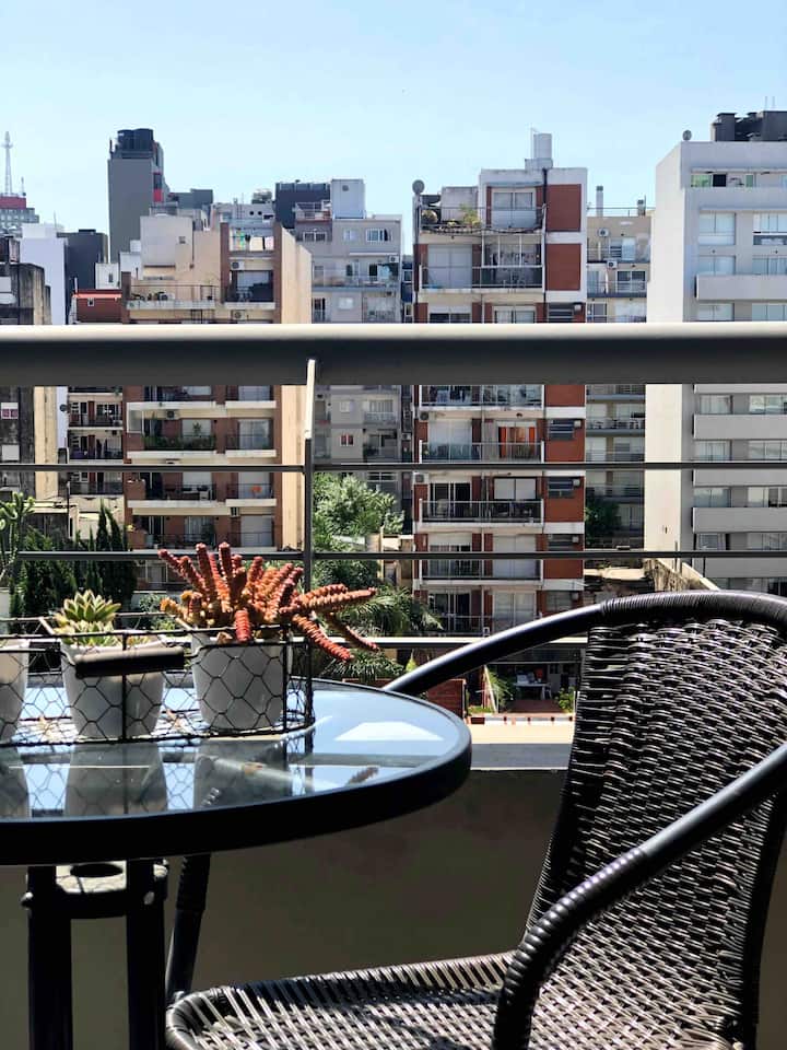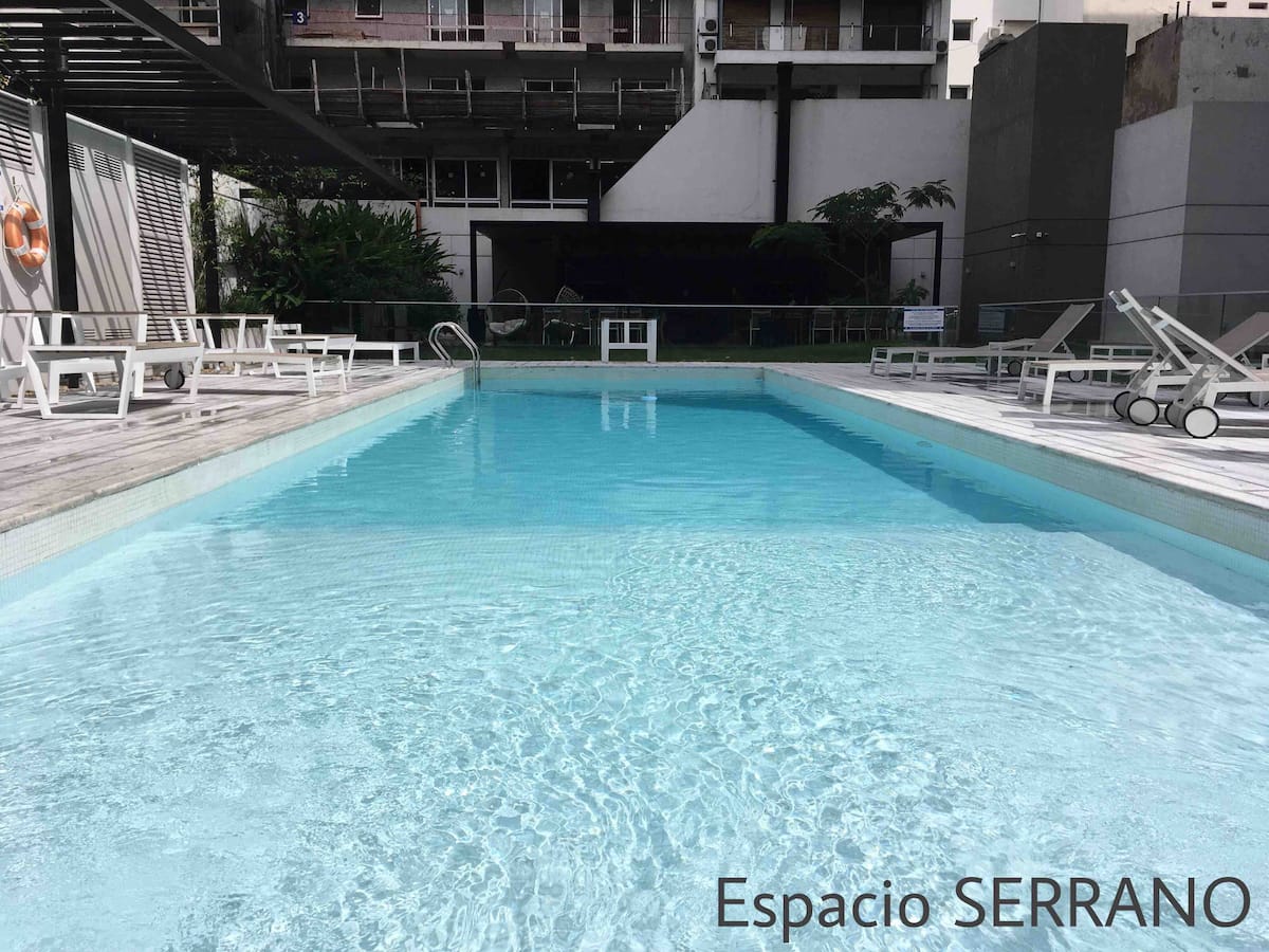 Apartamento kitnet de 34 m² com varanda de frente para a rua e vista aberta, em Villa Crespo. Wi-Fi com fibra óptica. O equipamento inclui forno elétrico, fogão, cafeteira, torradeira, chaleira elétrica, utensílios e louças; também ar-condicionado com sistema inteligente, secador de cabelo, ferro de passar roupa, TV smart de 43", TV a cabo, sistema de som e cofre pequeno. O condomínio dispõe de segurança 24/7, piscina aquecida (sazonal), academia e sala de jogos; o acesso inclui áreas comuns com