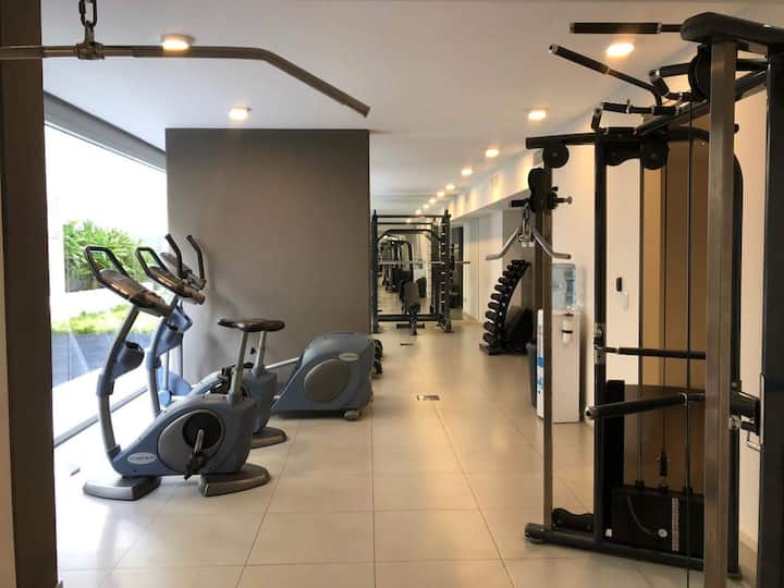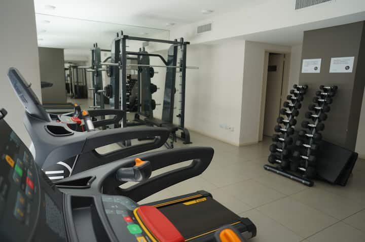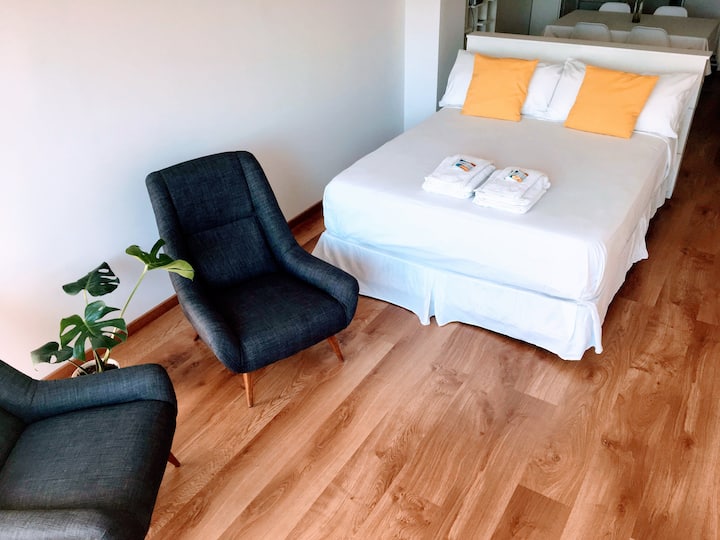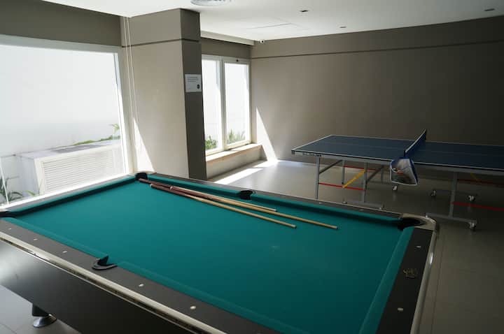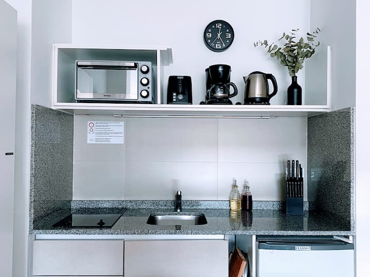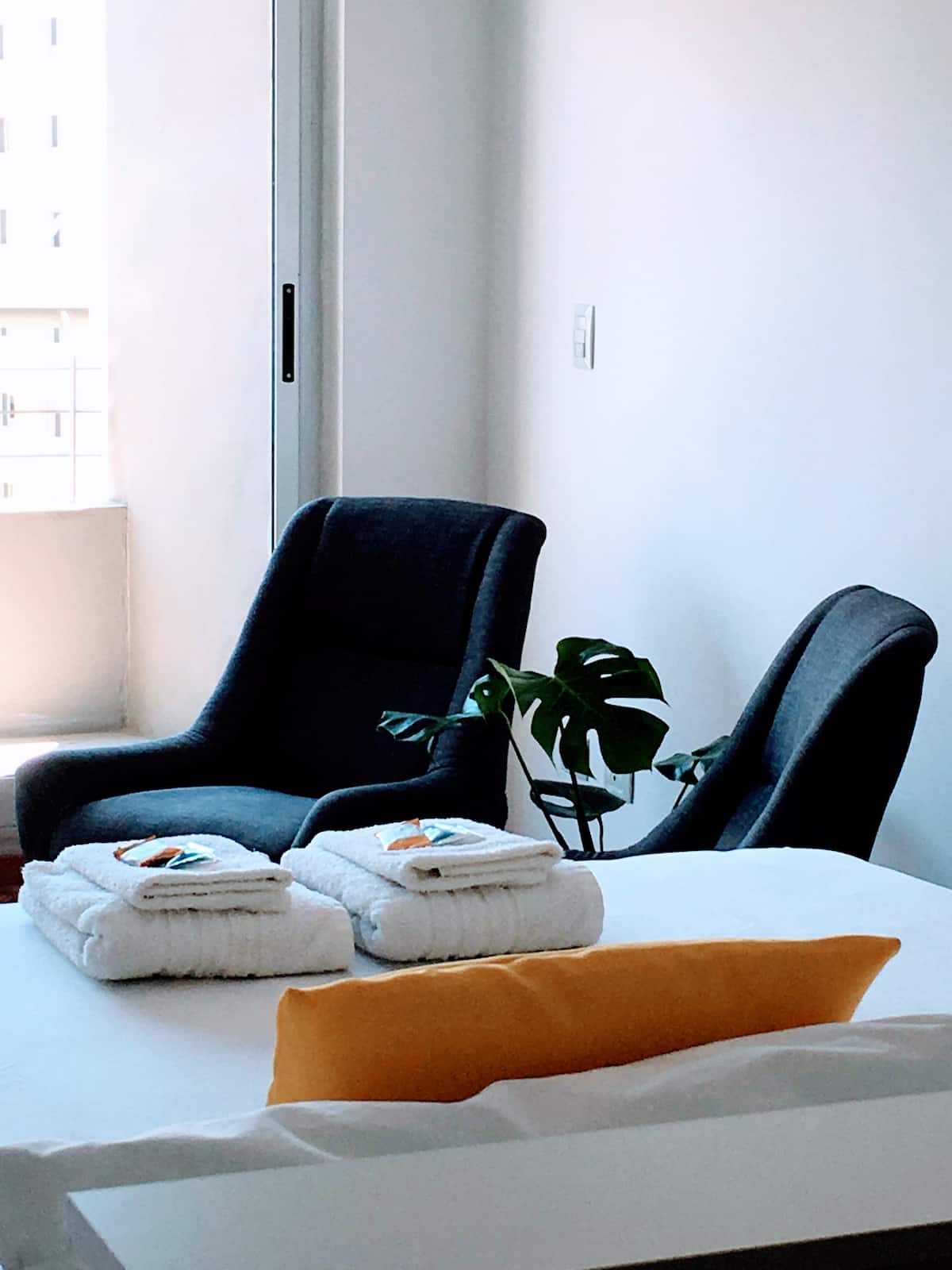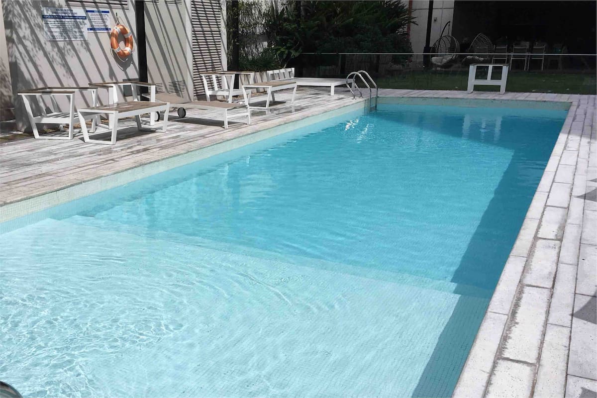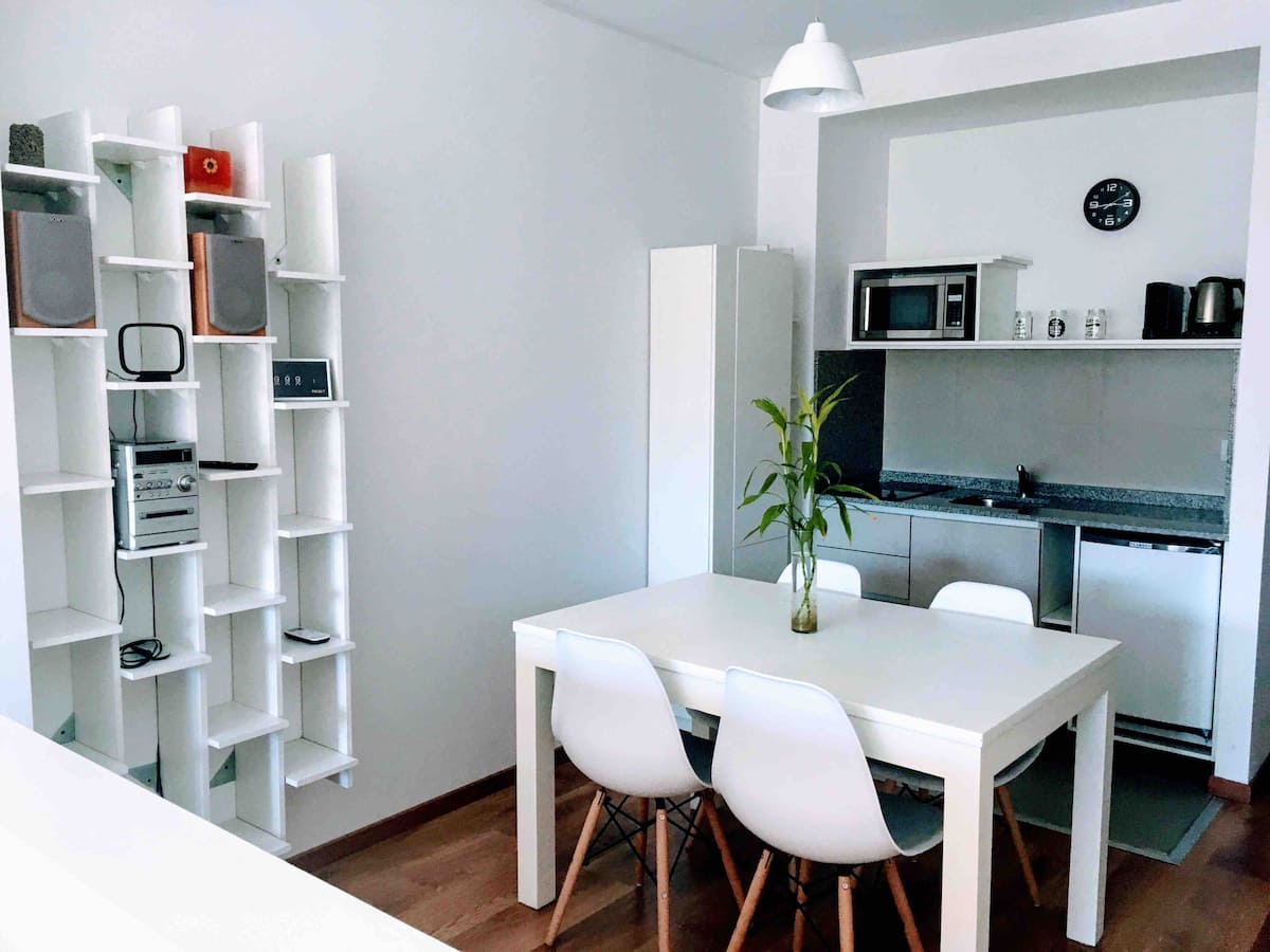 Apartamento kitnet de 34 m² com varanda de frente para a rua e vista aberta, em Villa Crespo. Wi-Fi com fibra óptica. O equipamento inclui forno elétrico, fogão, cafeteira, torradeira, chaleira elétrica, utensílios e louças; também ar-condicionado com sistema inteligente, secador de cabelo, ferro de passar roupa, TV smart de 43", TV a cabo, sistema de som e cofre pequeno. O condomínio dispõe de segurança 24/7, piscina aquecida (sazonal), academia e sala de jogos; o acesso inclui áreas comuns com