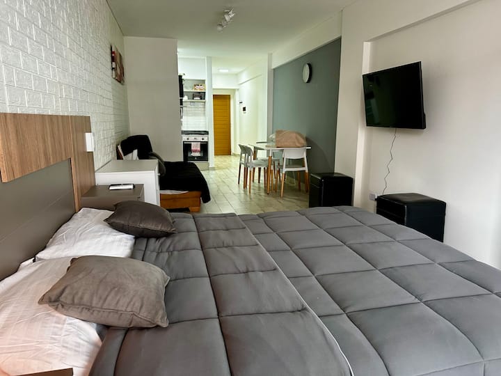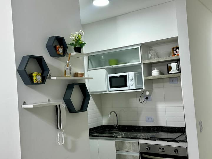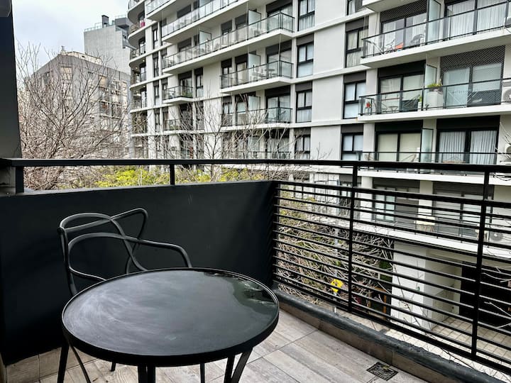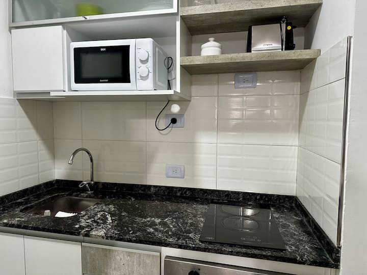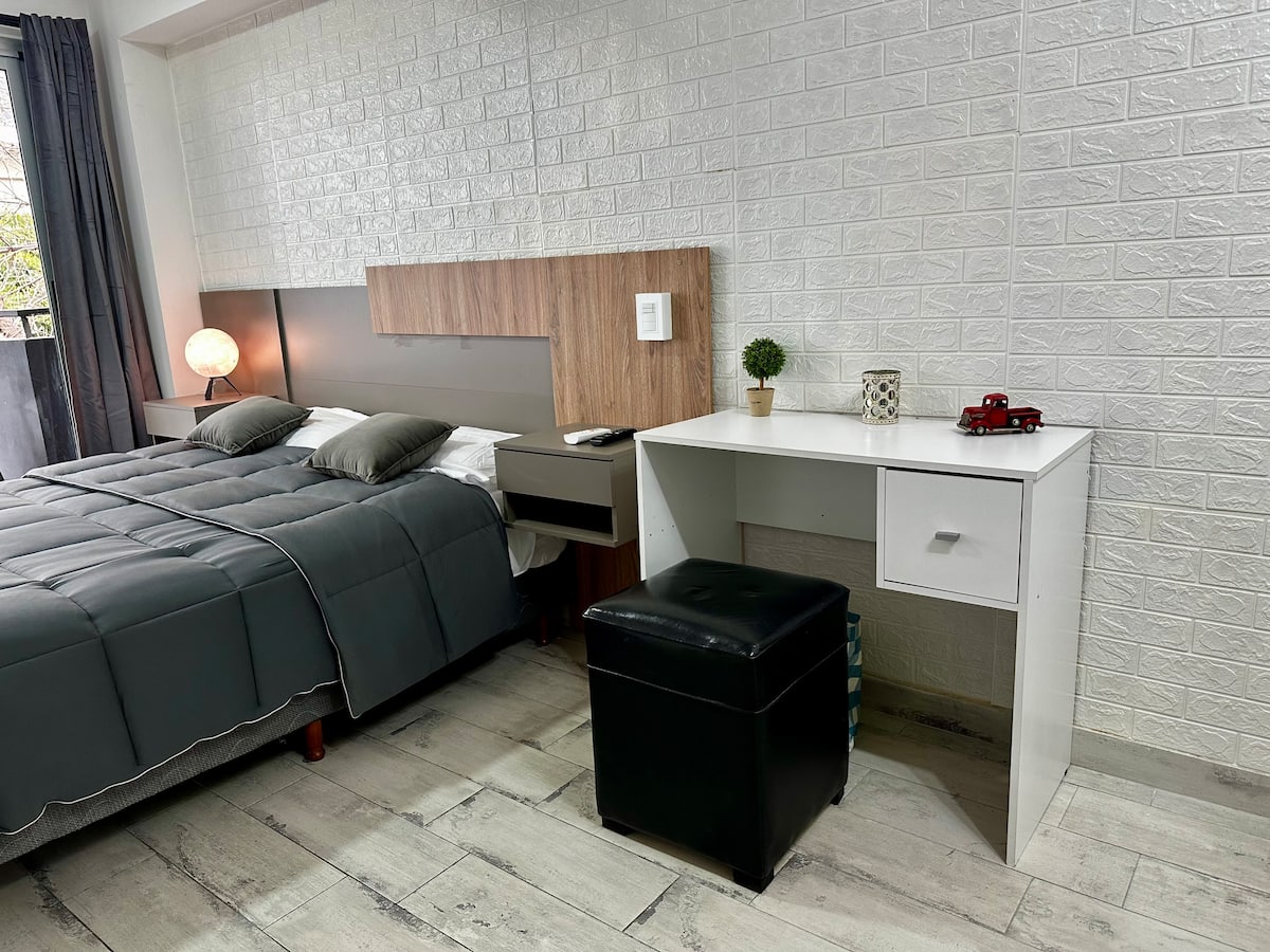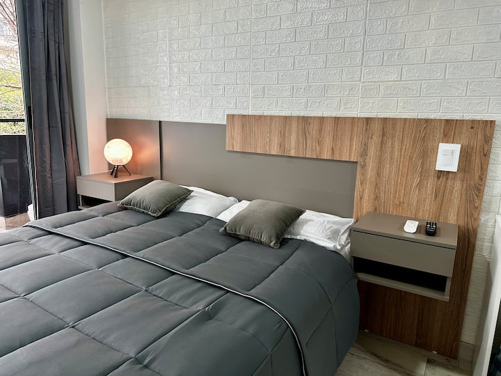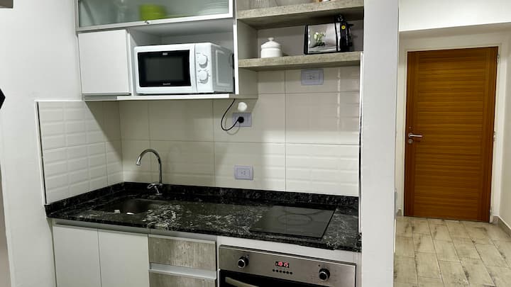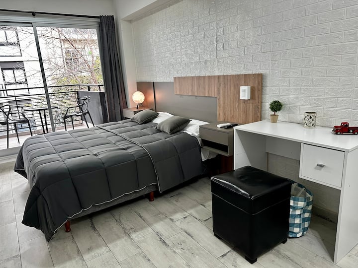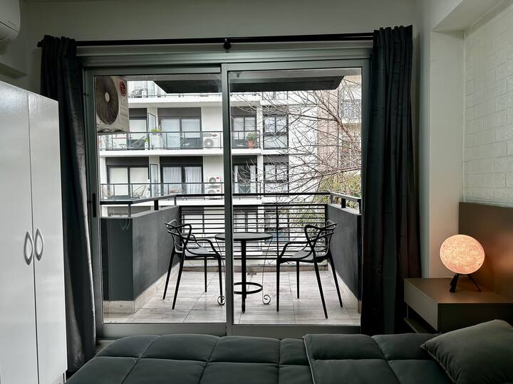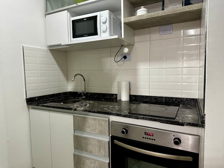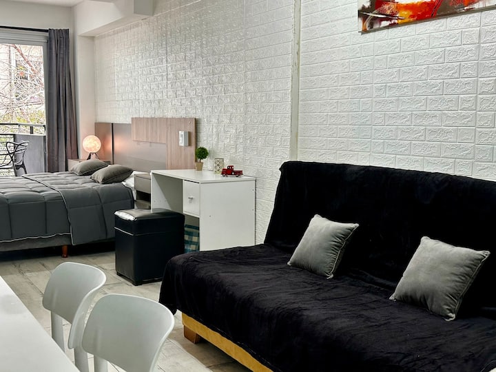 Kitnet em Villa Crespo para até 3 pessoas, em prédio com piscina, a poucos quarteirões do Hospital Italiano e do Sanatorio Güemes. Apartamento mobiliado com cama de casal e sofá-cama, cozinha completa, ar-condicionado e WiFi.