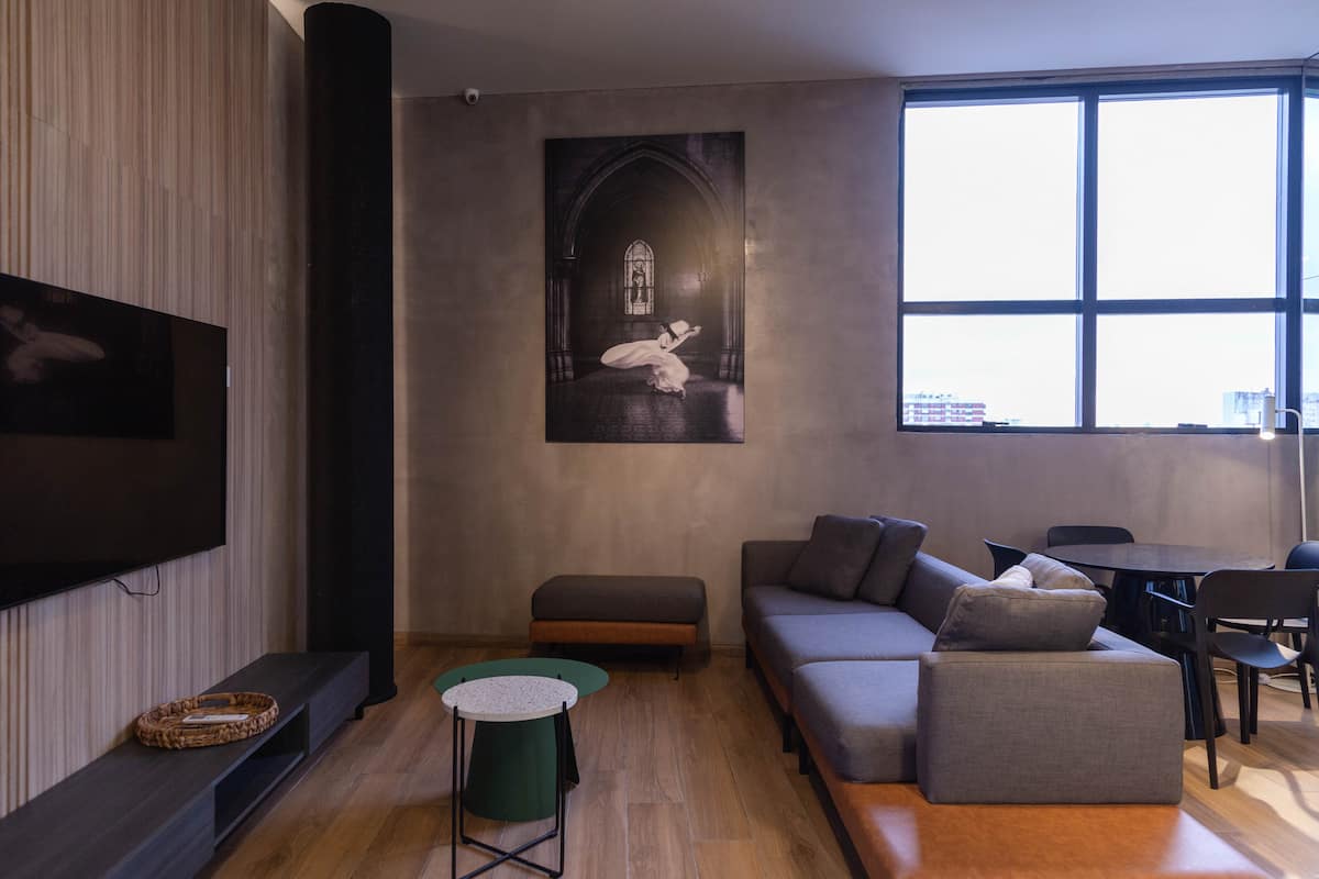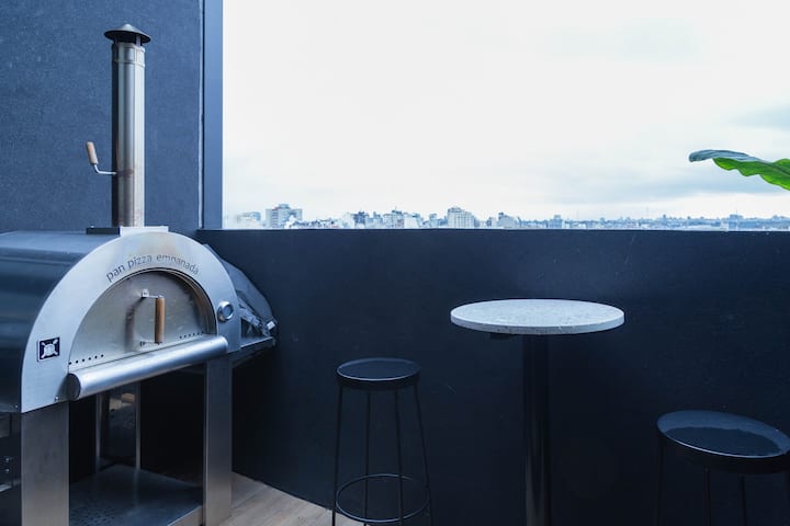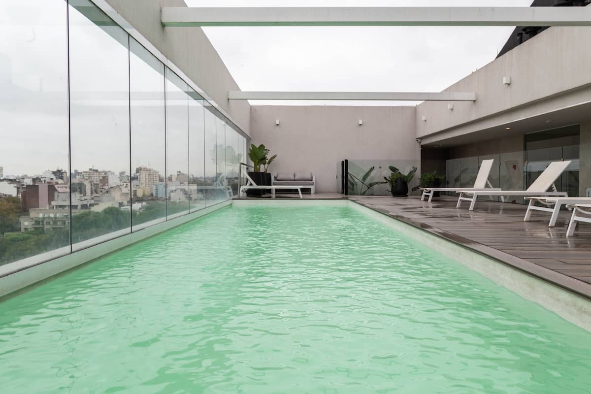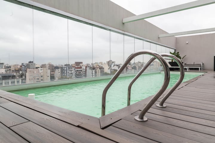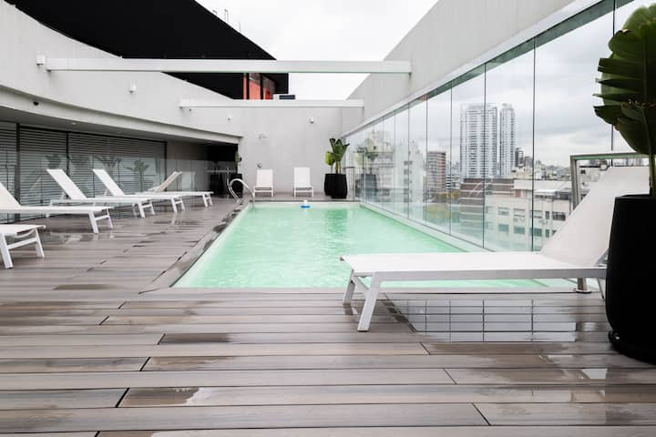 Kitnet em Villa Crespo, com piscina, academia equipada, áreas de coworking e lavanderia no prédio. A descrição não informa metragem, andar ou estado de mobiliário.