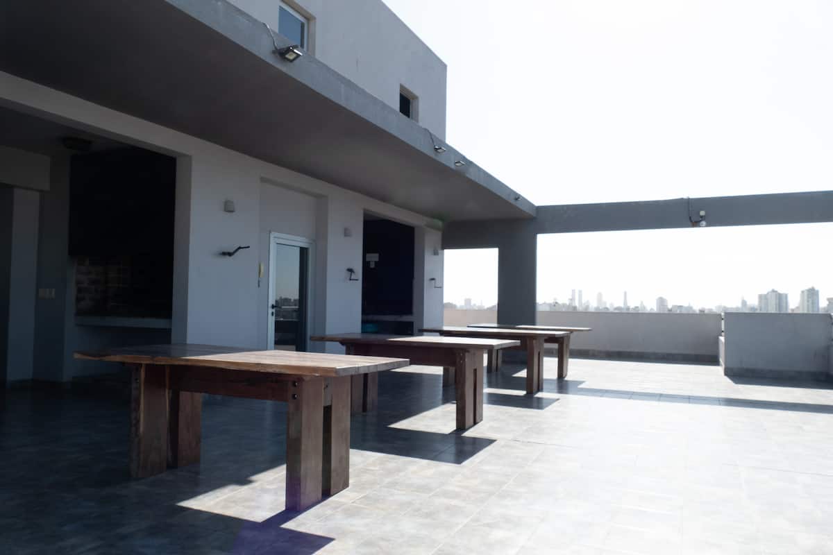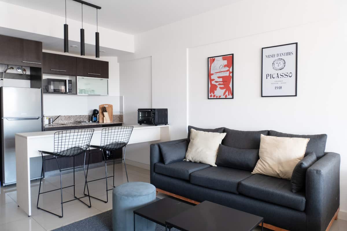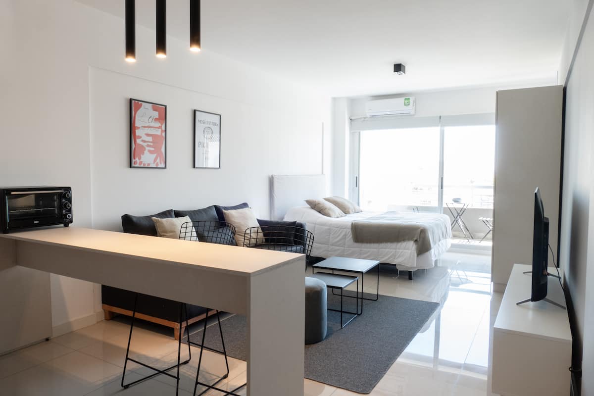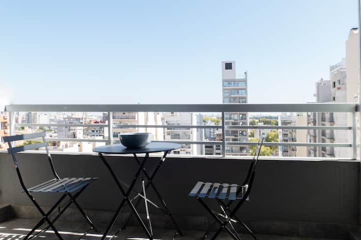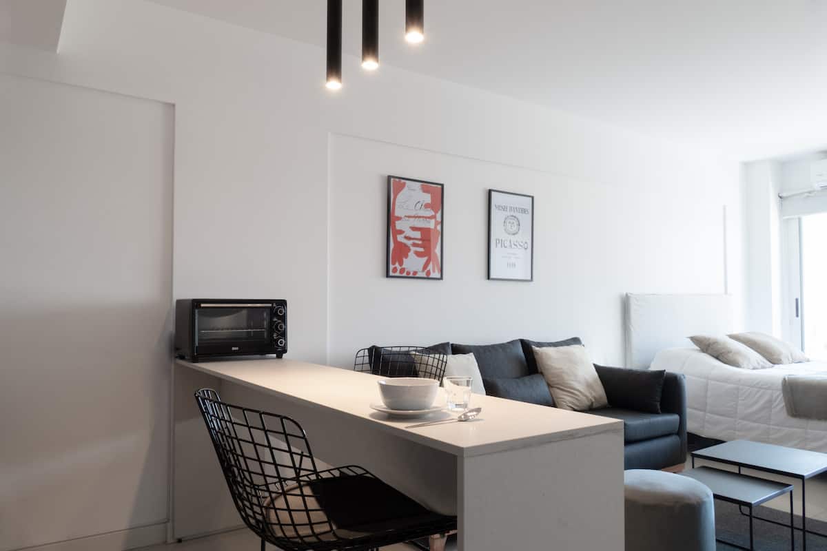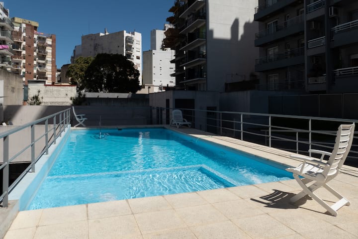 Kitnet em Villa Crespo, com 1 ambiente e mobiliada. O apartamento tem área de refeições e varanda. O prédio oferece piscina, academia e lavanderia.