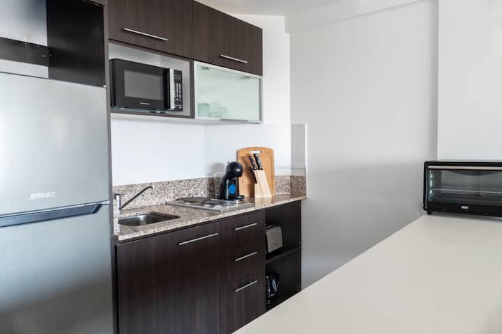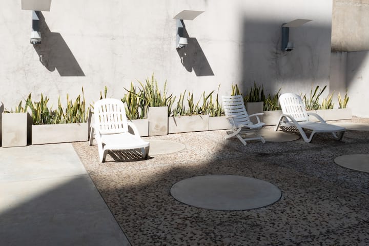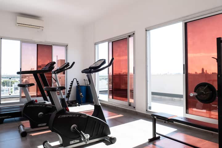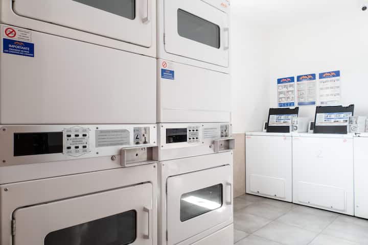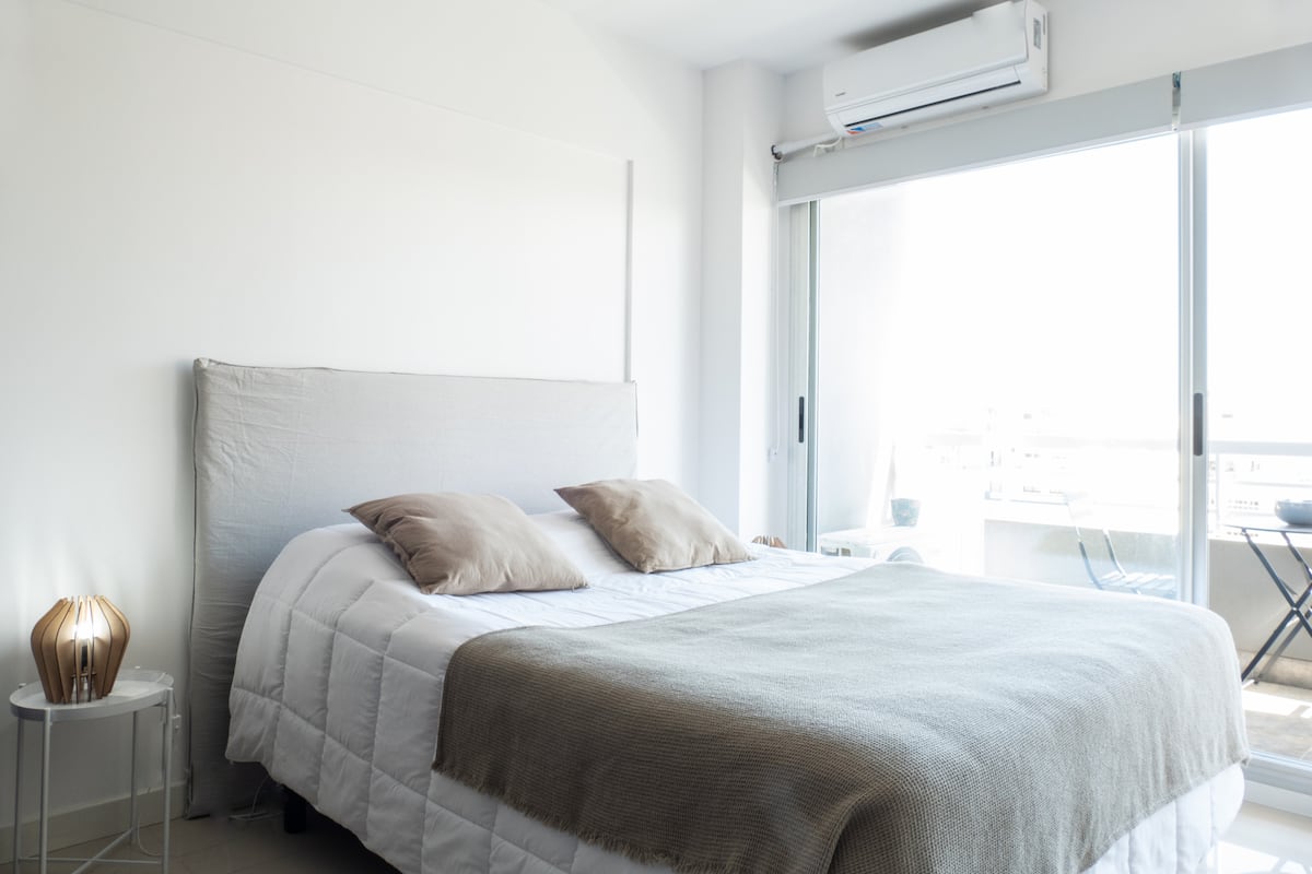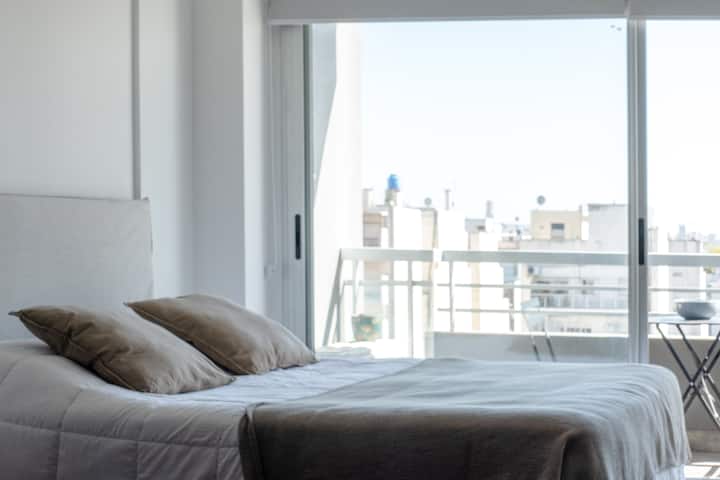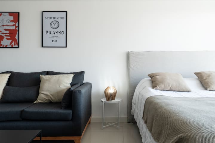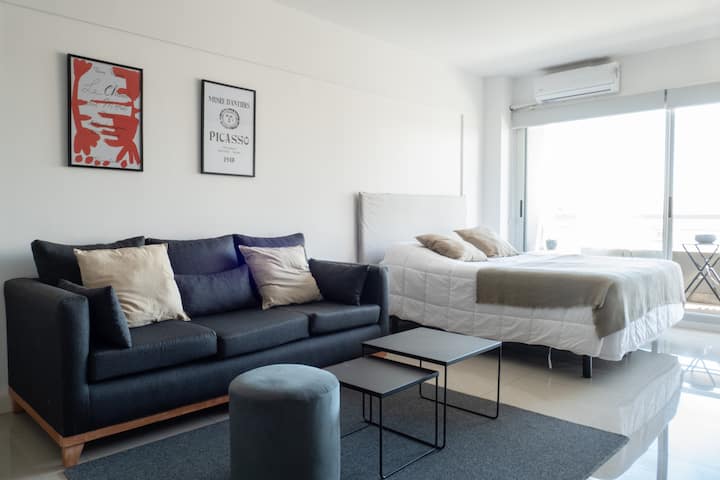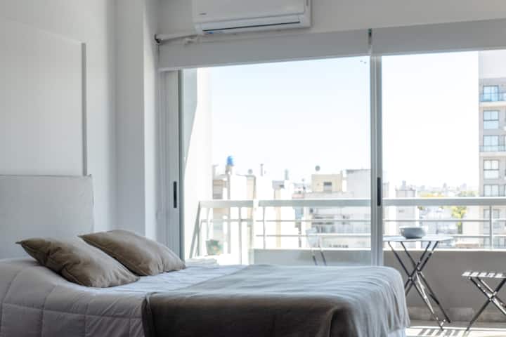 Kitnet em Villa Crespo, com 1 ambiente e mobiliada. O apartamento tem área de refeições e varanda. O prédio oferece piscina, academia e lavanderia.