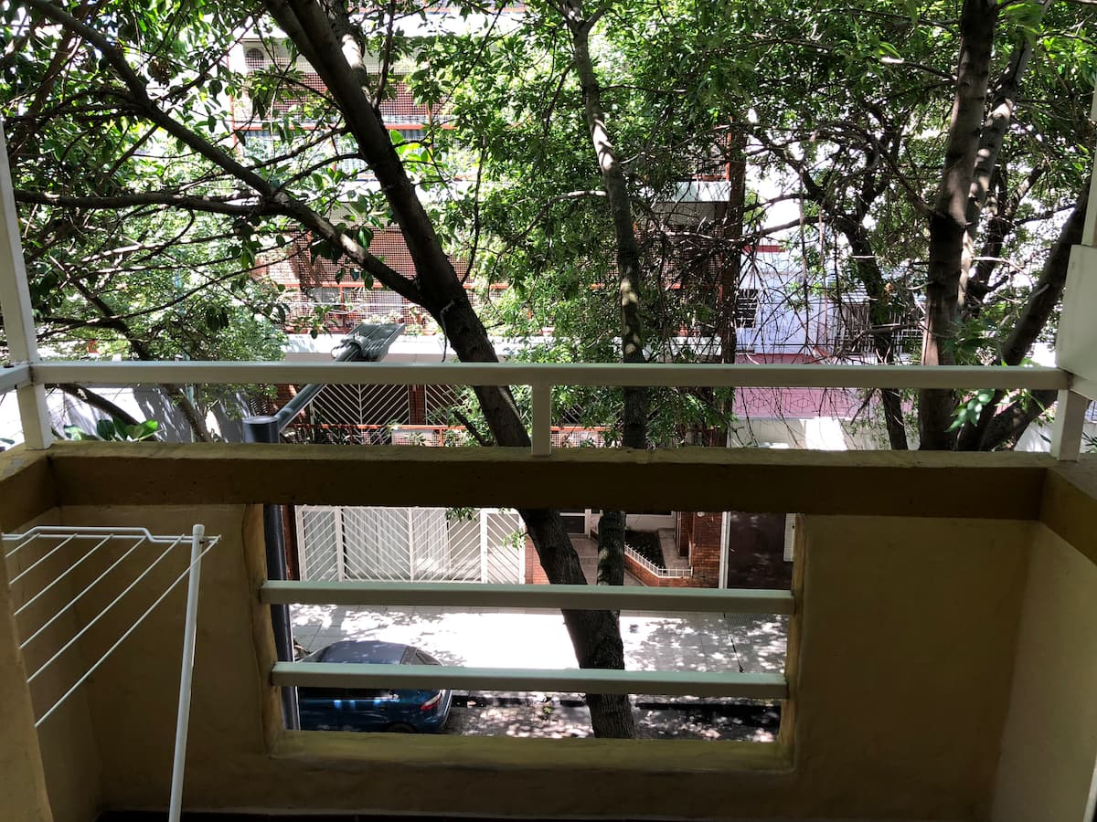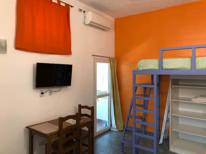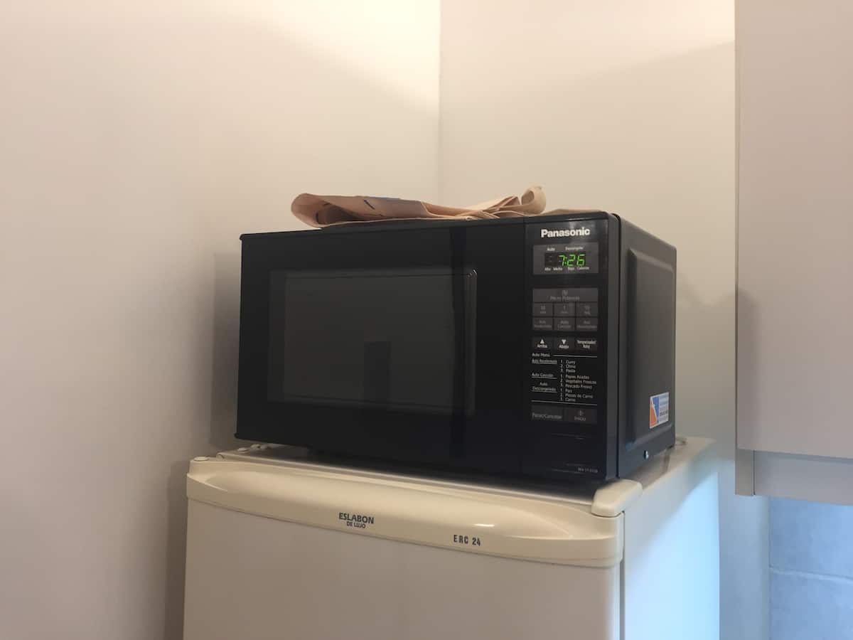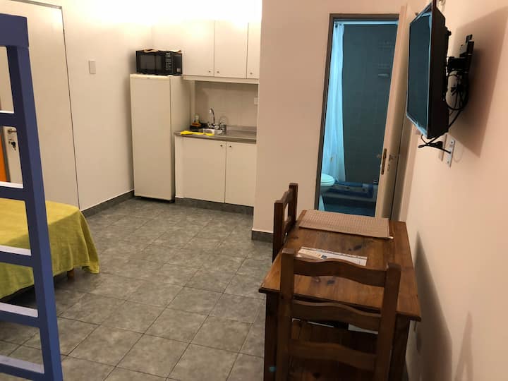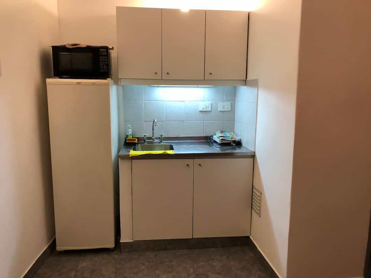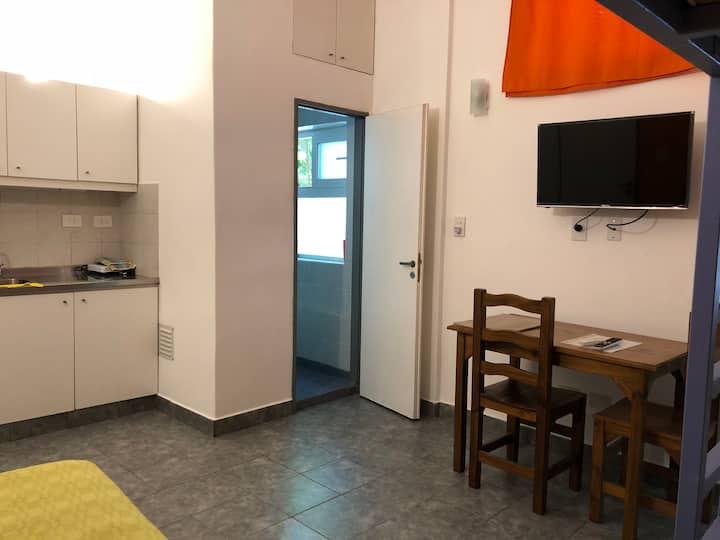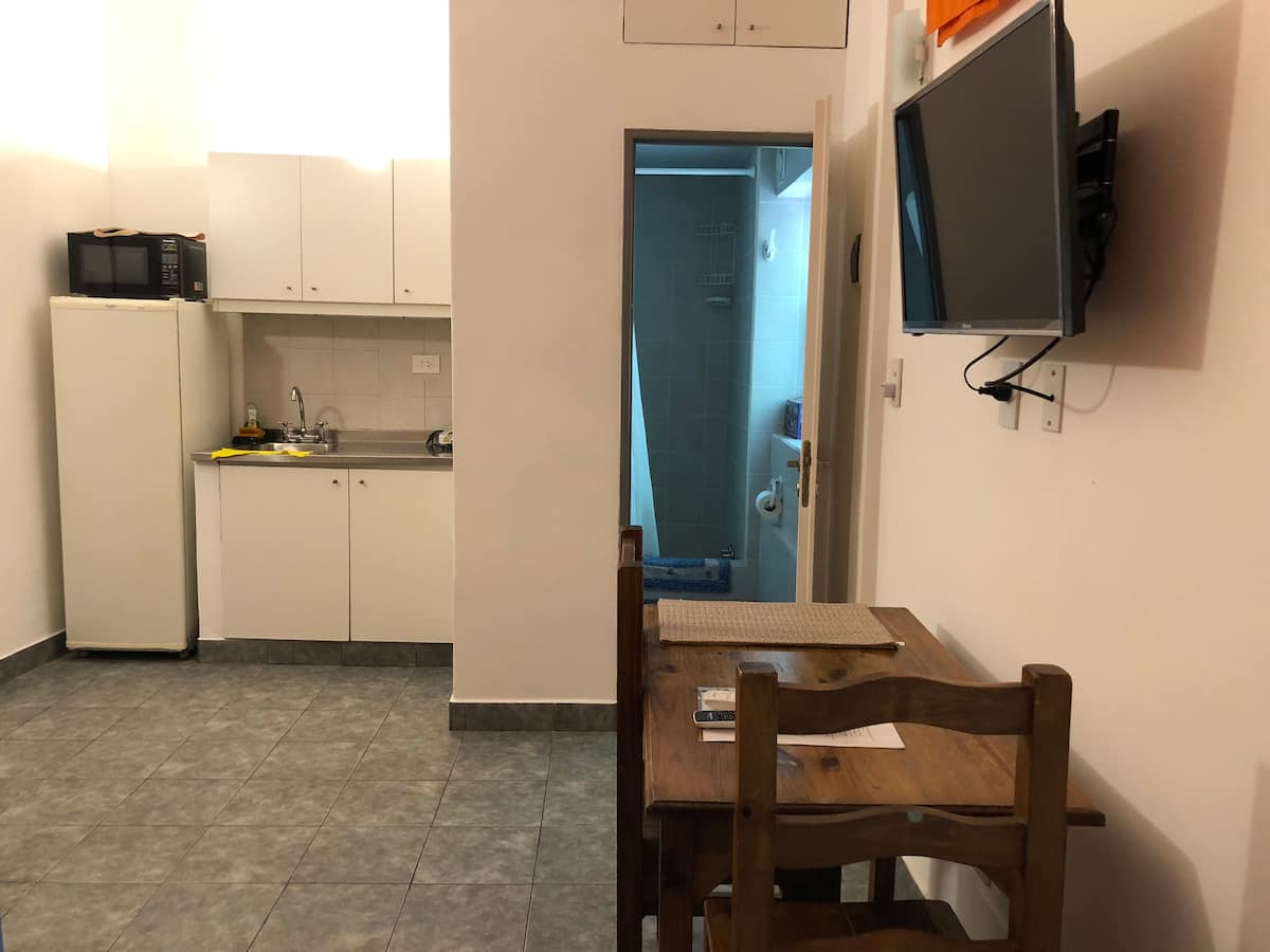 Kitnet em Villa Crespo, no 2º andar, de frente para a rua. Loft mobiliado em estilo moderno, com porta de vidro duplo e varanda privativa. Possui cozinha com fogão elétrico de 1 queimador, chaleira elétrica, micro-ondas e geladeira; banheiro privativo; TV LED de 32", Wi-Fi e TV a cabo; ar-condicionado e aquecimento. Acesso comum à área de terraço no 3º andar, com tanque de lavar roupa e varal. A estadia máxima é de 100 dias e pode ser estendida. Não é oferecido como moradia permanente.