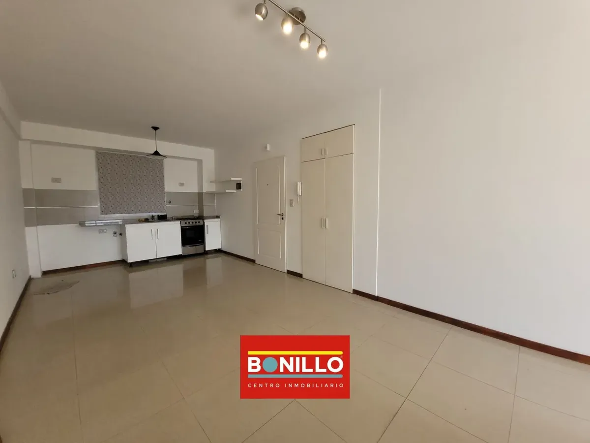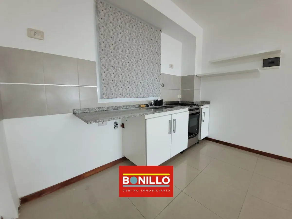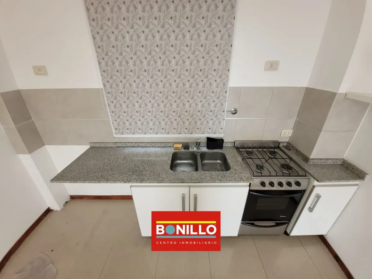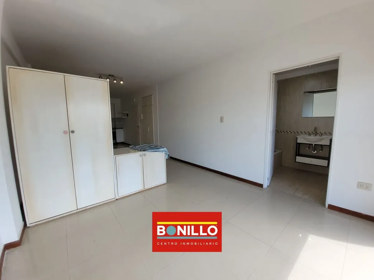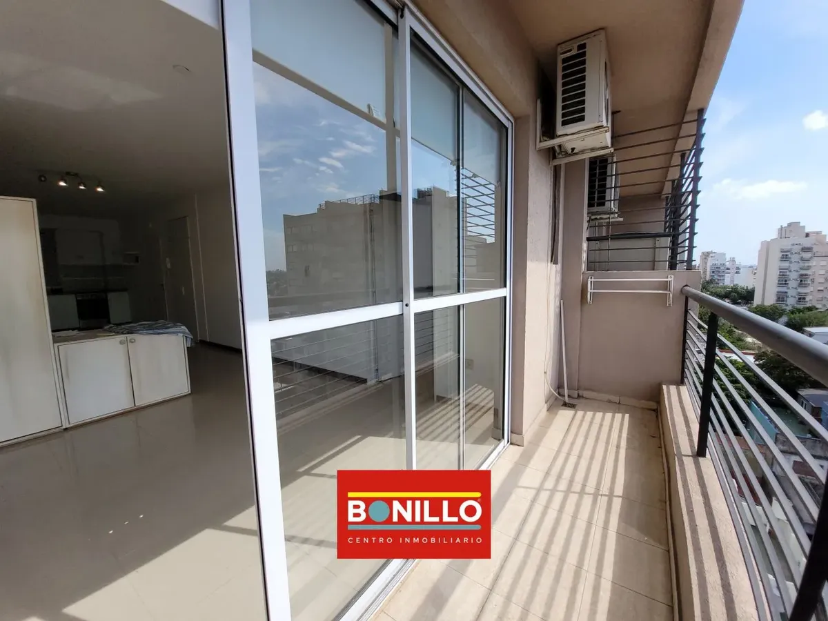 Kitnet (1 ambiente) na parte de fundos (contrafrente), com varanda, para locação em Villa del Parque. Possui aparelho de cozinha com gás natural, conexão para máquina de lavar roupa de carga frontal e pequeno armário. Banheiro completo com janela voltada para a varanda e janela na cozinha, permitindo ventilação cruzada. Contrato de 2 anos com reajuste trimestral pelo IPC. Não aceita animais.